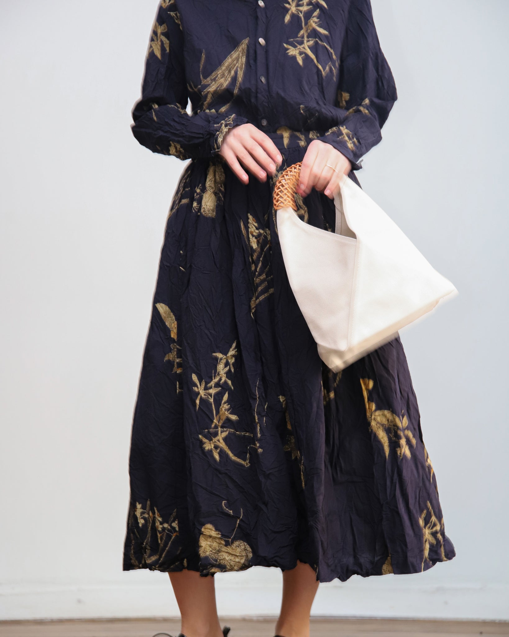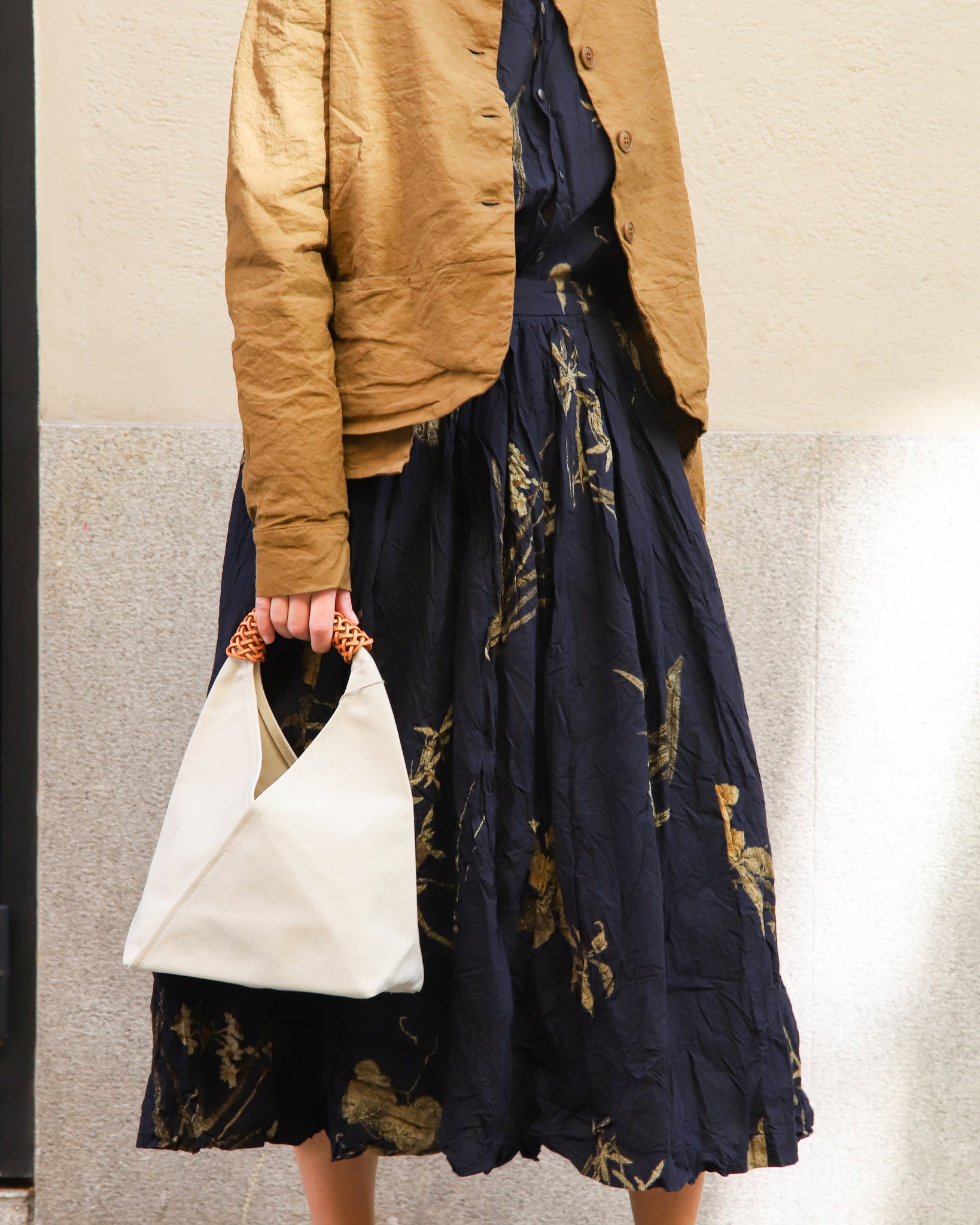 Bolso de loneta color crudo con asa en piel troquelada. Se puede regular el largo, cierre interior con corchete.