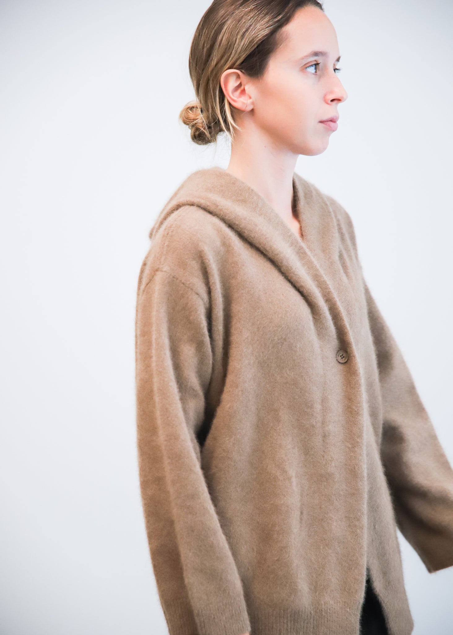 Chaqueta con capucha de lana extra suave. Escote en V y cierre con un botón. Bolsillos laterales.