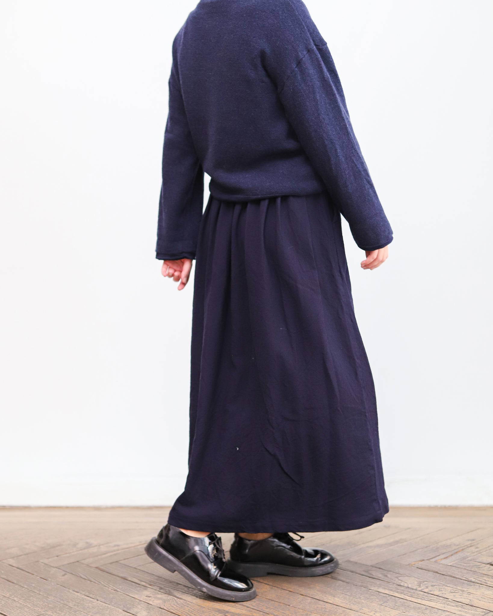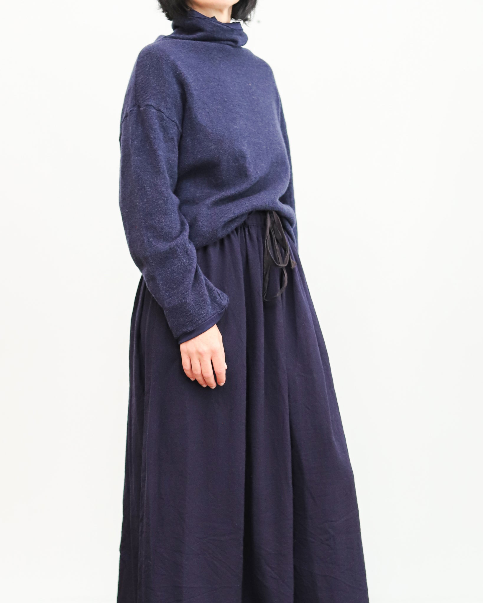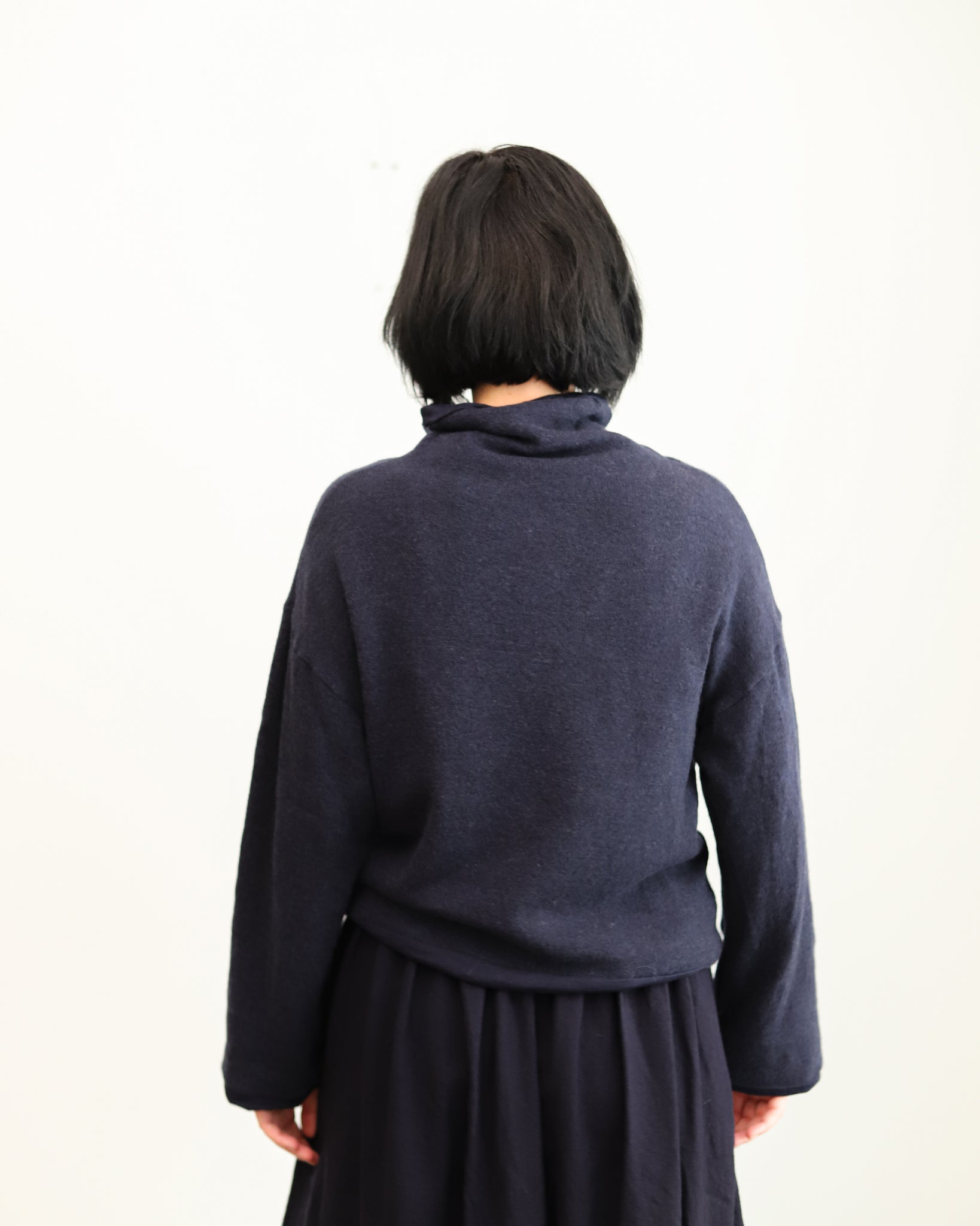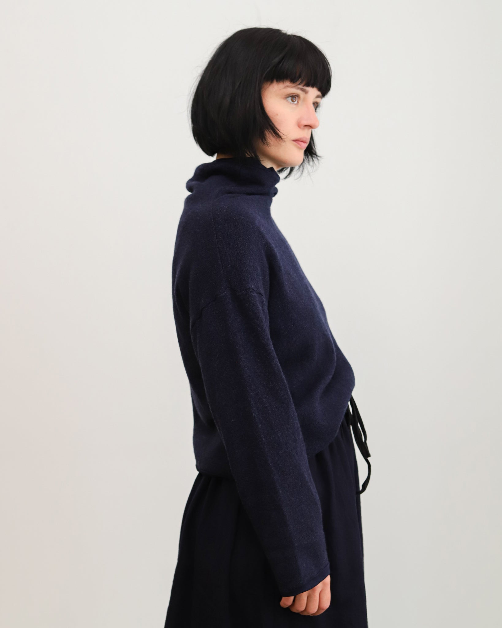 Jersey de lana con cuello alto azul marino. Forro interior de algodón.