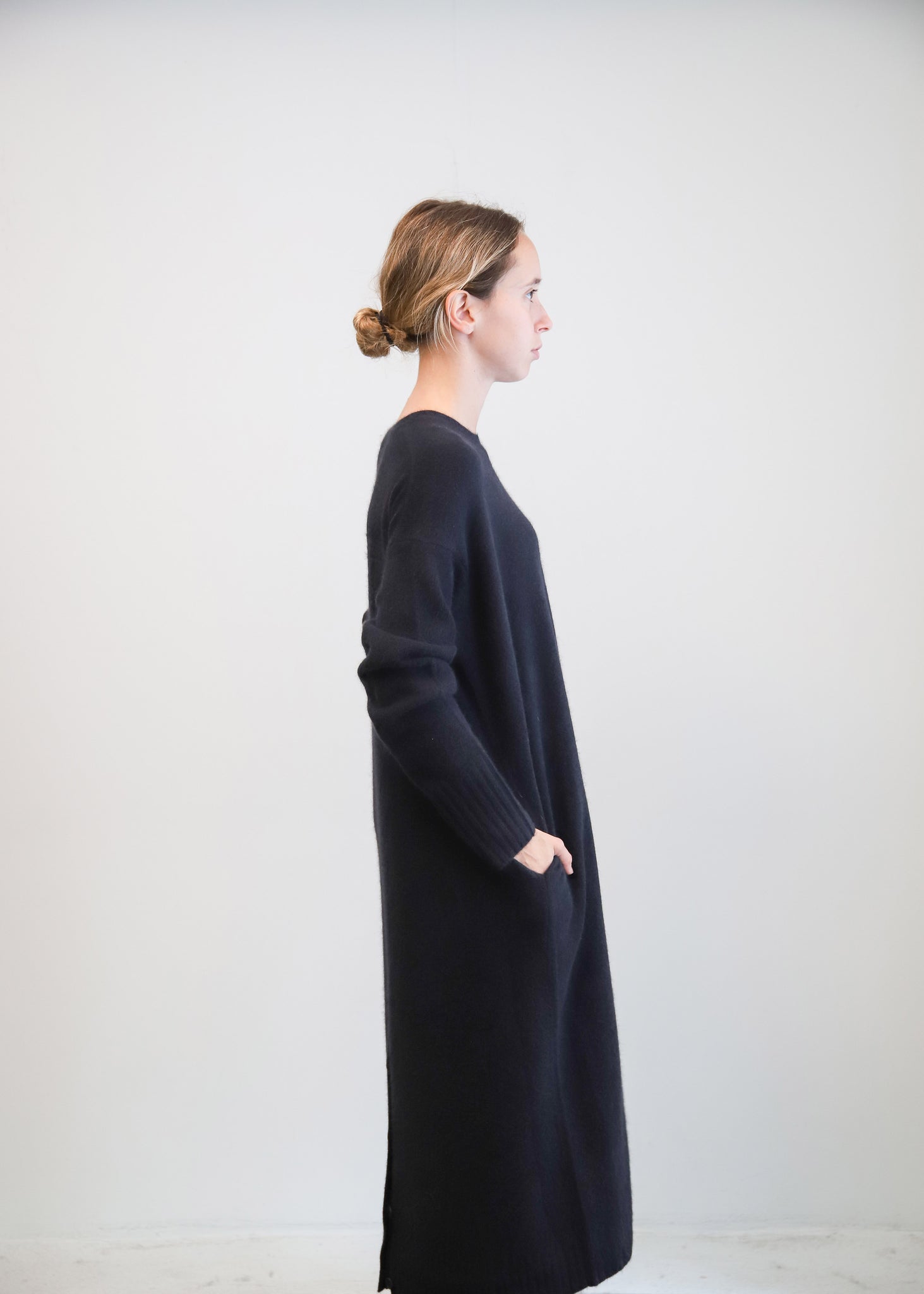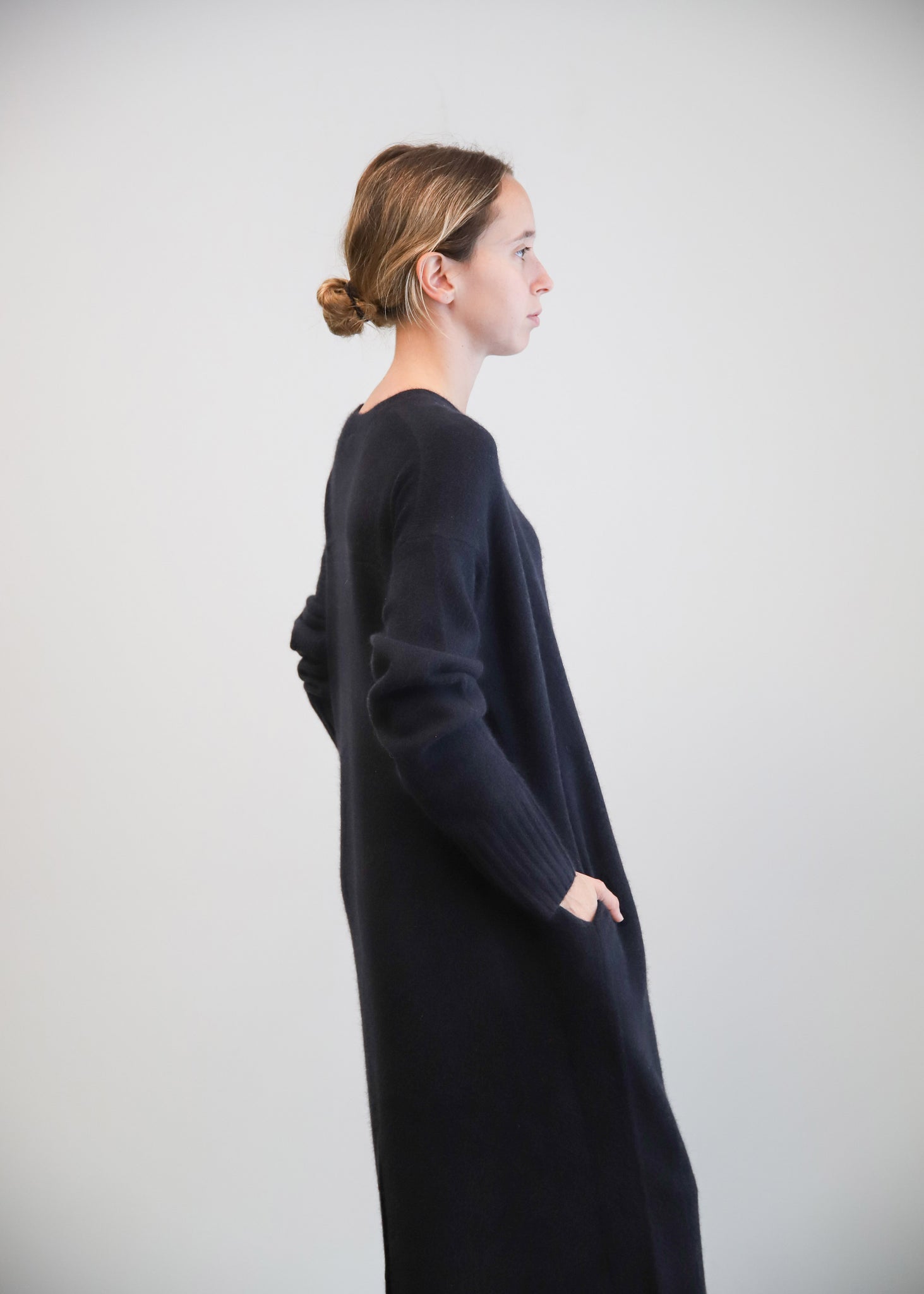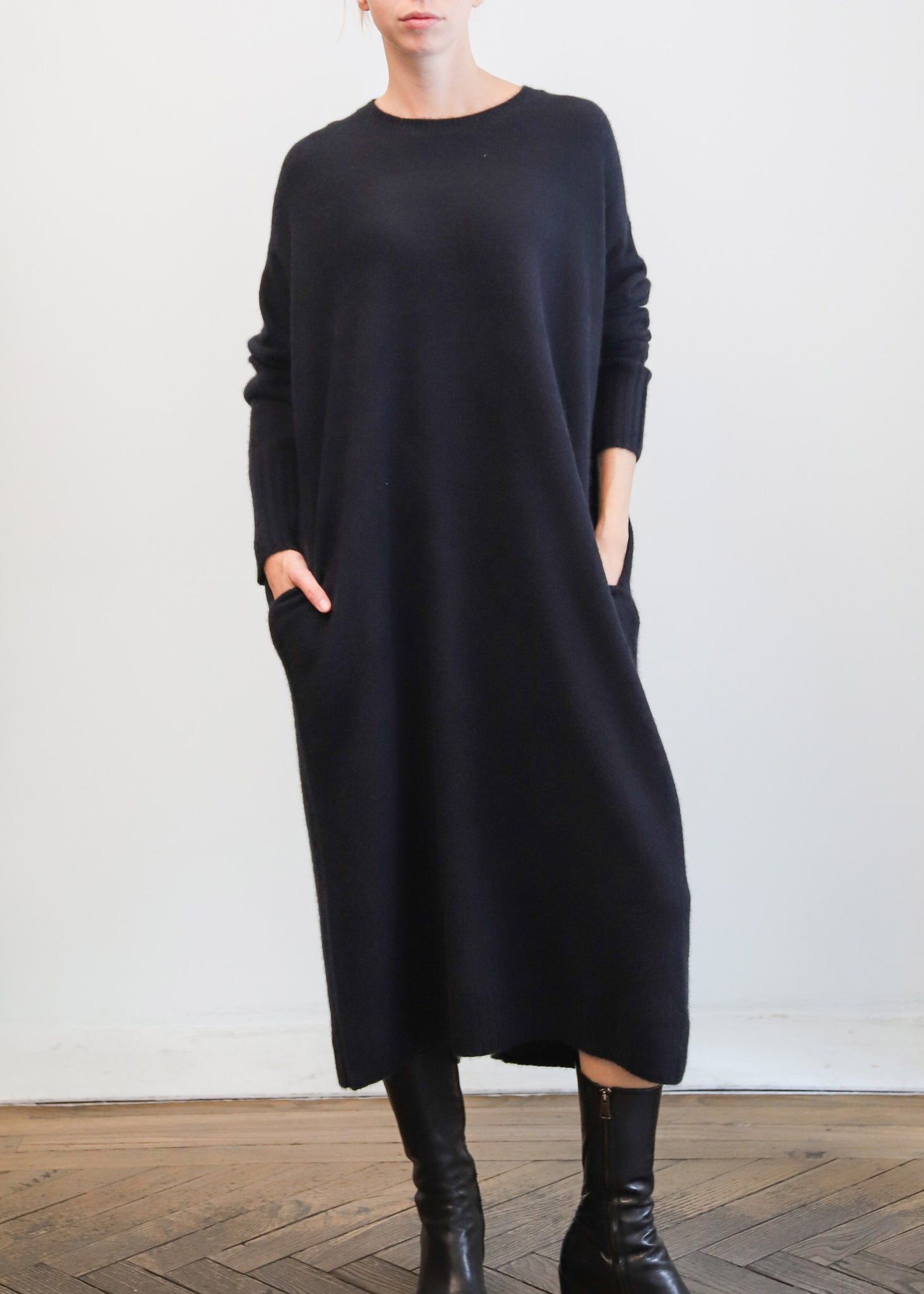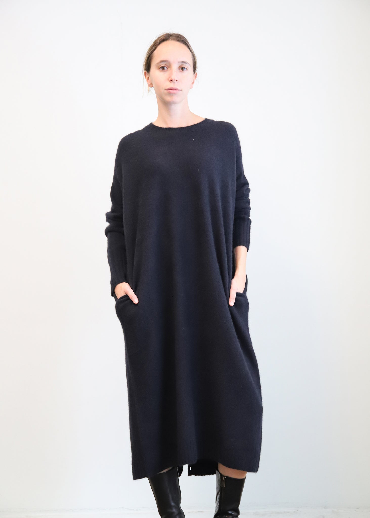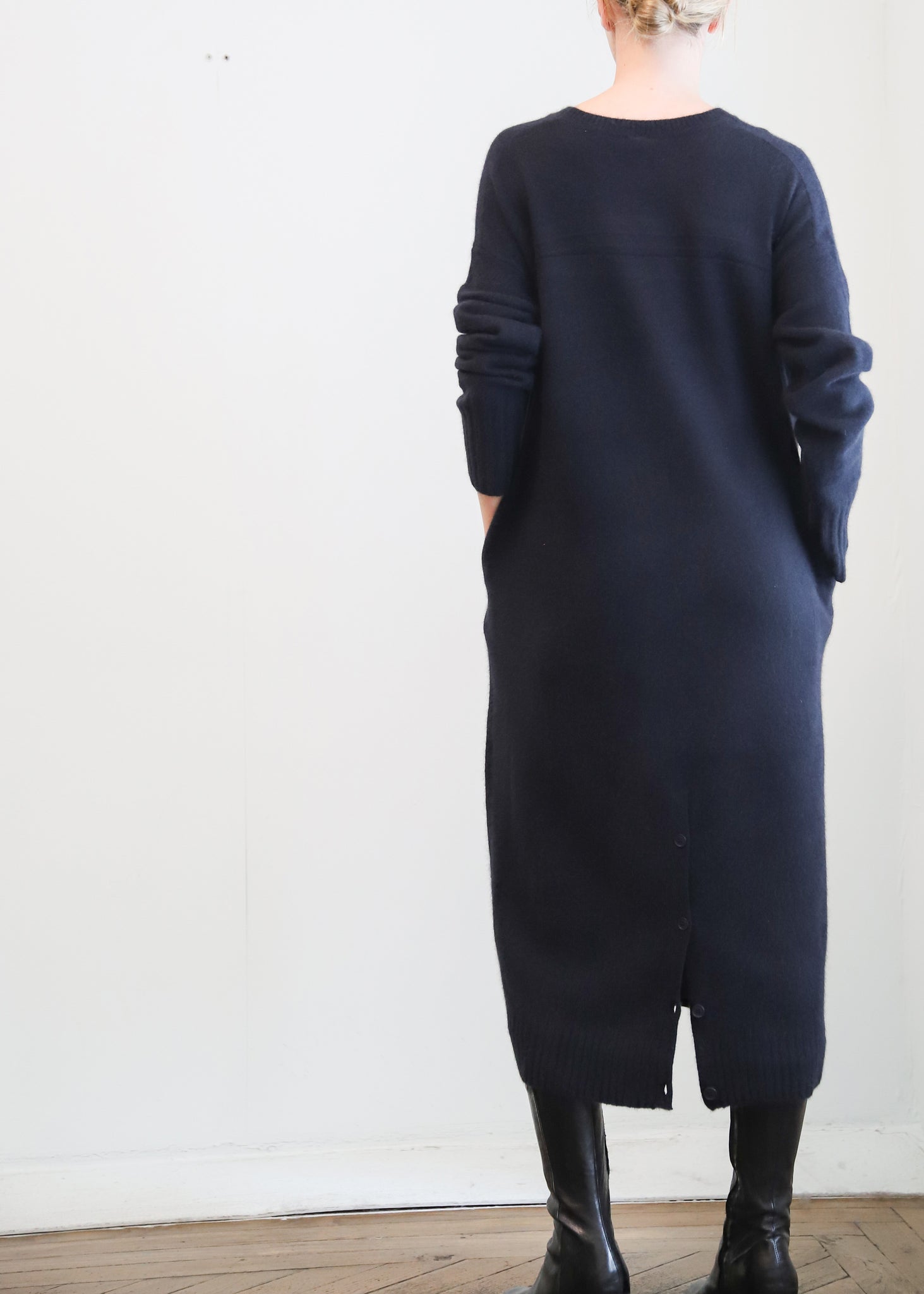 Vestido midi de lana en color azul marino. Cuello a la caja y bolsillos laterales.