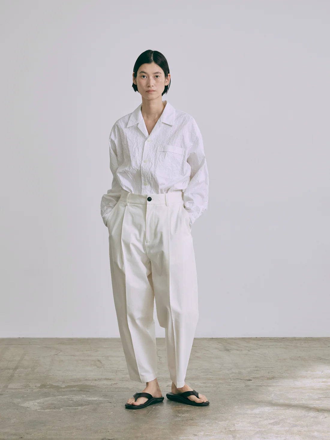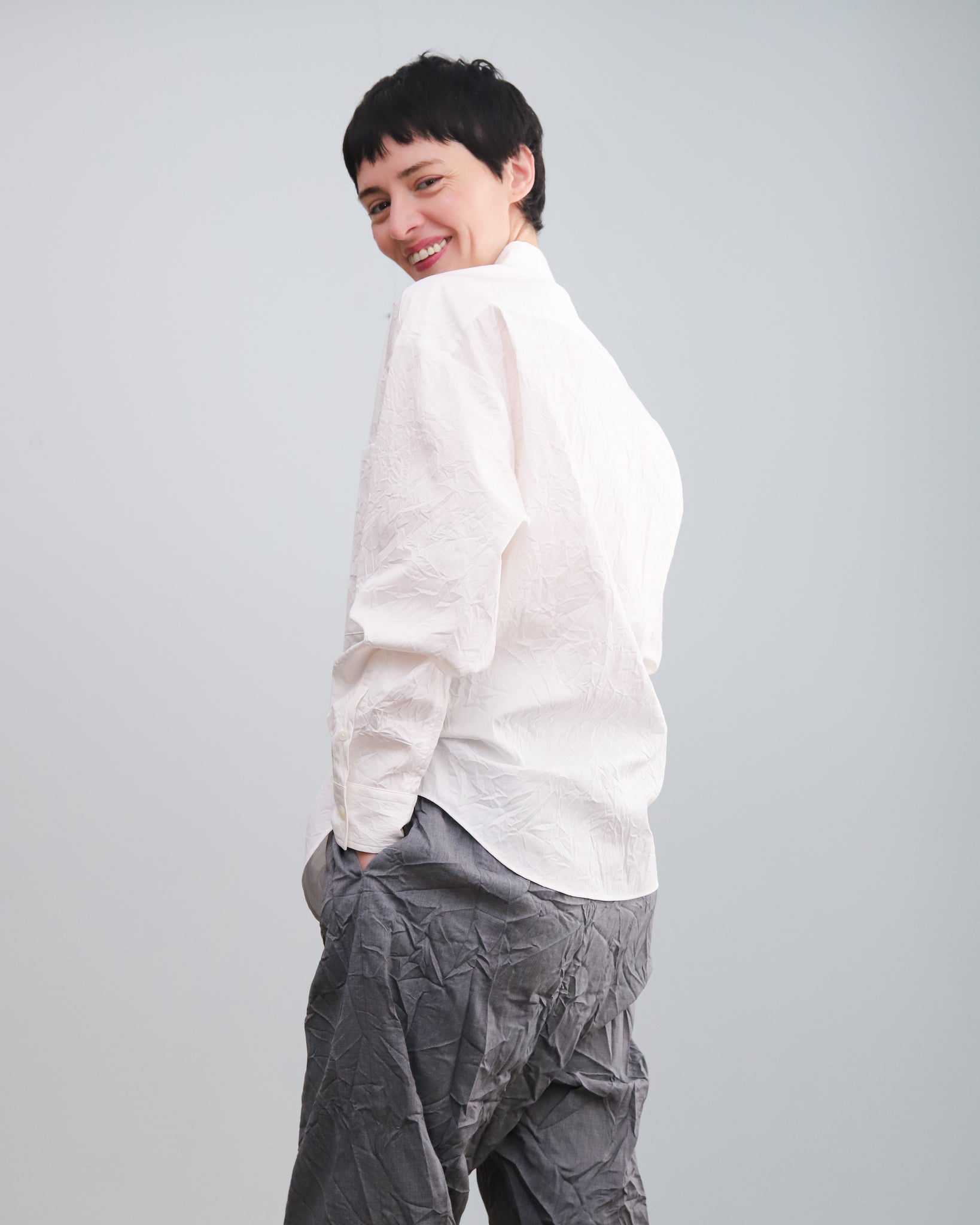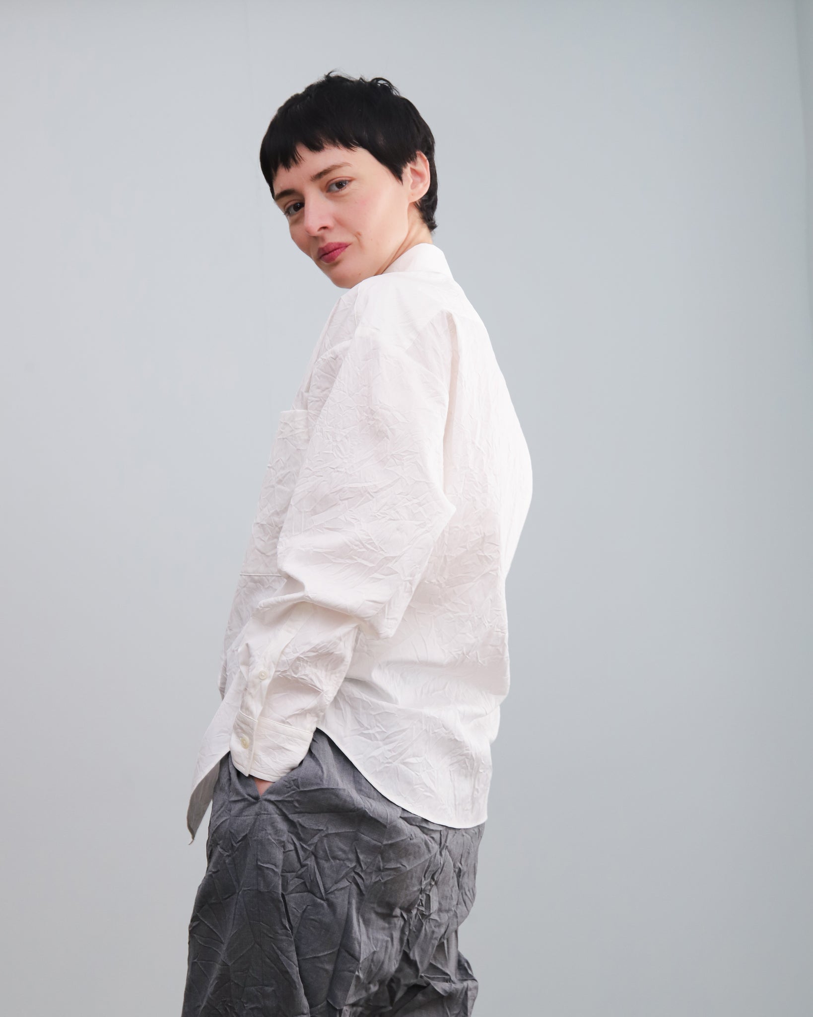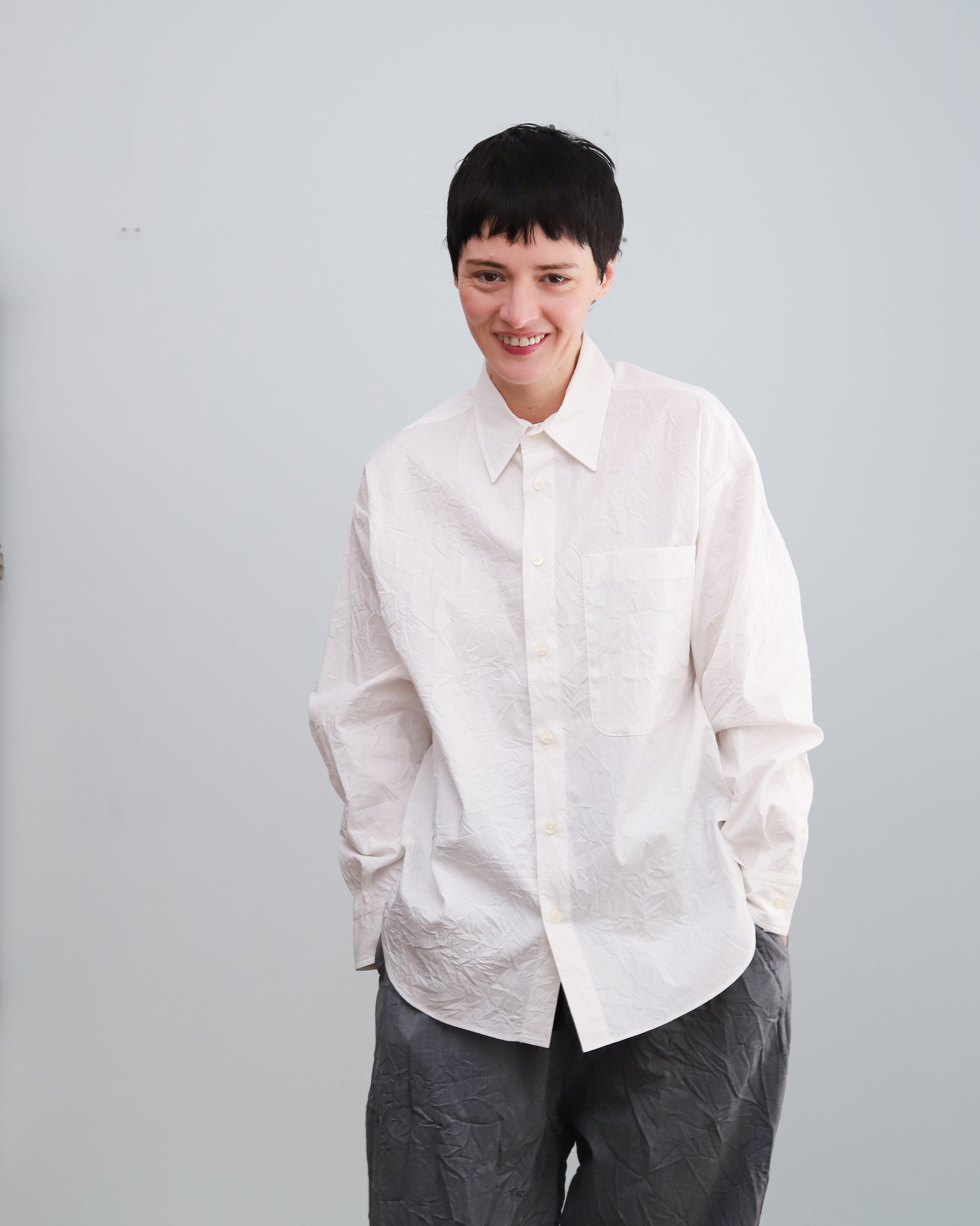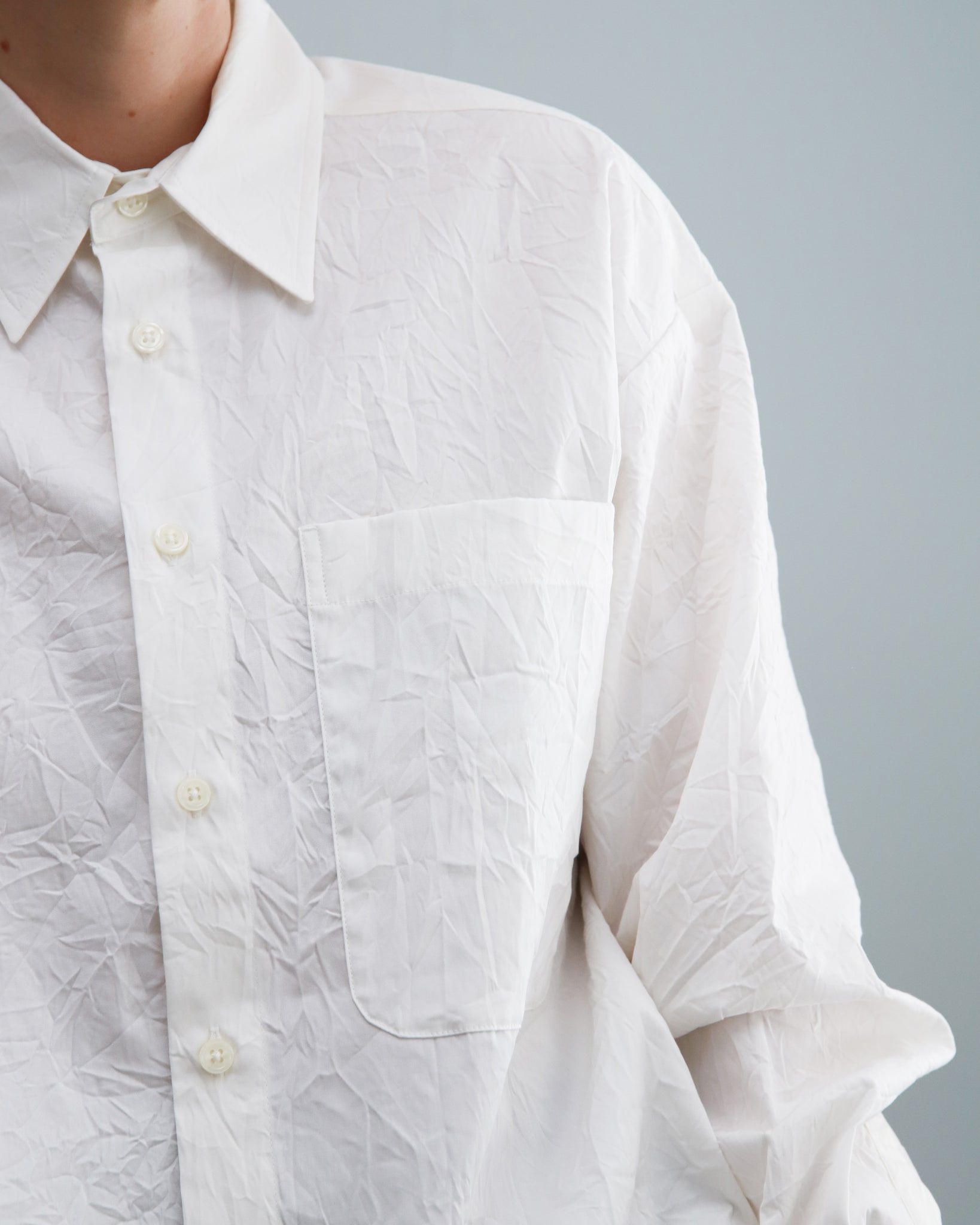 Camisa de popelín color blanco con cuello camisero, abotonado frontal y un bolsillo delantero.