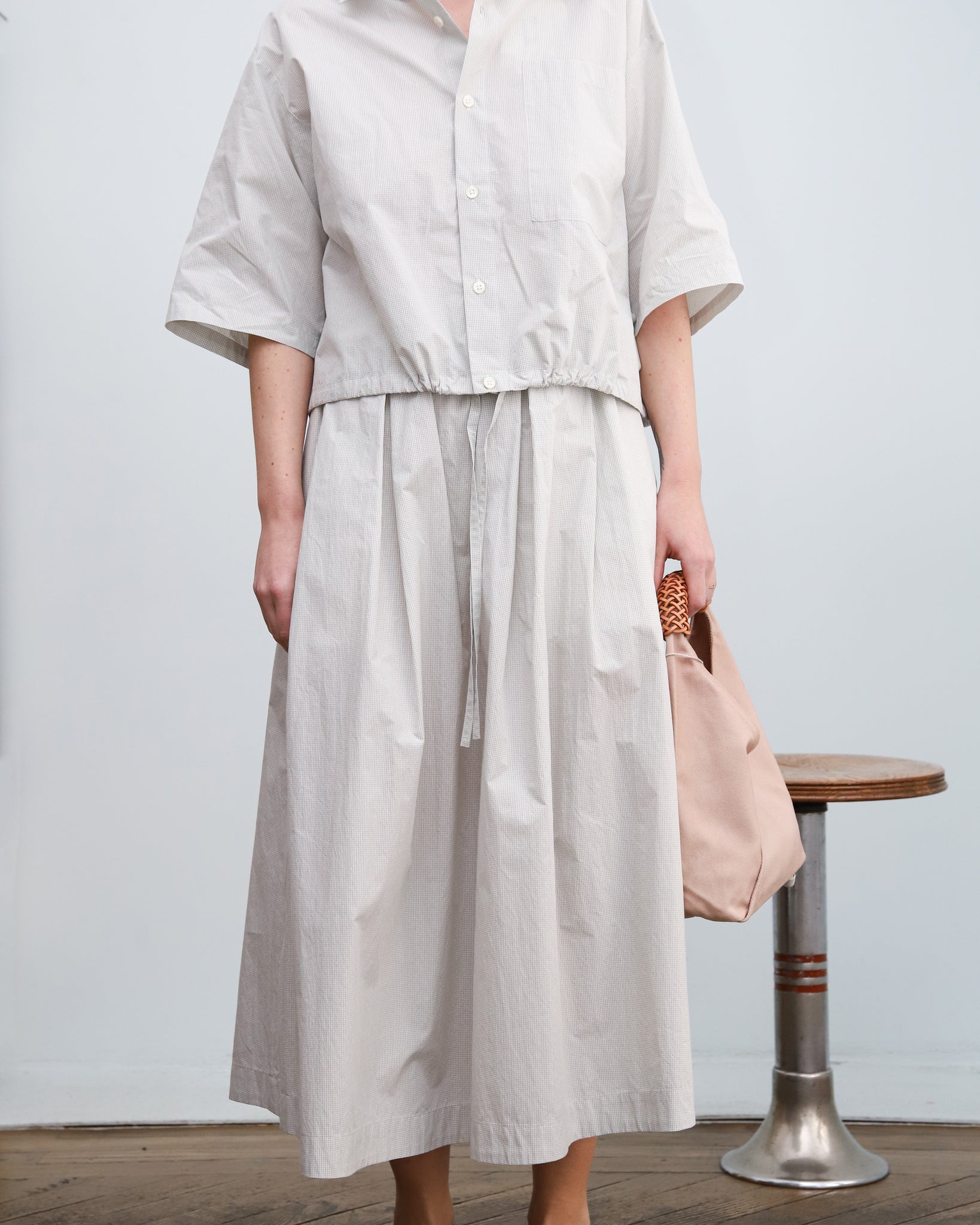 Camisa de popelín con mini cuadro vichy en tono kaki y blanco. Cuello camisero, abotonado frontal y un bolsillo delantero y cordón para fruncir el bajo.