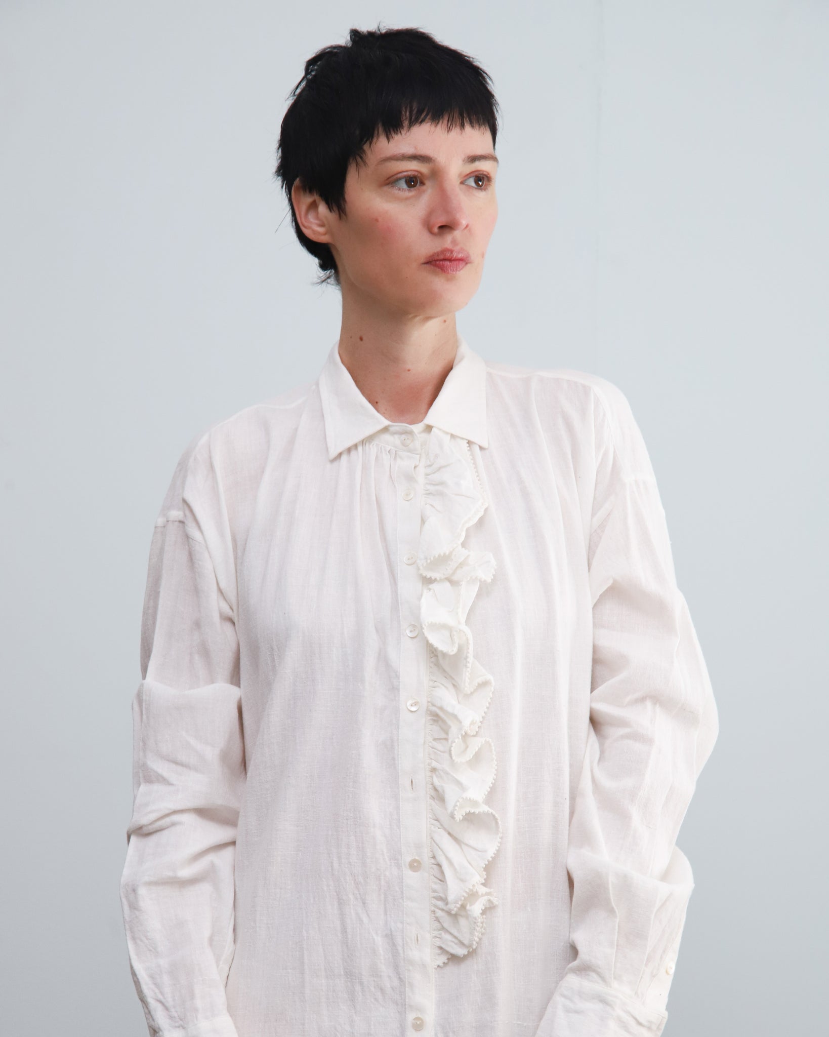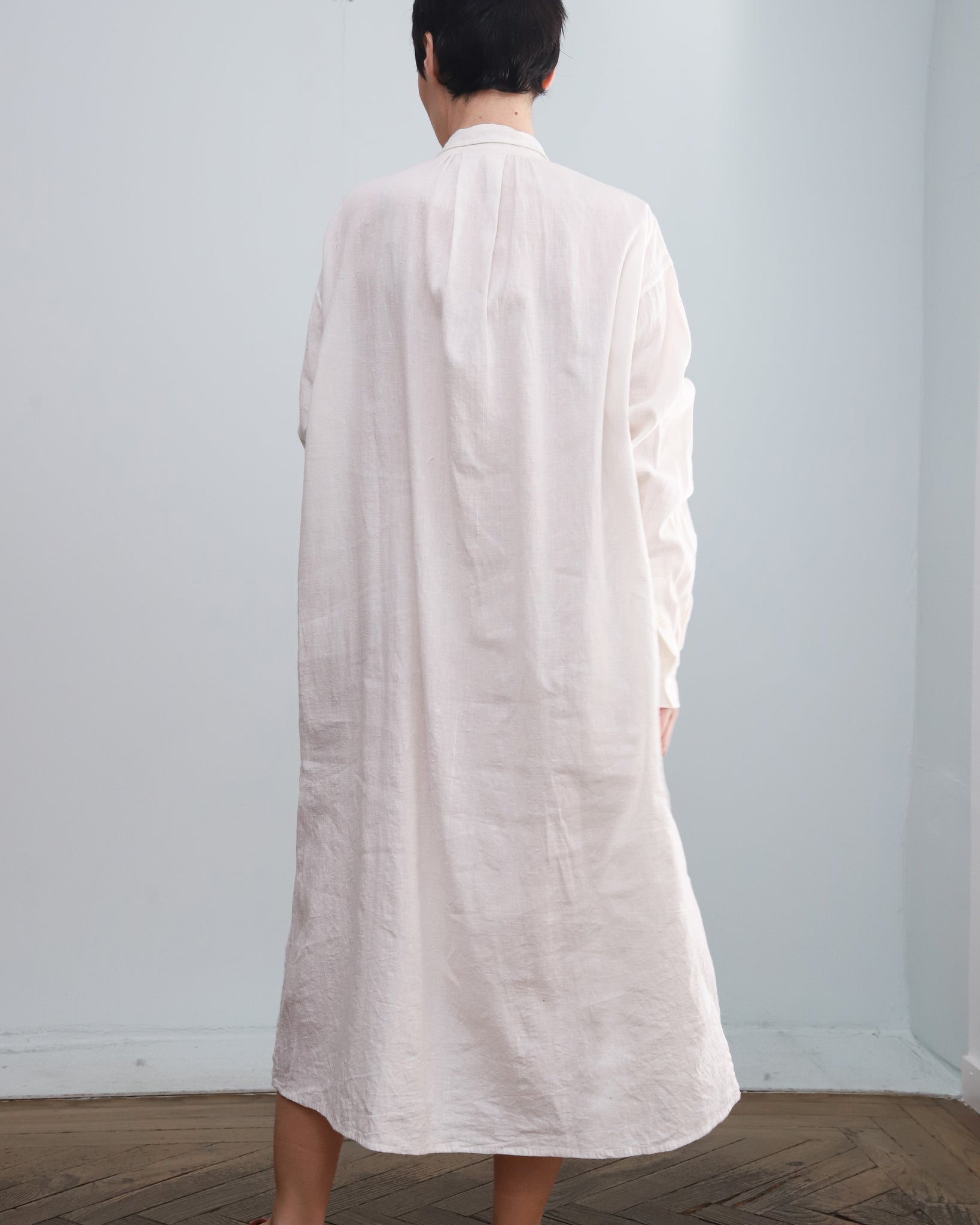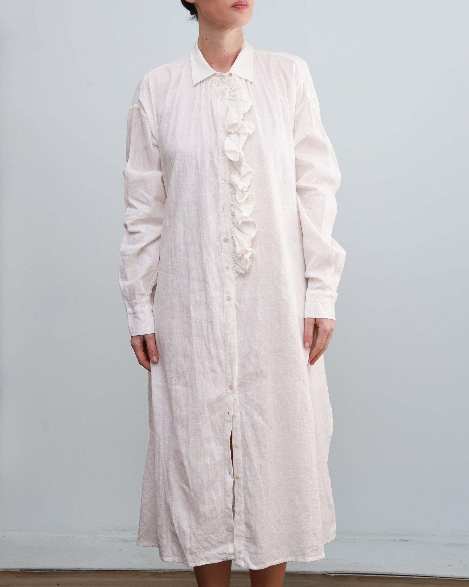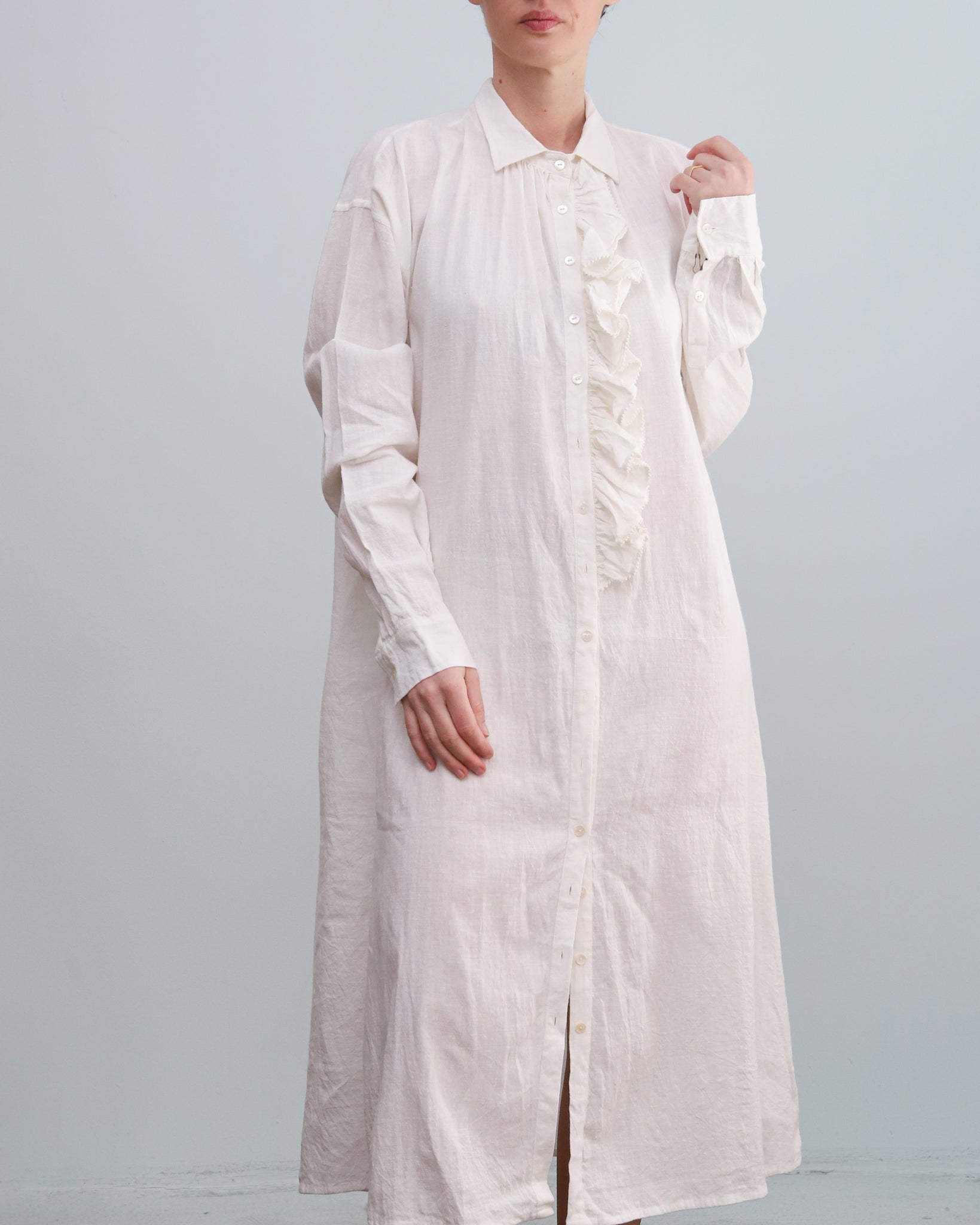 Vestido blanco en algodón y lino. Cuello camisero con abotonado delantero y volante. De corte amplio, aberturas laterales. Talla única.