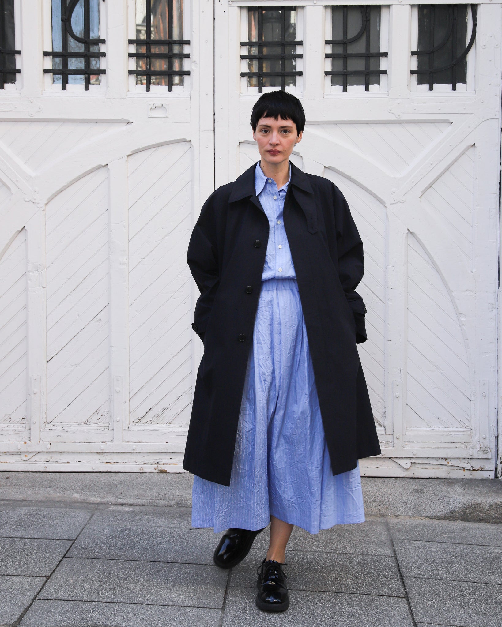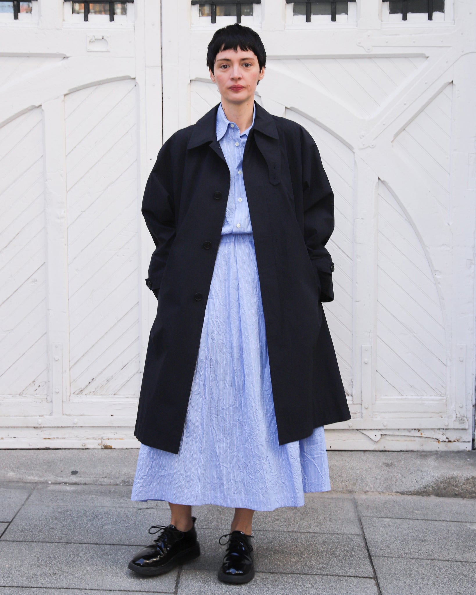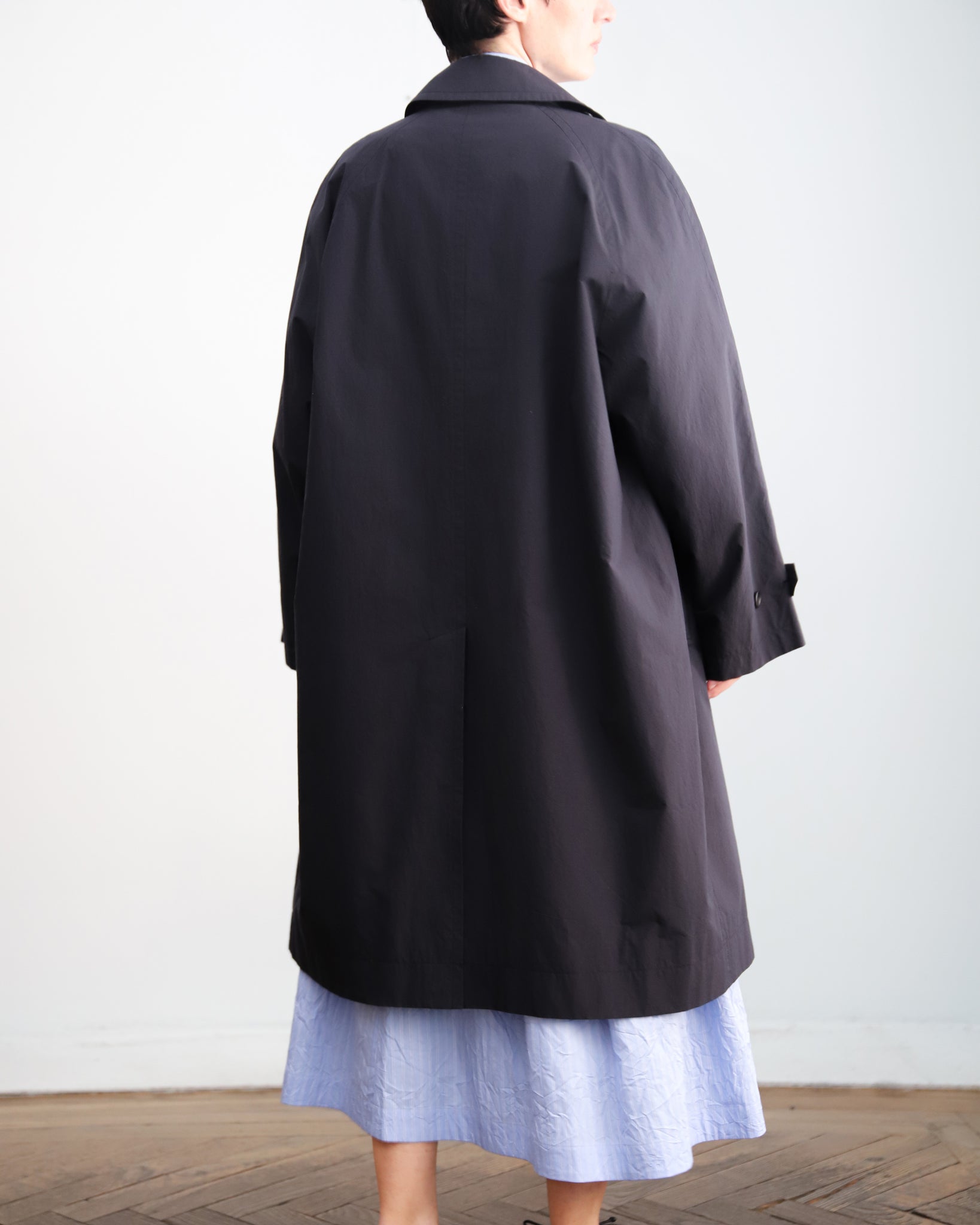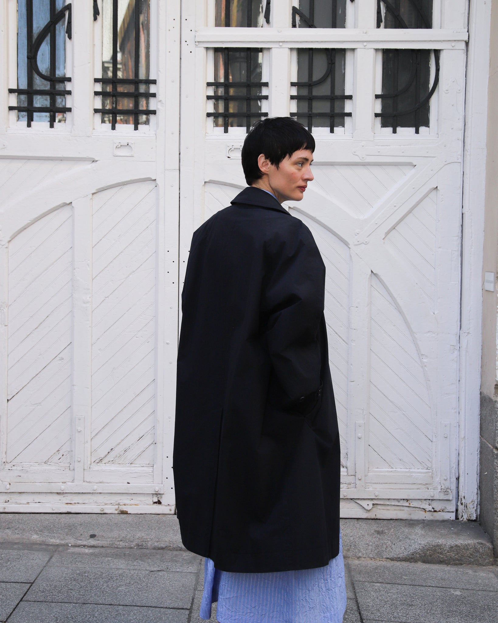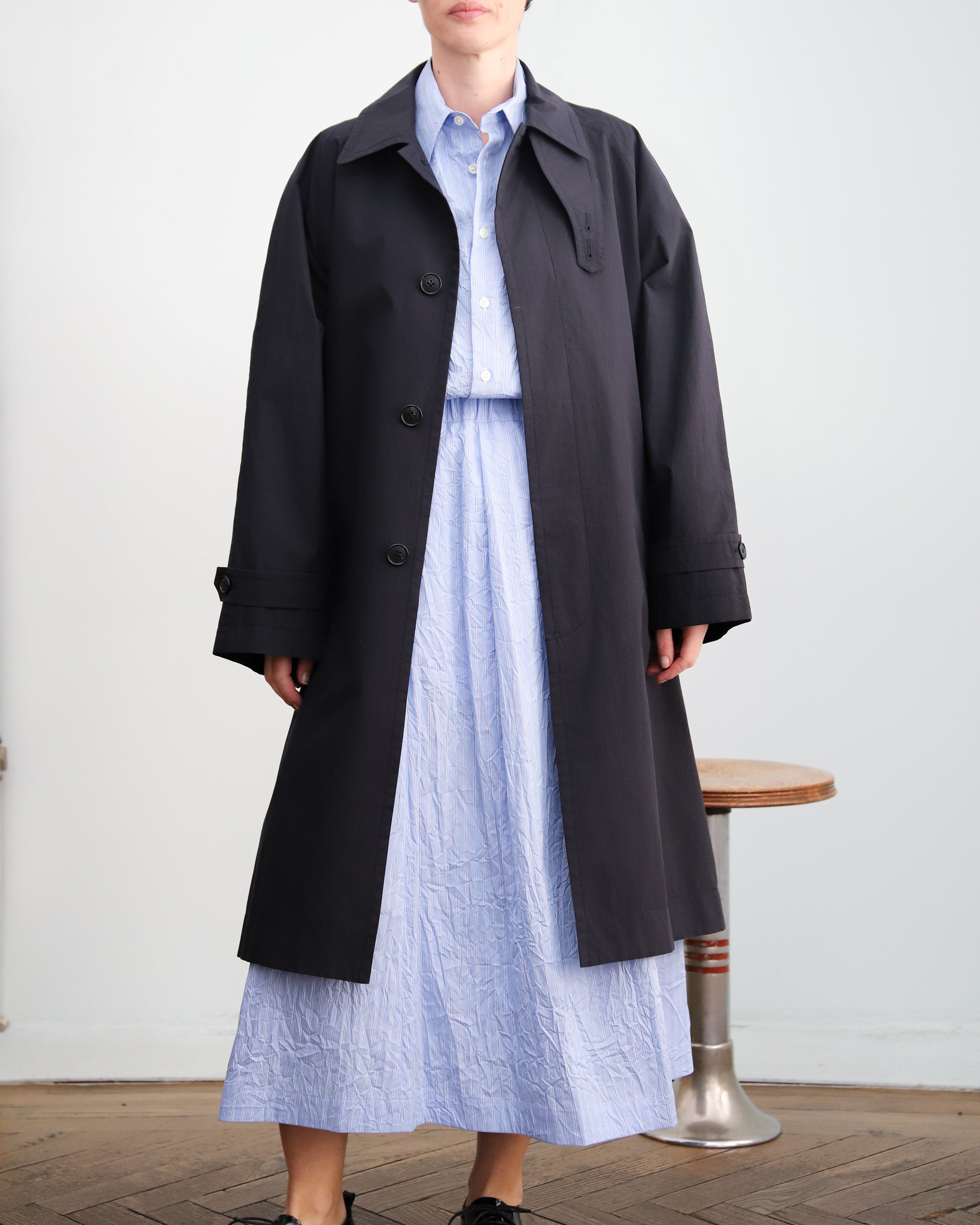 Gabardina azul marino. Cuello camisero con abotonado delantero, manga ranglan, abertura trasera, bolsillos delanteros.