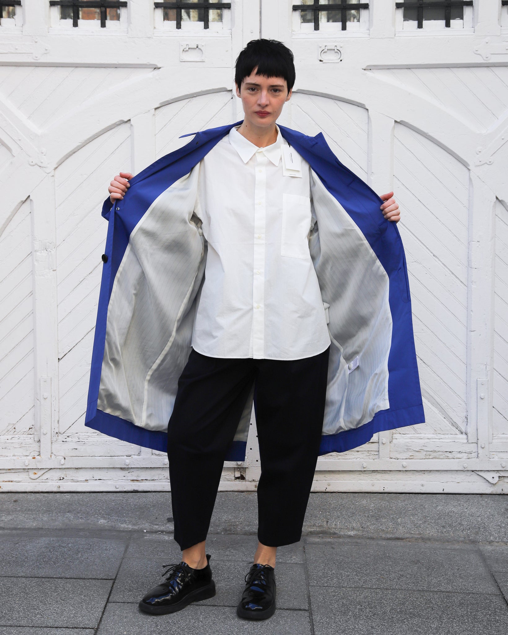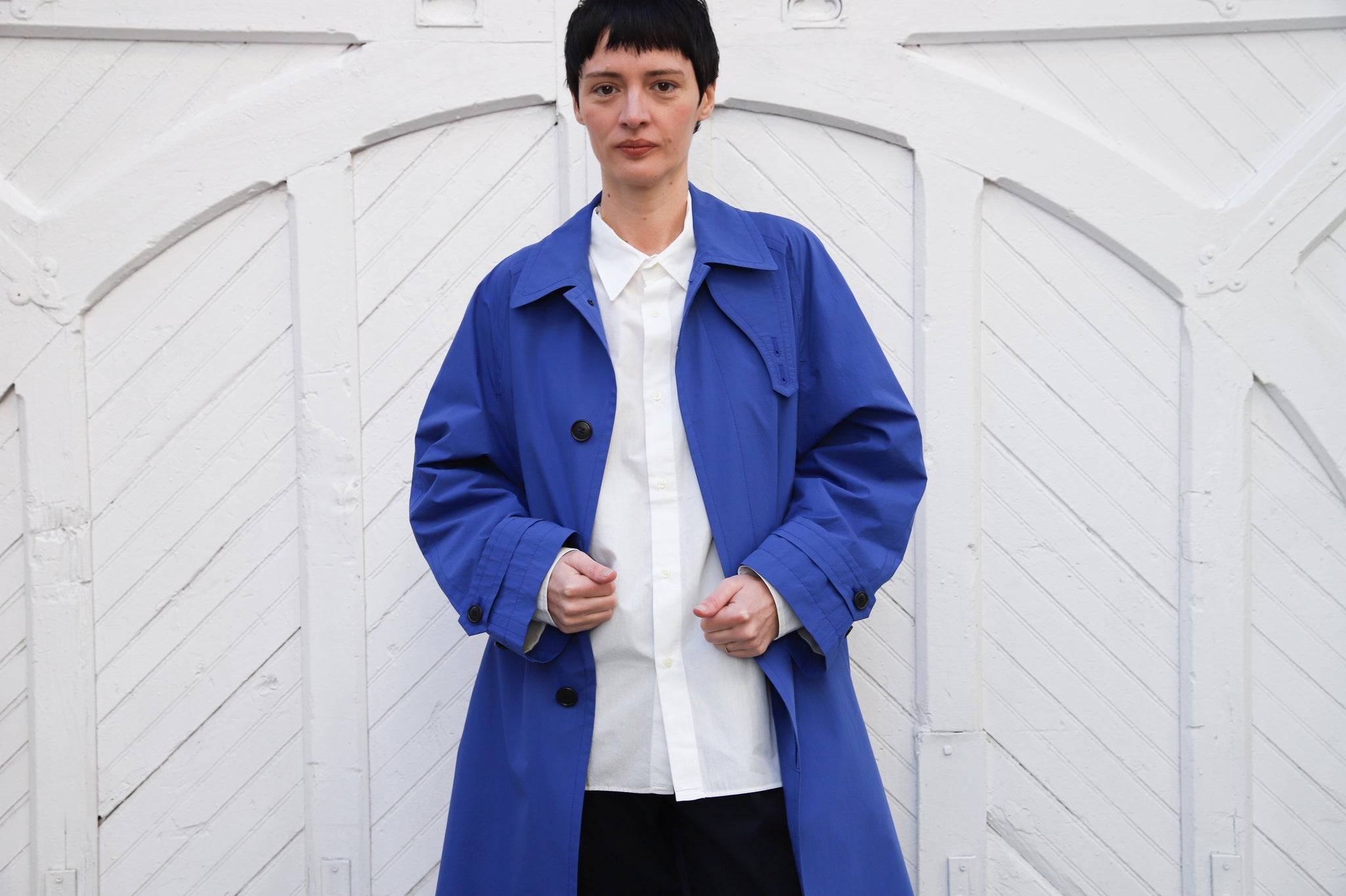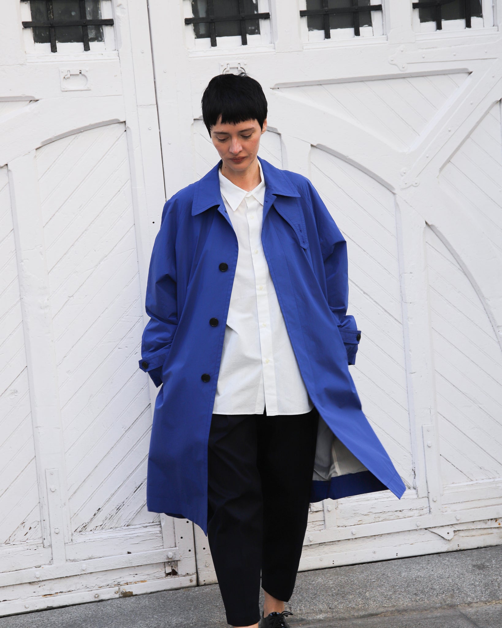 Gabardina color azul cobalto. Cuello camisero con abotonado delantero, manga ranglan, abertura trasera, bolsillos delanteros.