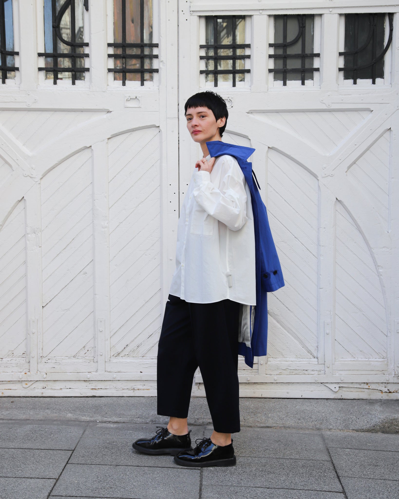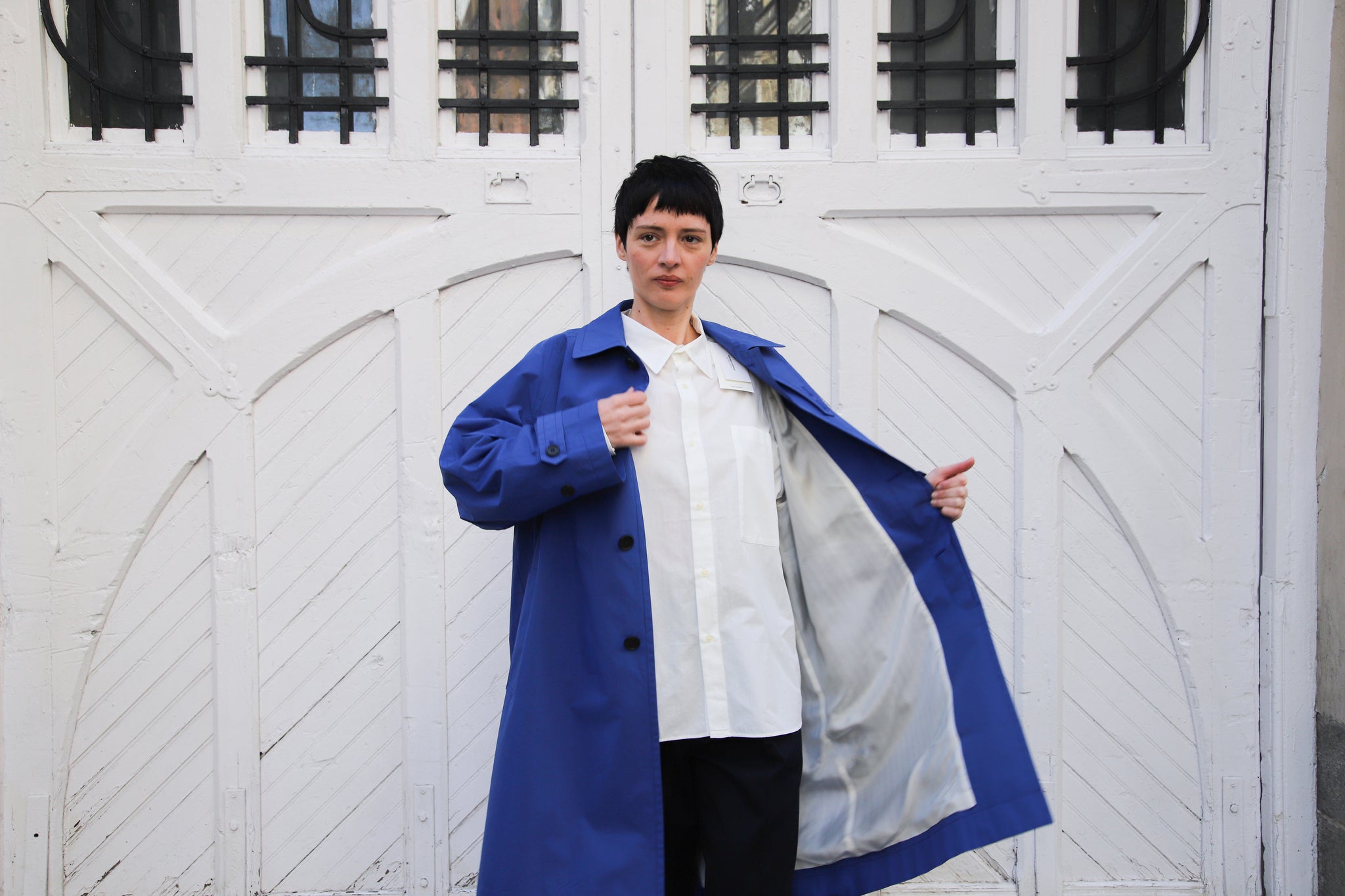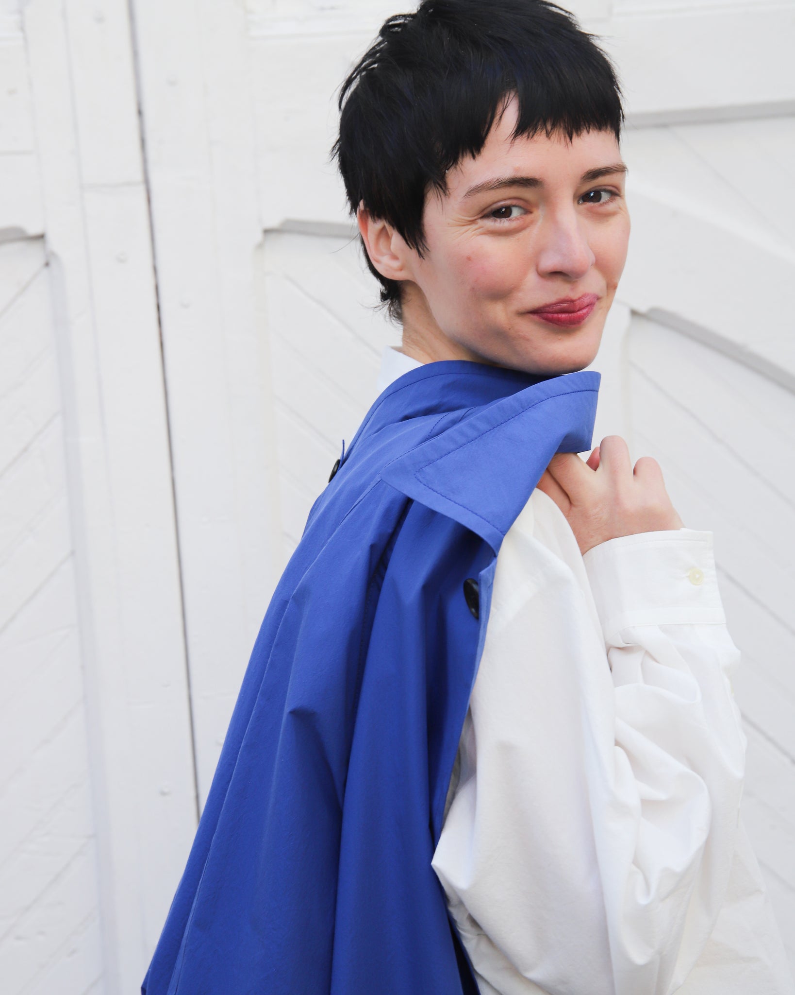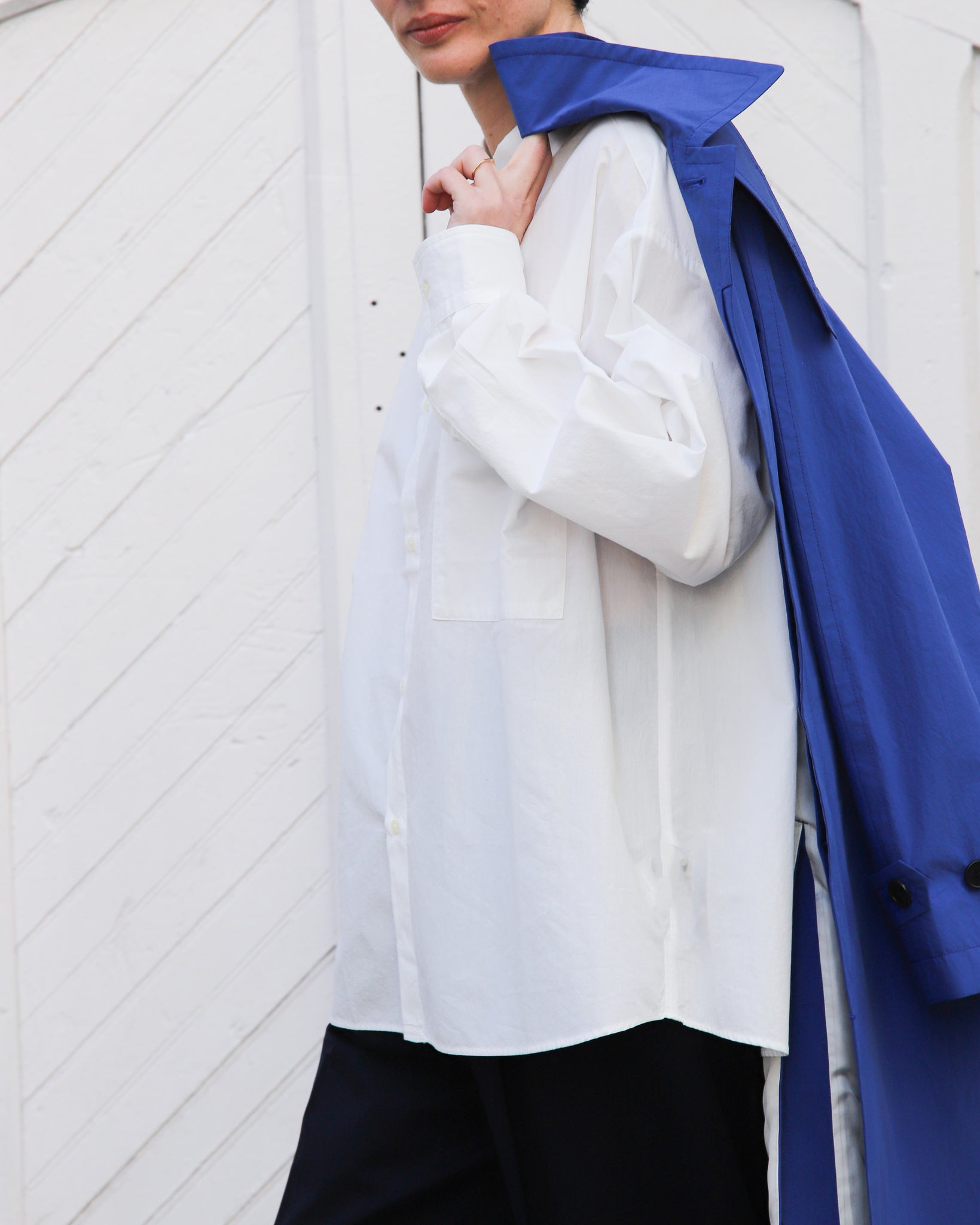Gabardina color azul cobalto. Cuello camisero con abotonado delantero, manga ranglan, abertura trasera, bolsillos delanteros.