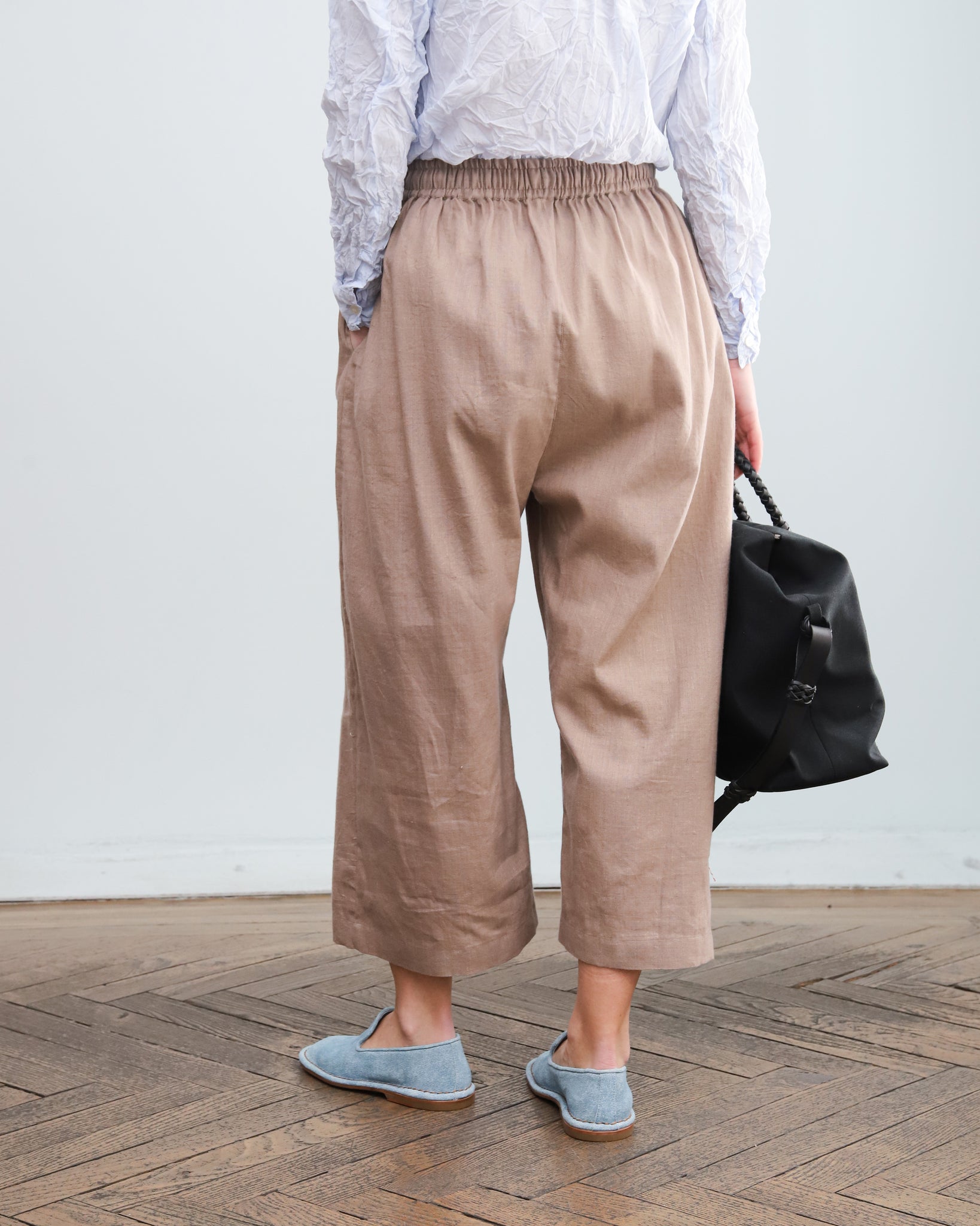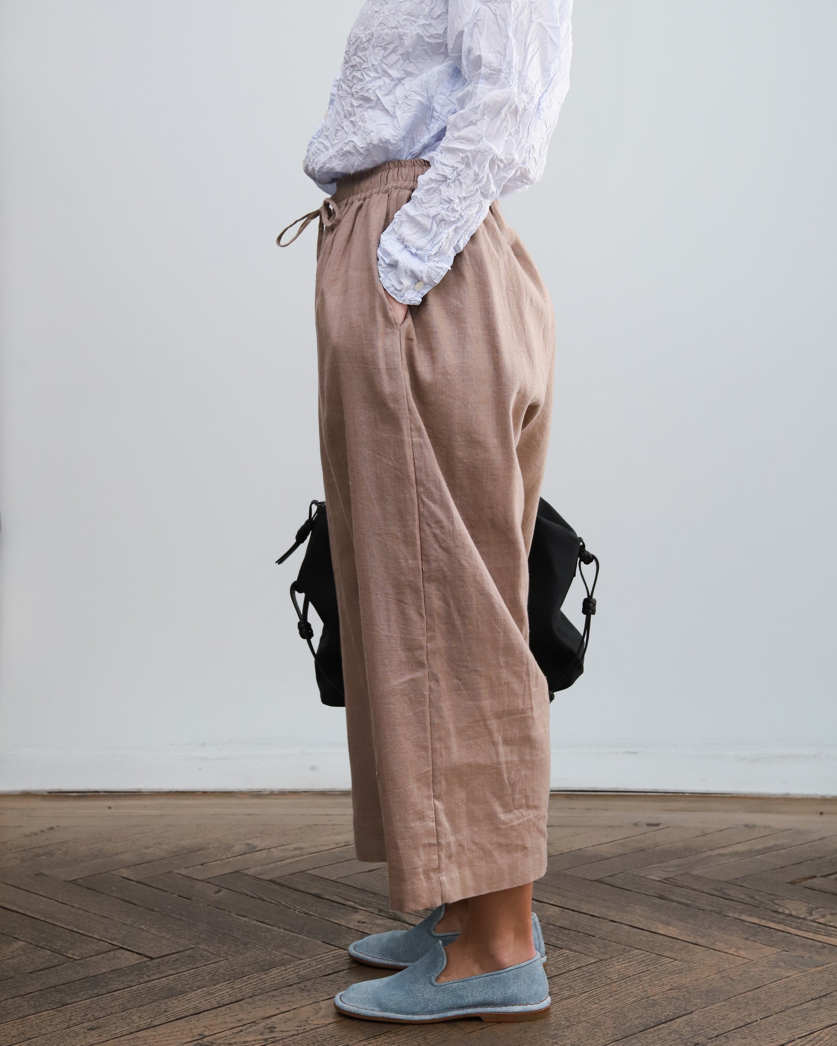 Pantalón beige de pata ancha en algodón y lino. Cintura elástica con cordón para ajustar y bolsillos laterales. Talla única.