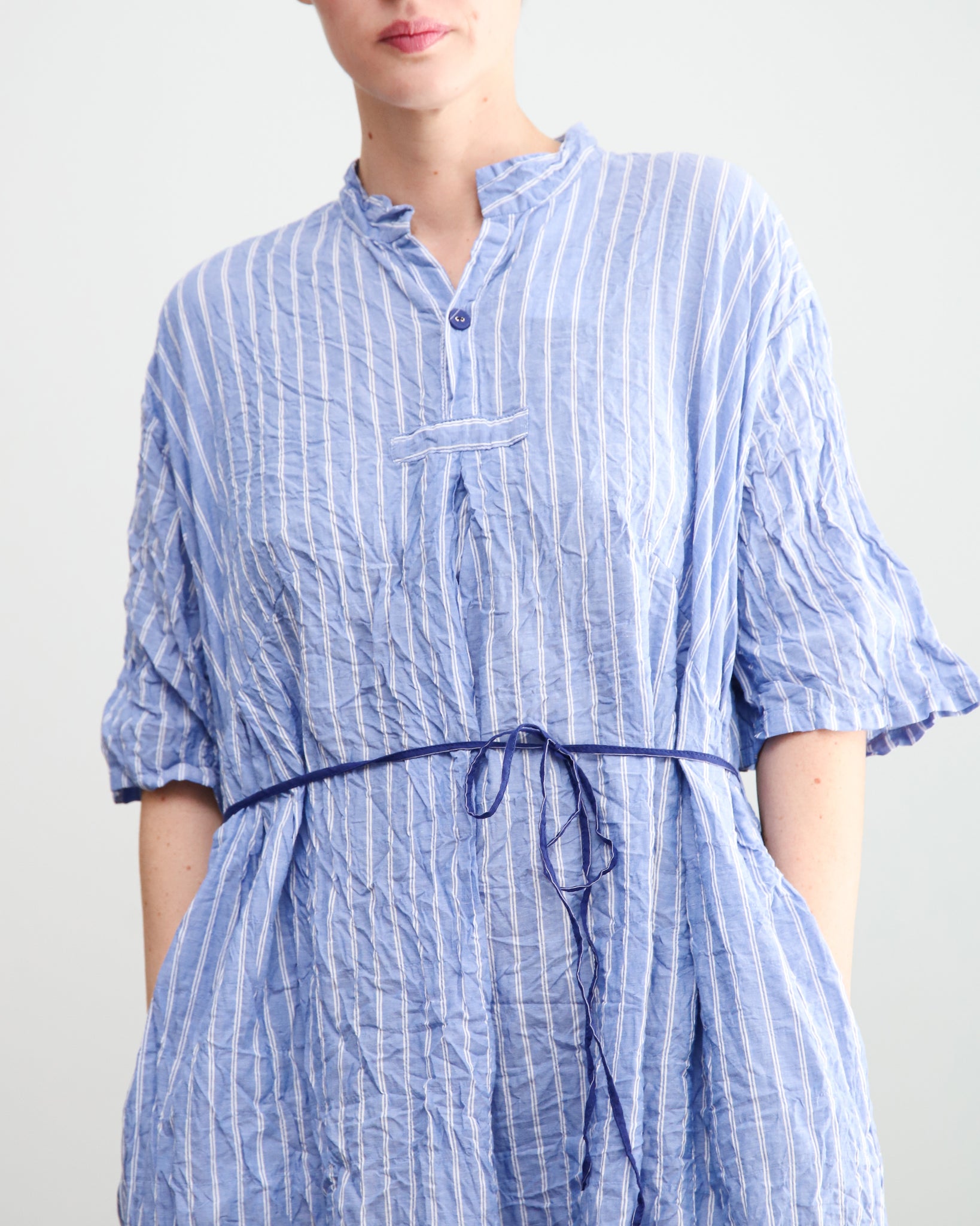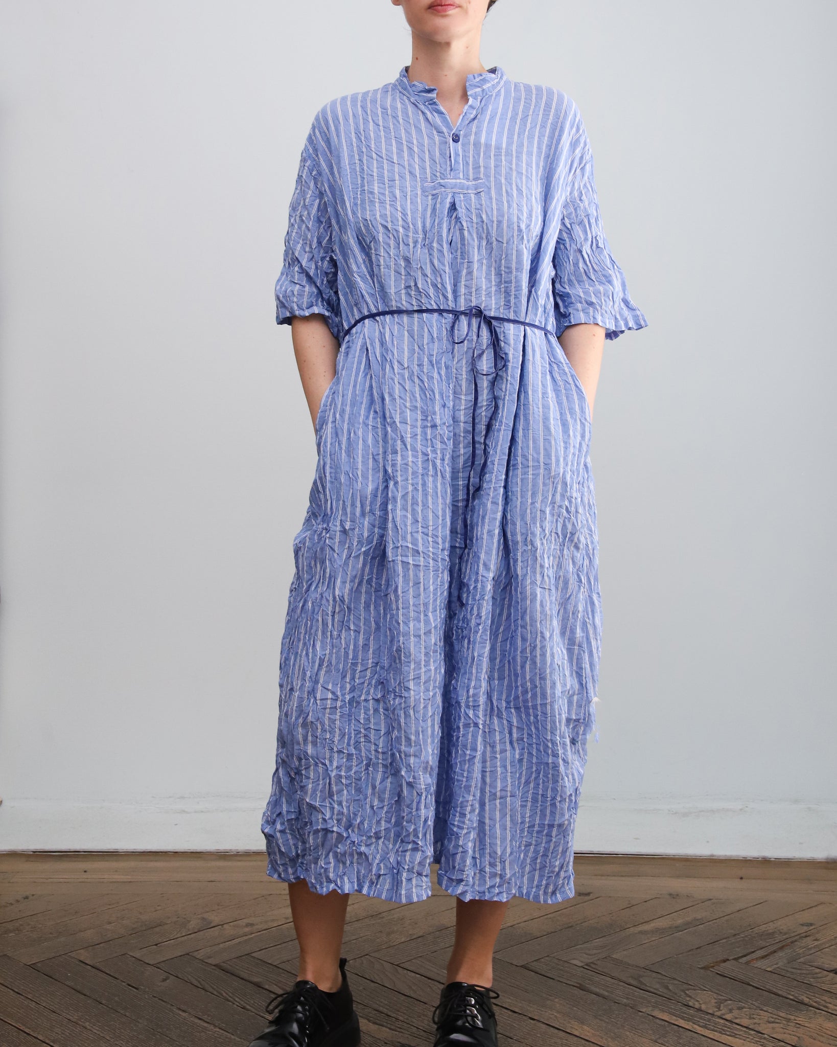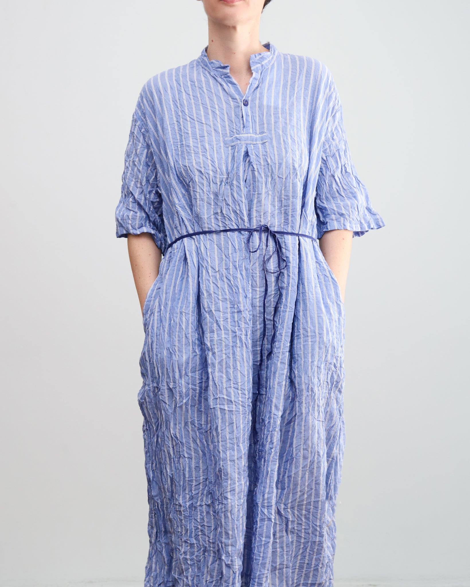 Vestido largo azul con rayas. Cuello mao con botón, bolsillos laterales y lazo fino independiente para ajustar. Tejido con efecto arrugado.