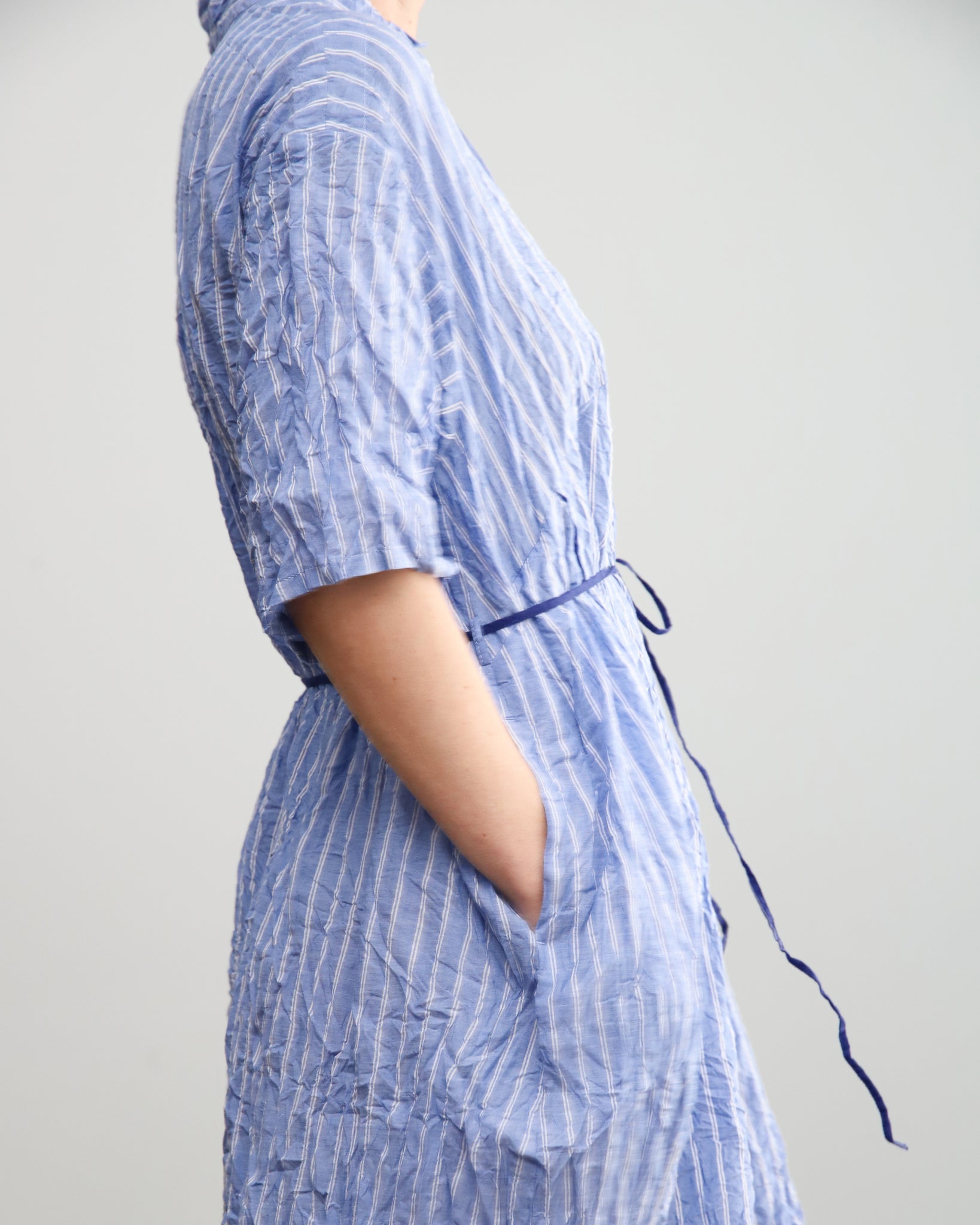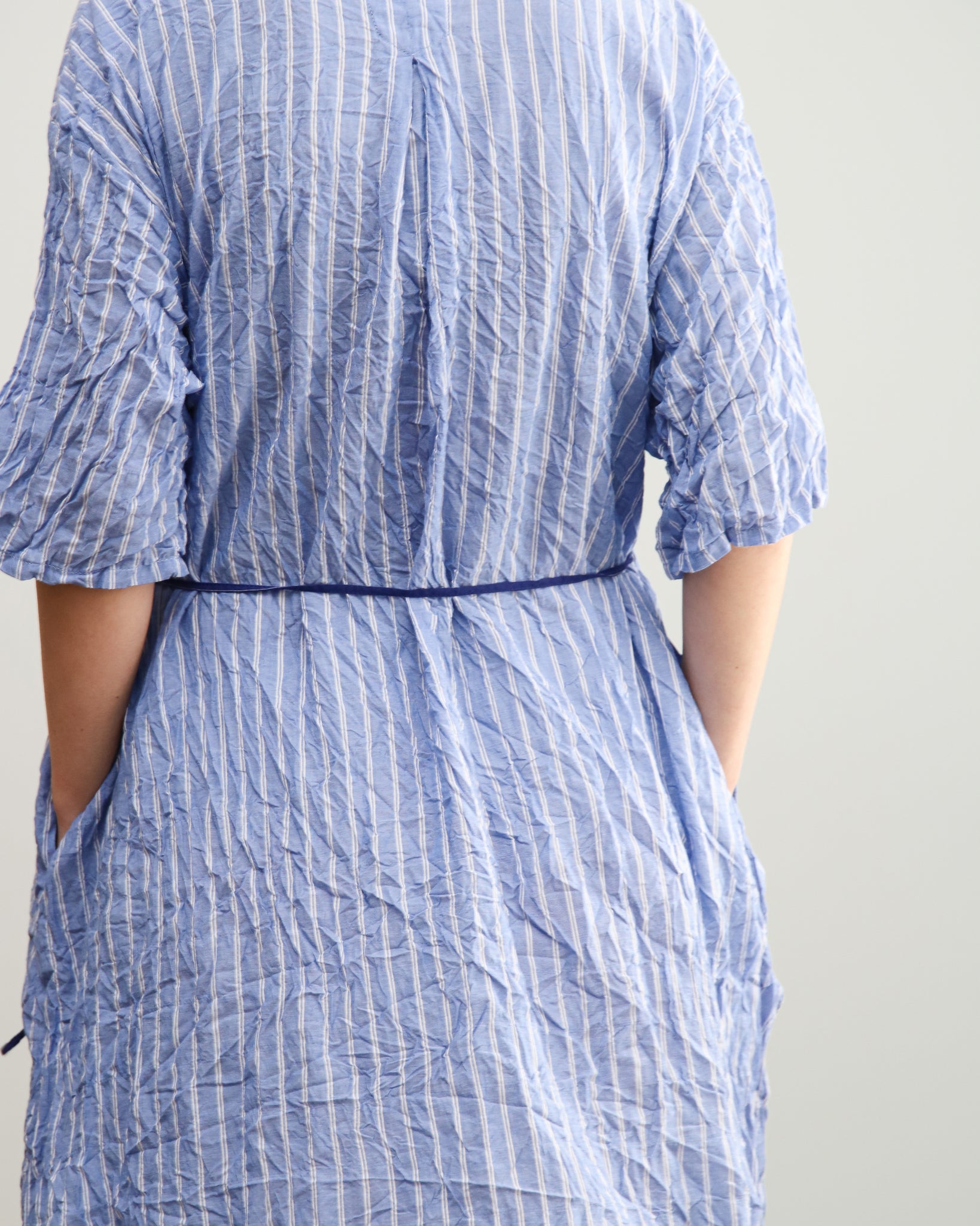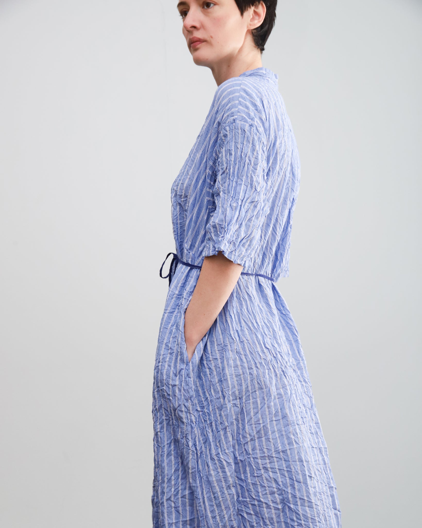 Vestido largo azul con rayas. Cuello mao con botón, bolsillos laterales y lazo fino independiente para ajustar. Tejido con efecto arrugado.