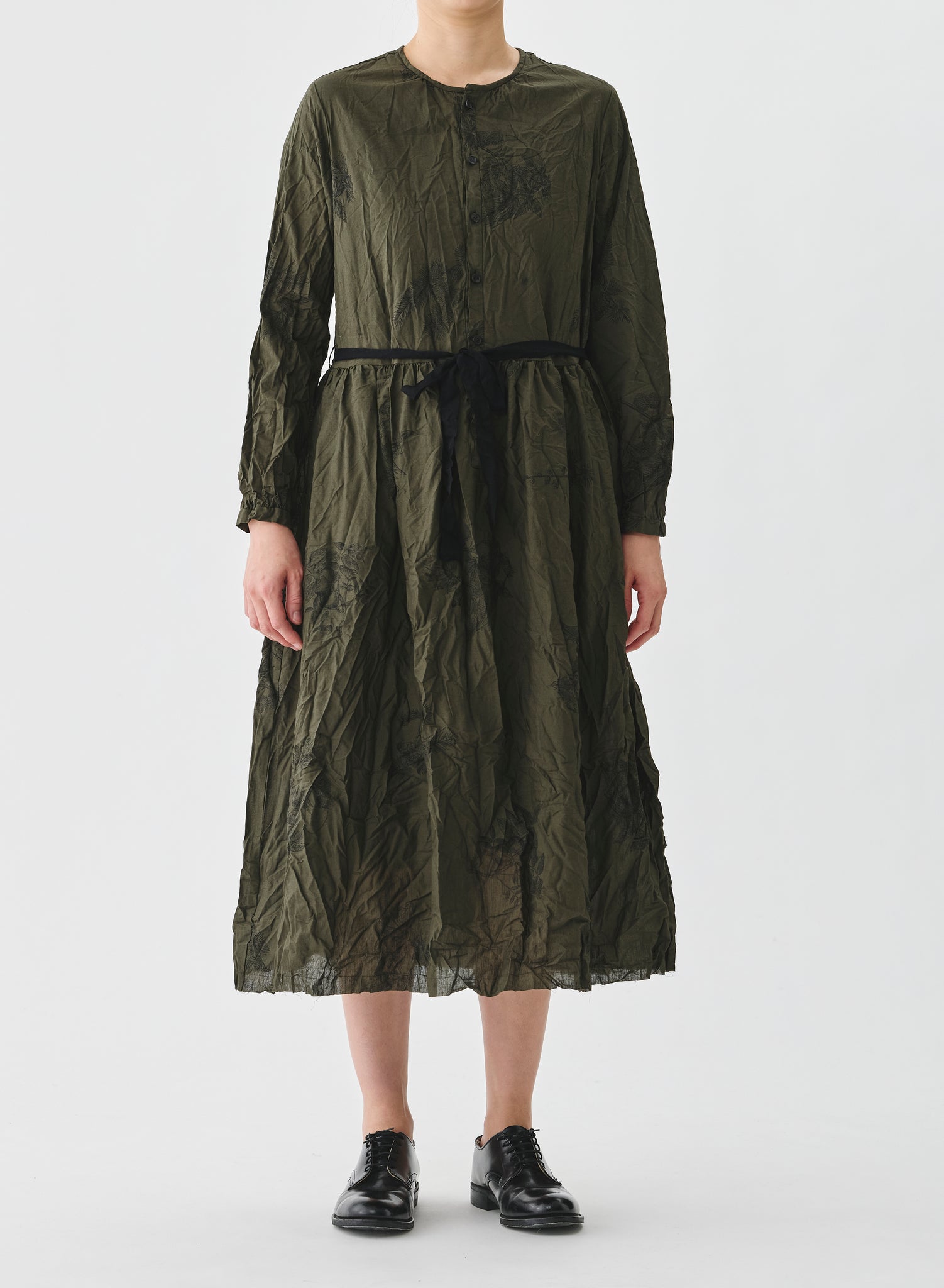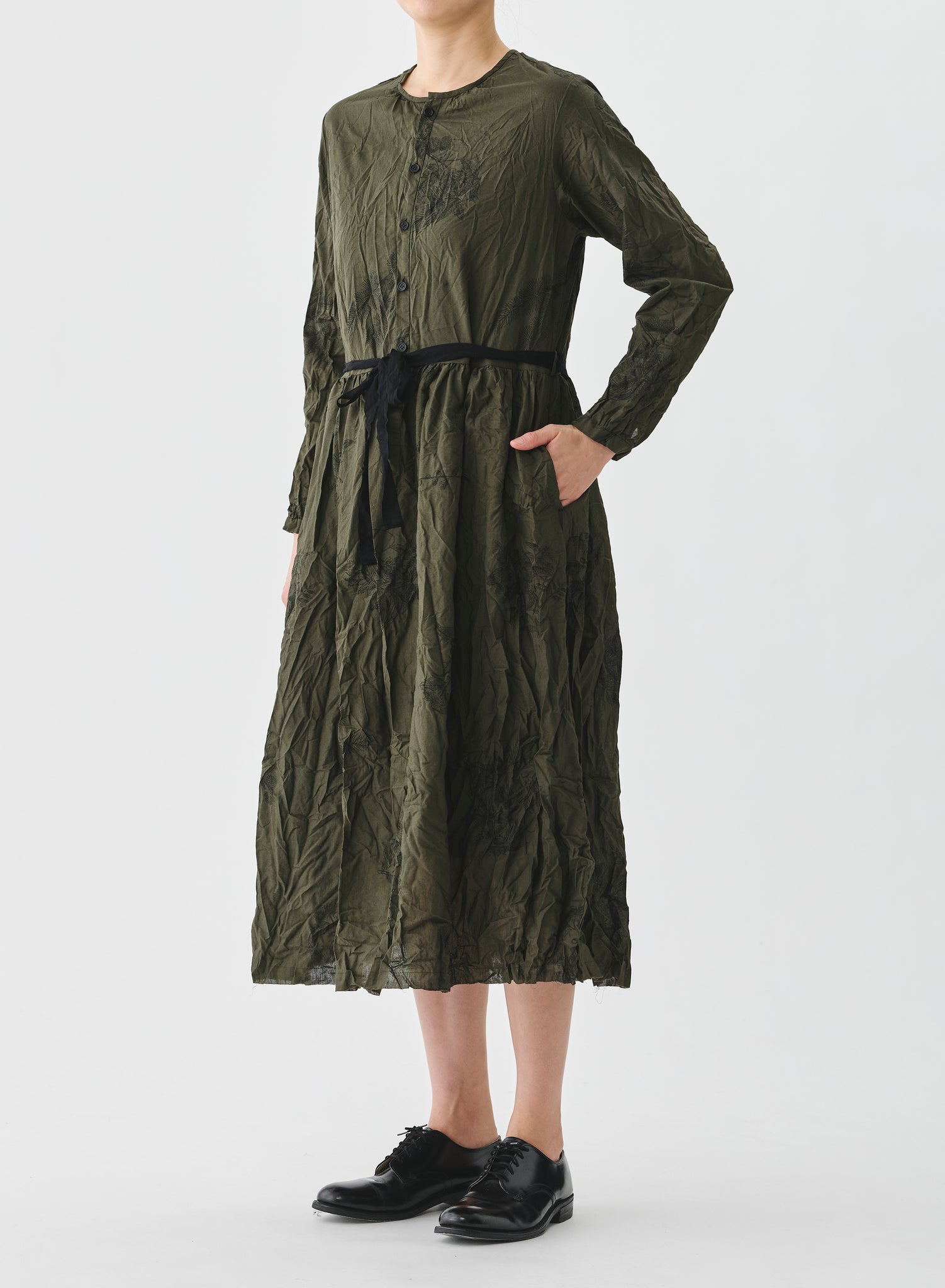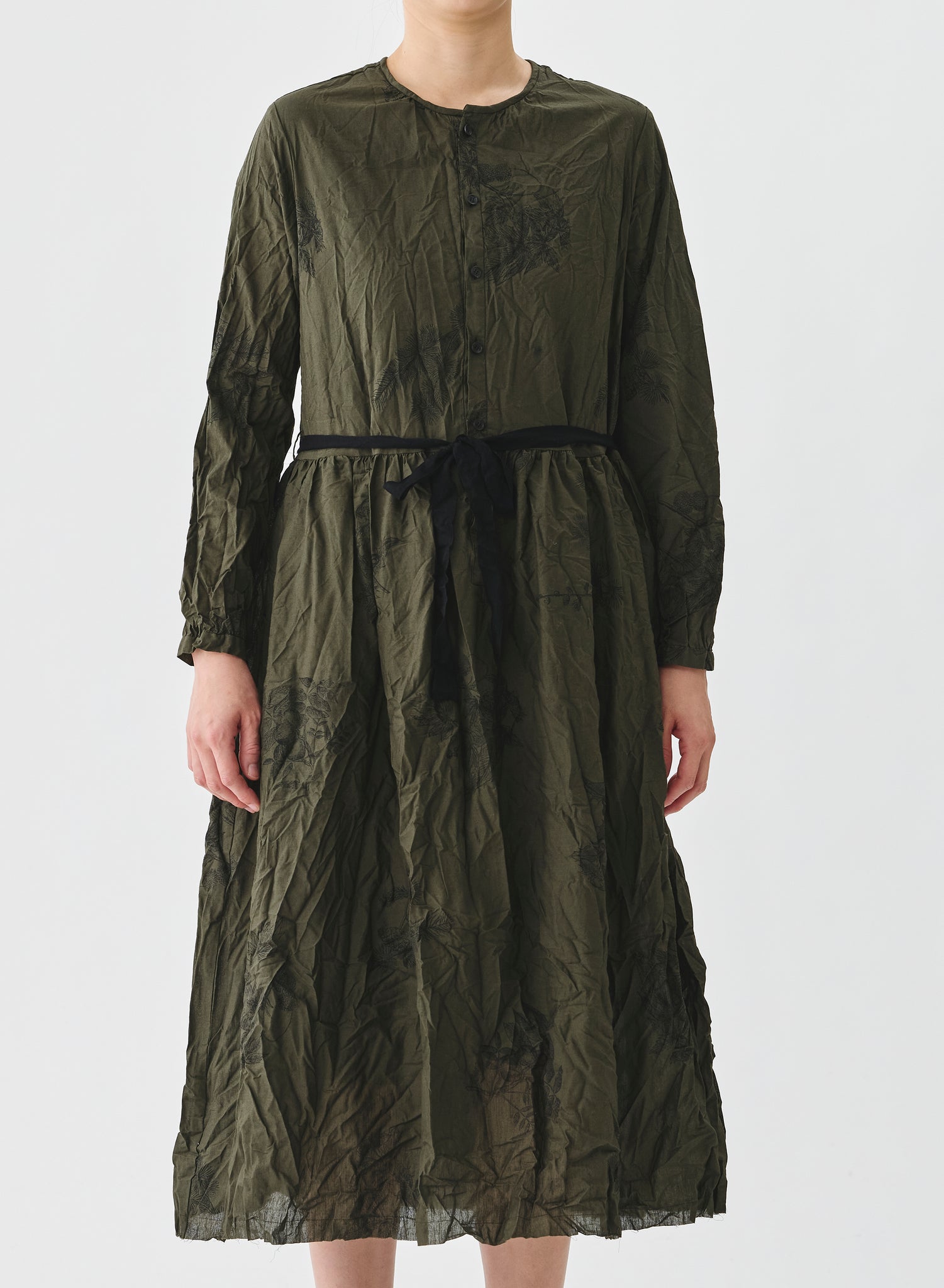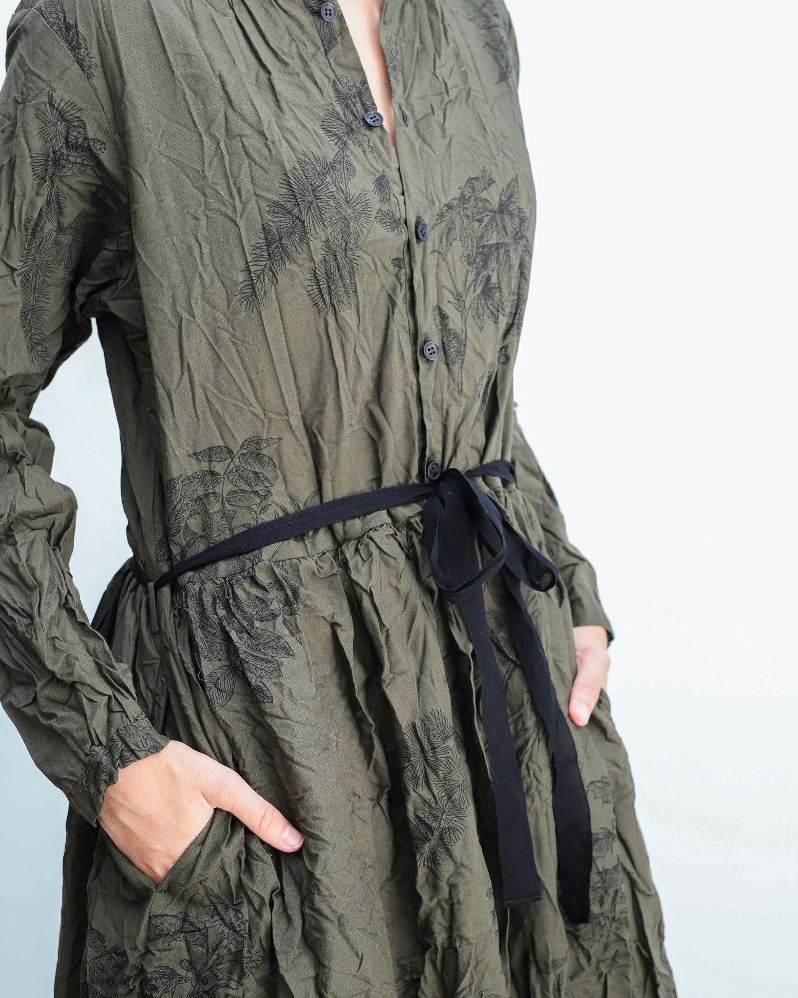 Vestido largo con tejido arrugado color verde kaki con estampado floral negro. Cuello redondo, abotonado delantero hasta la cintura y cinta para ajustar, bolsillos laterales.
