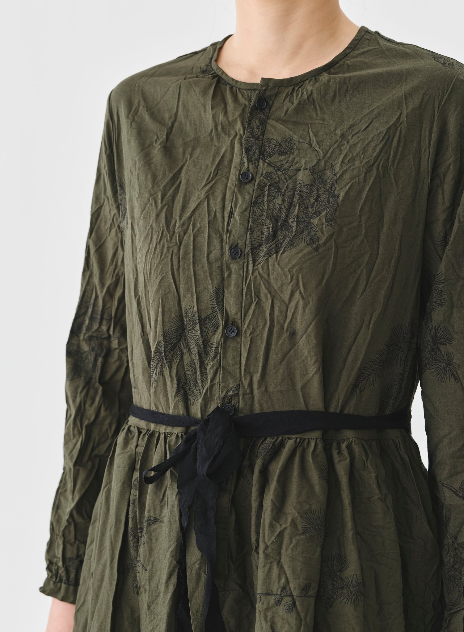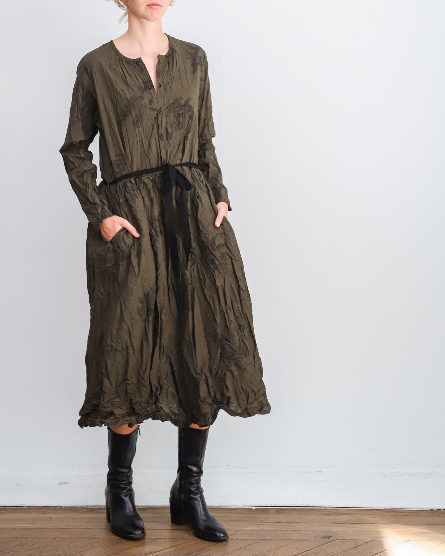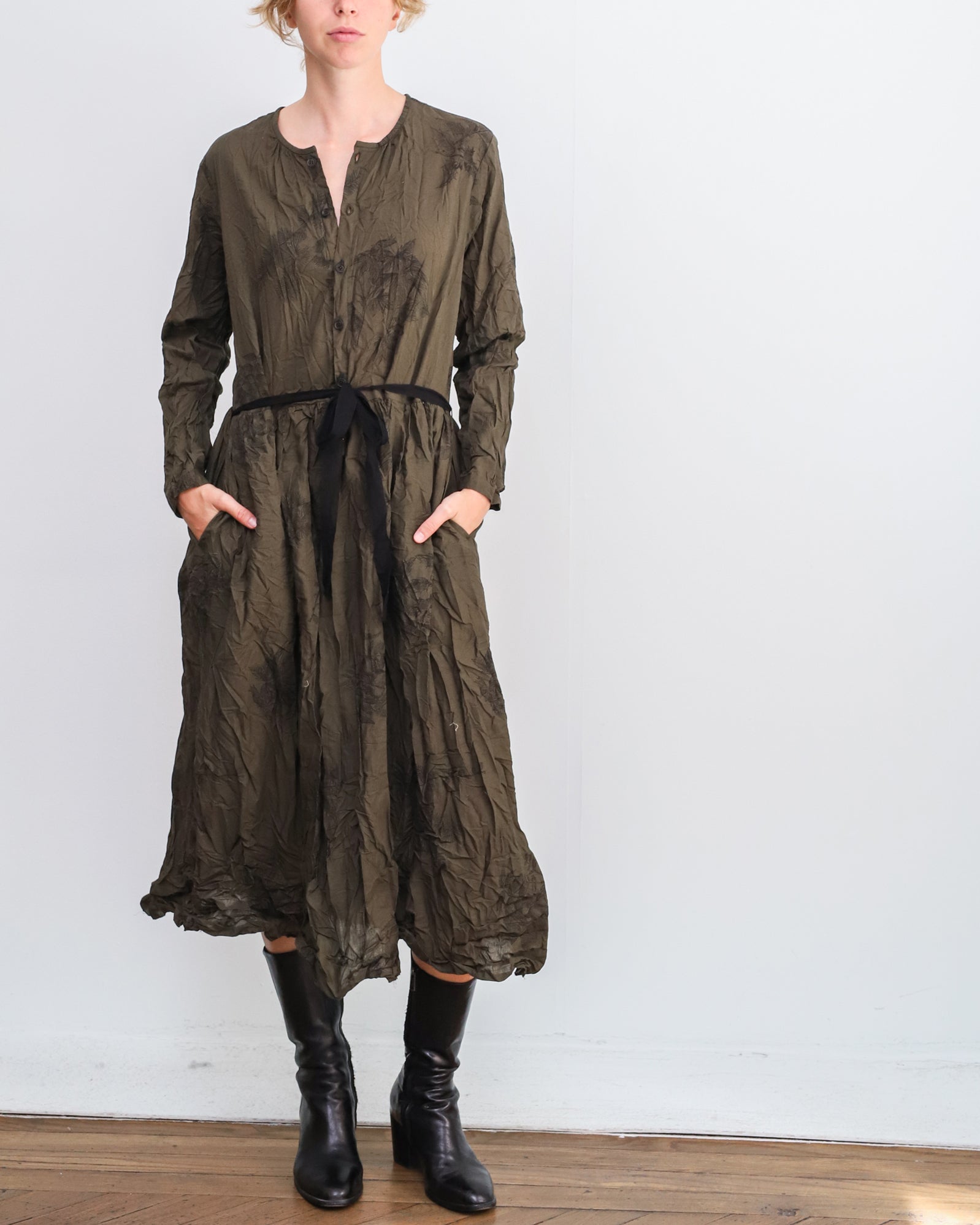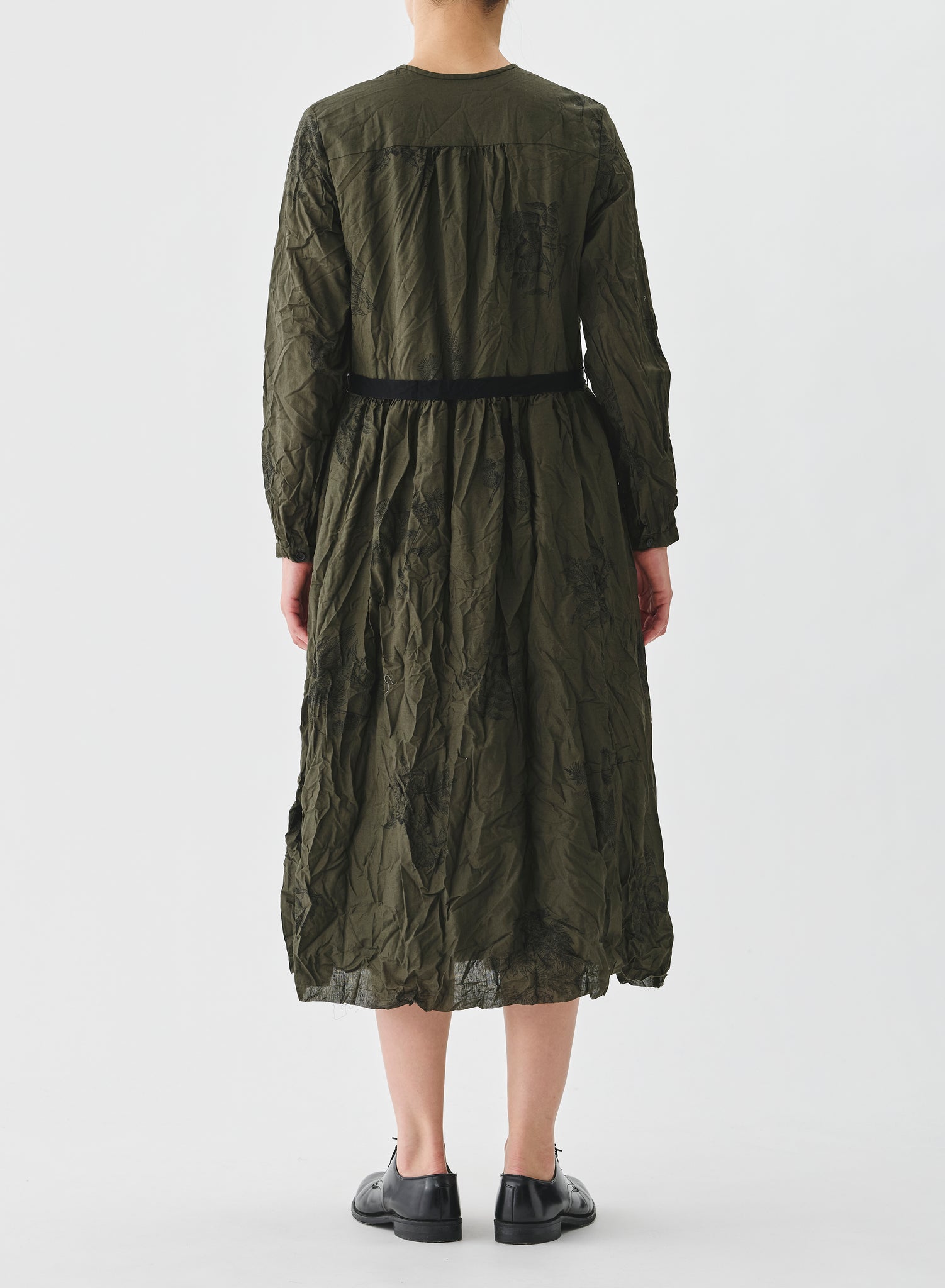 Vestido largo con tejido arrugado color verde kaki con estampado floral negro. Cuello redondo, abotonado delantero hasta la cintura y cinta para ajustar, bolsillos laterales.