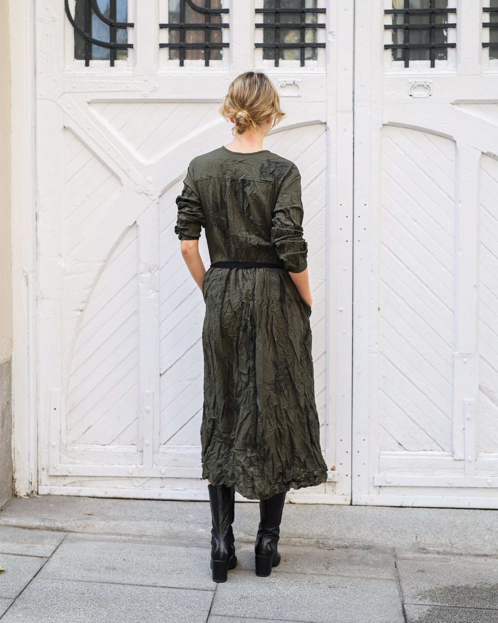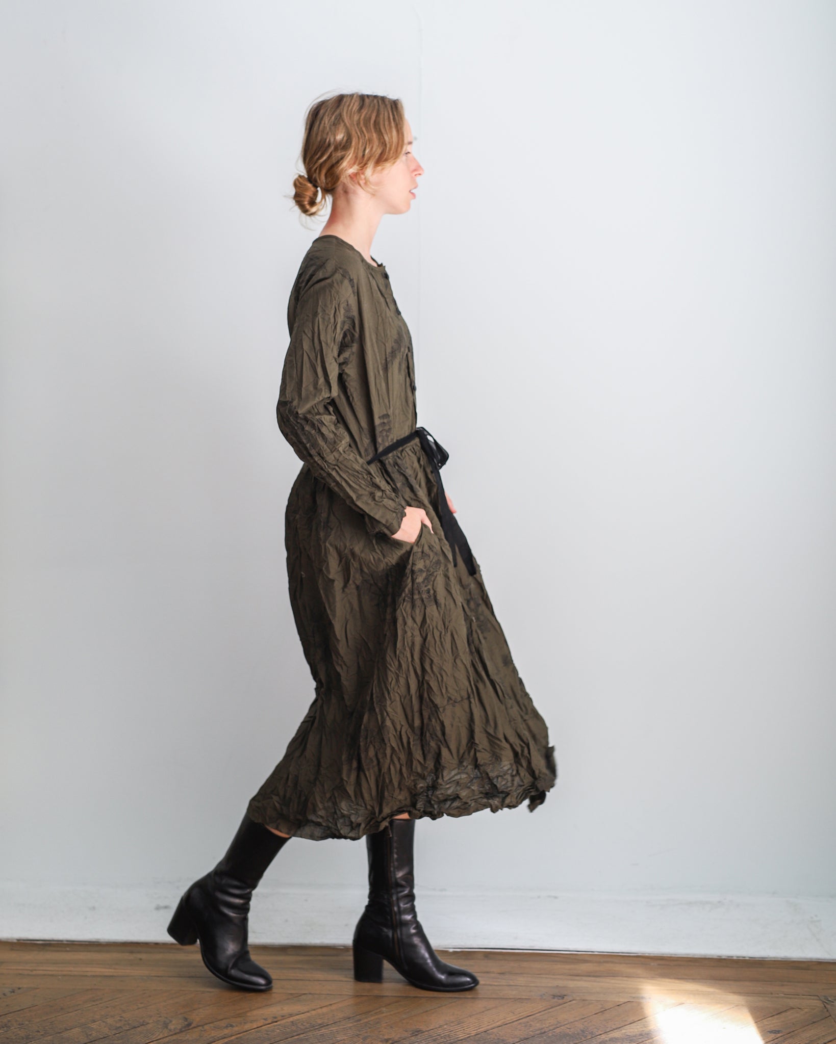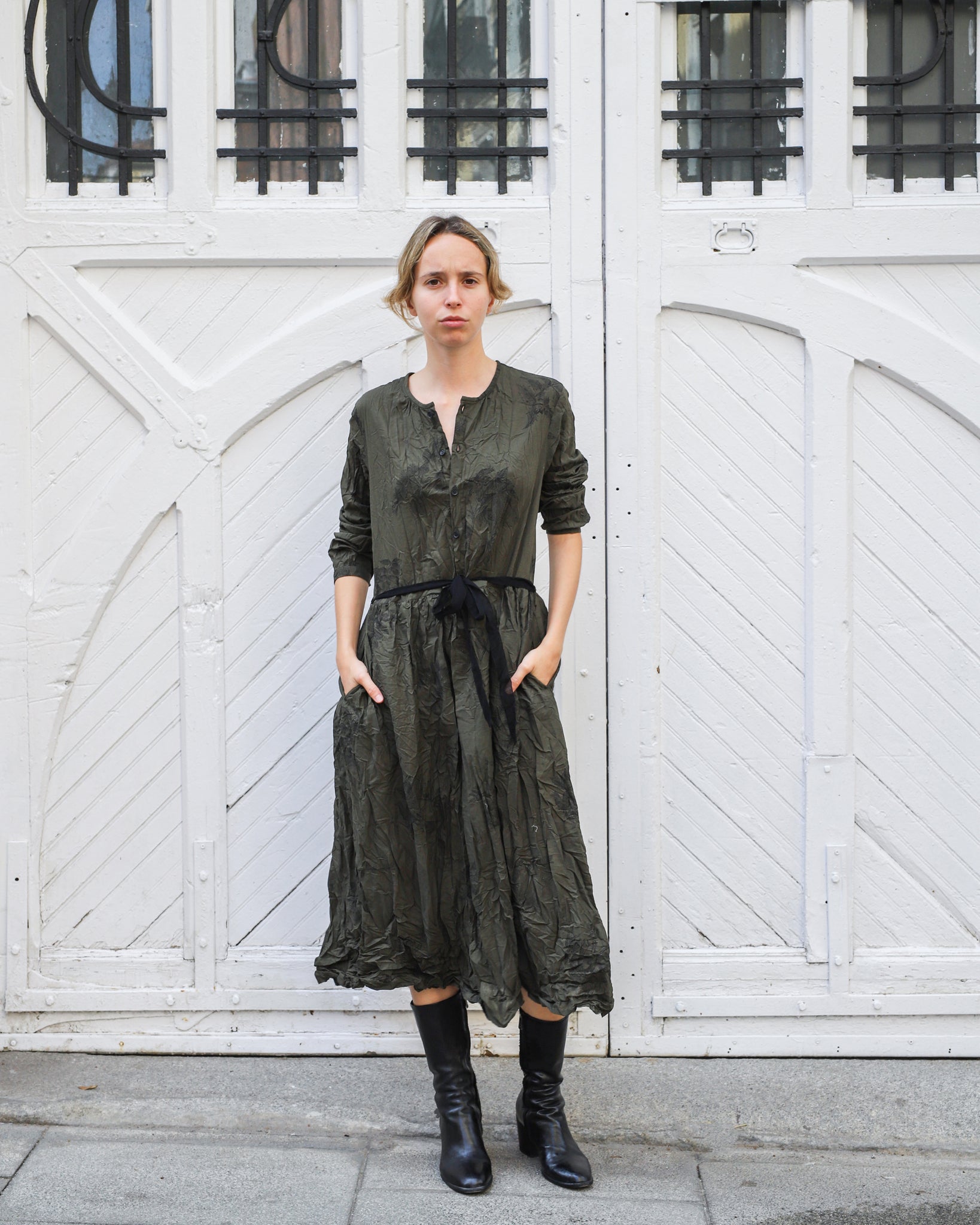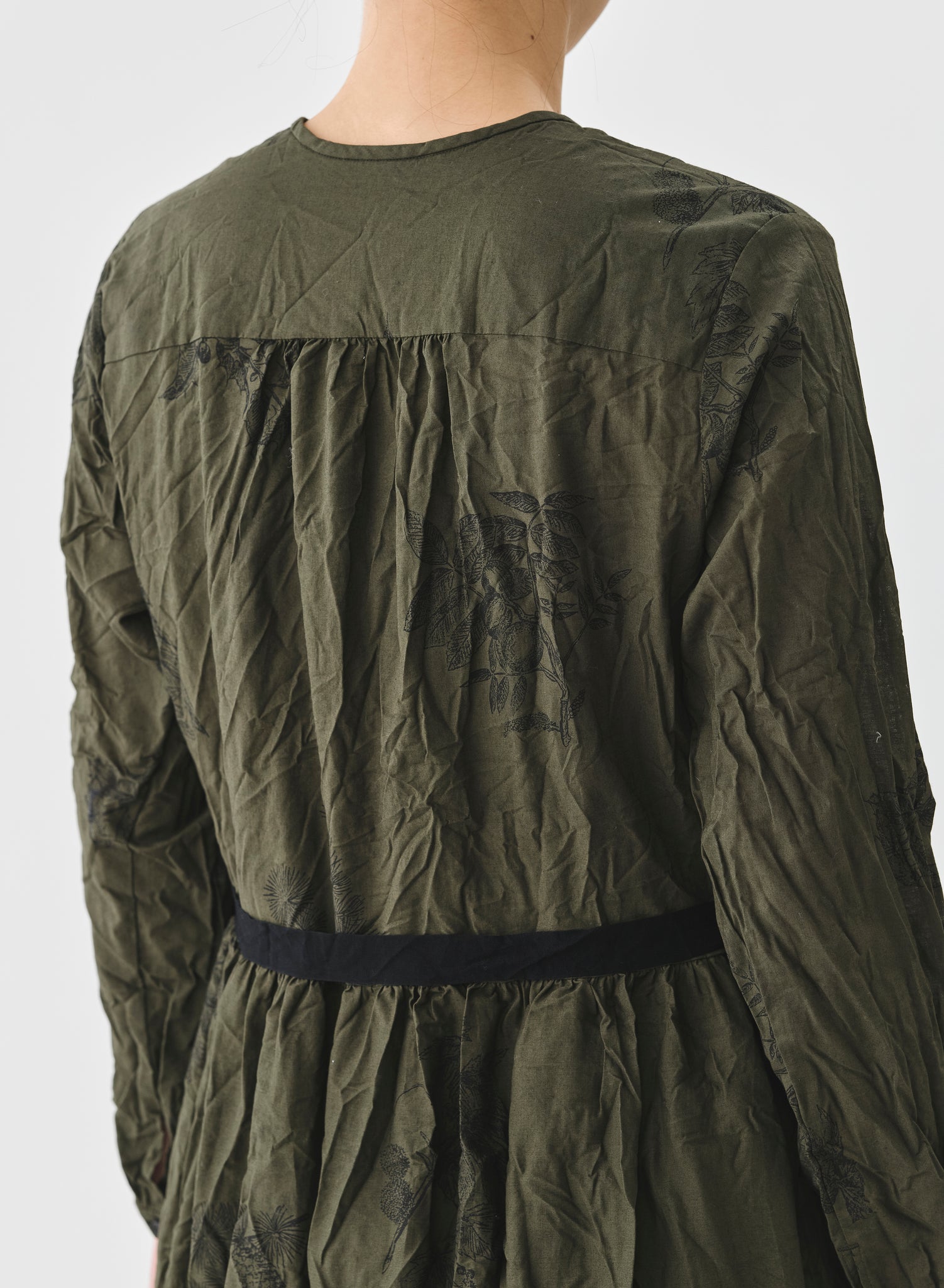 Vestido largo con tejido arrugado color verde kaki con estampado floral negro. Cuello redondo, abotonado delantero hasta la cintura y cinta para ajustar, bolsillos laterales.