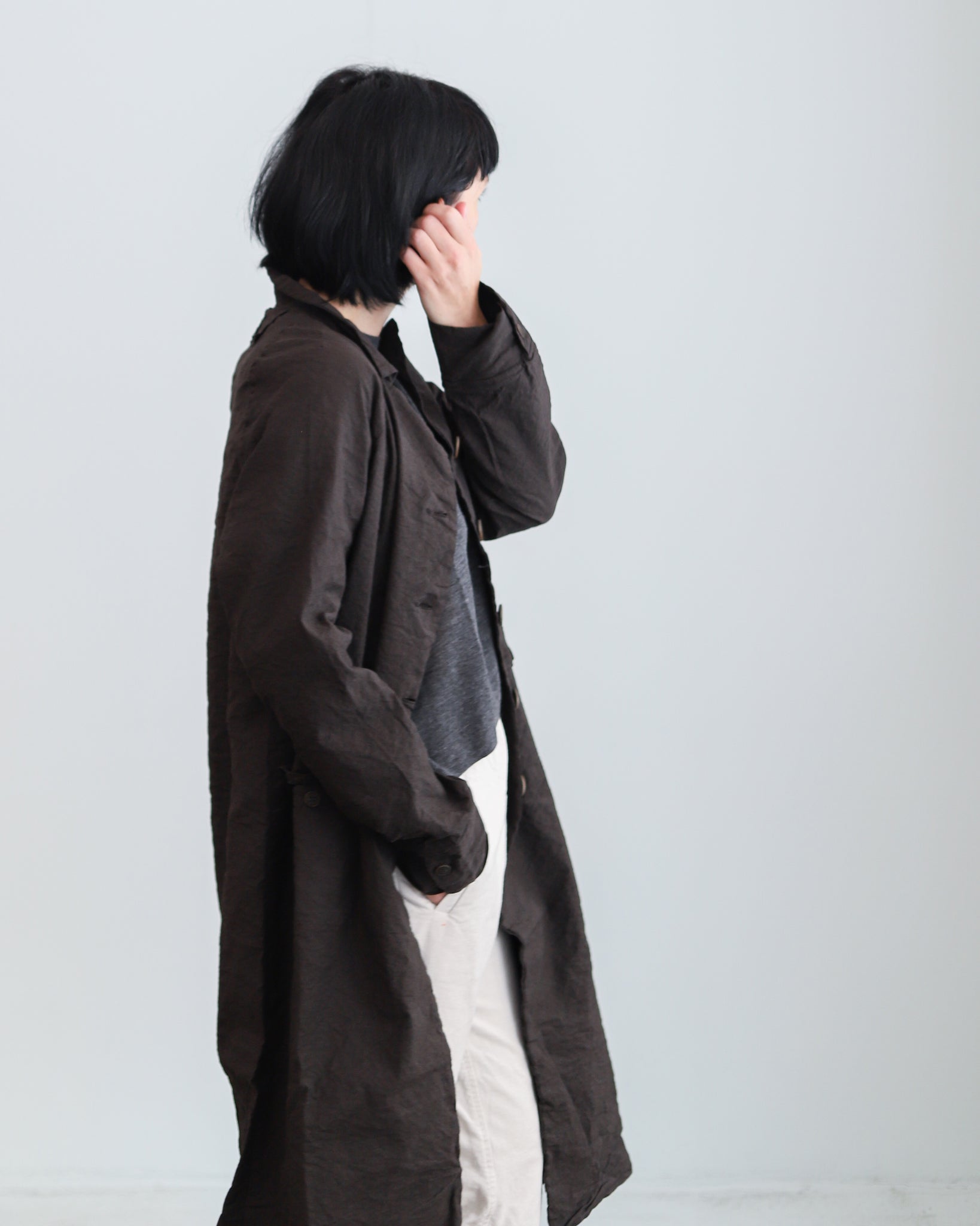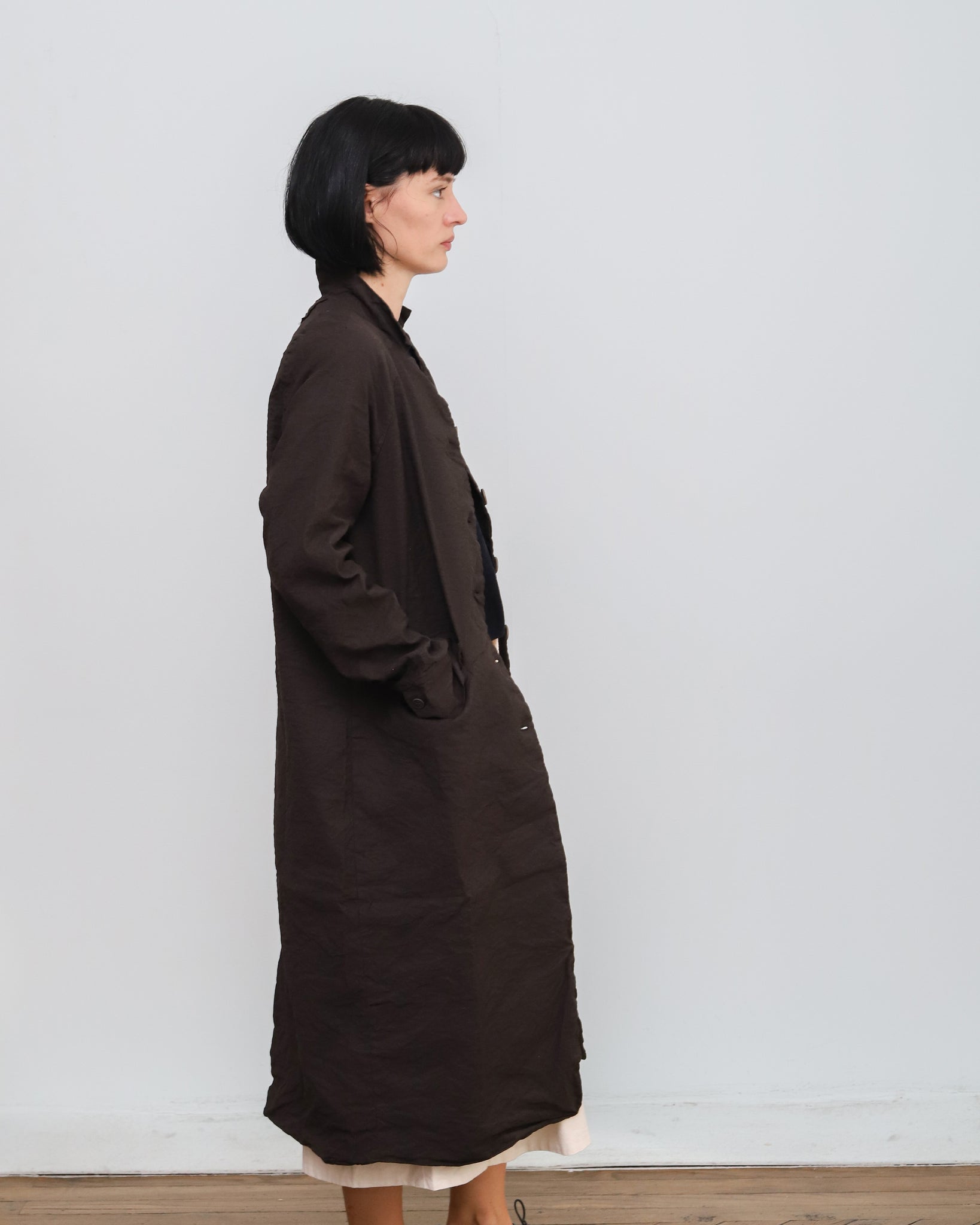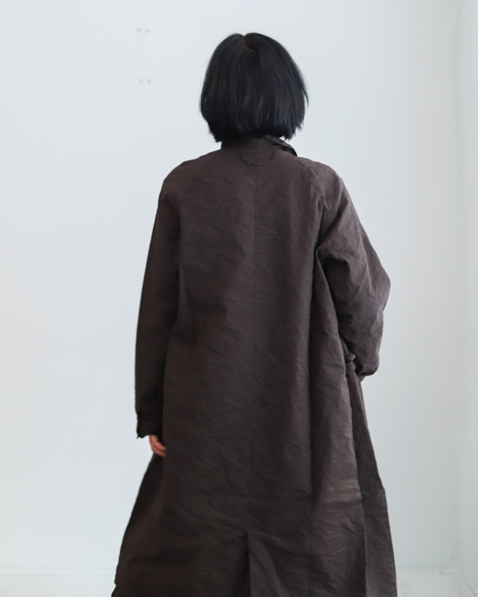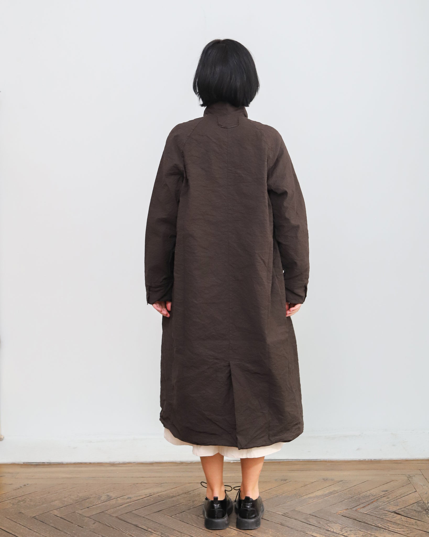 Abrigo marrón con cuello camisero, manga ranglan, abotonado y bolsillos delanteros, abertura en la espalda.