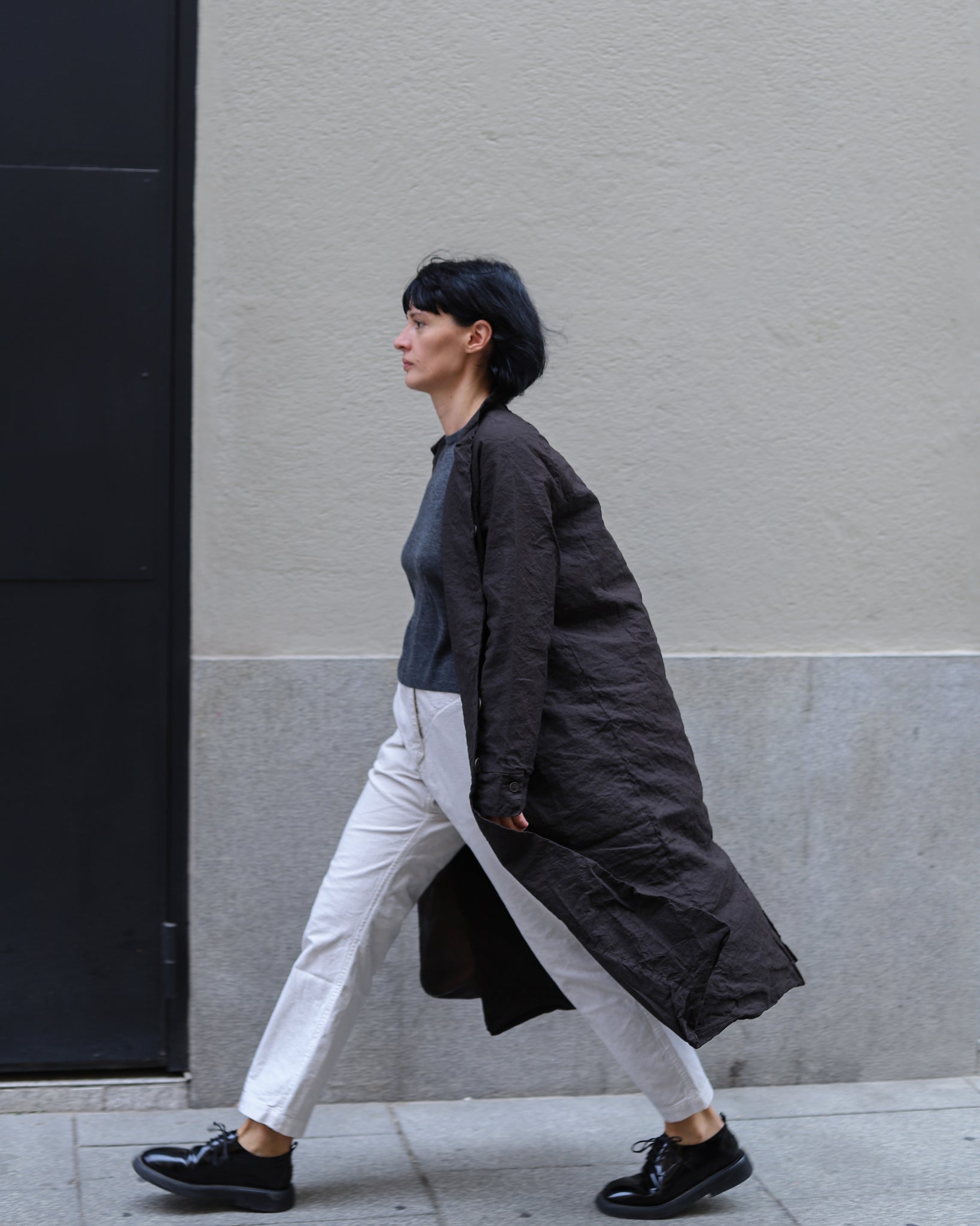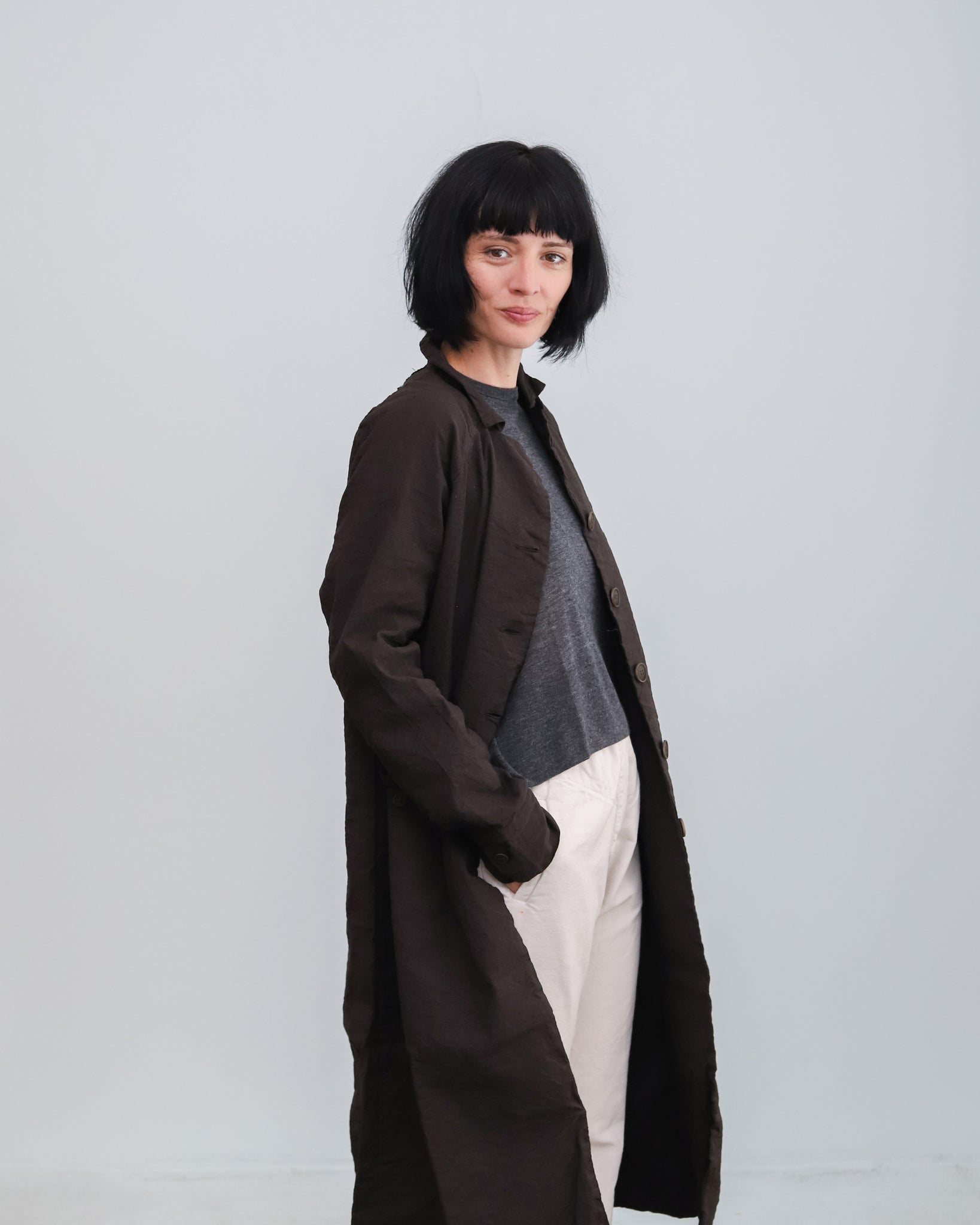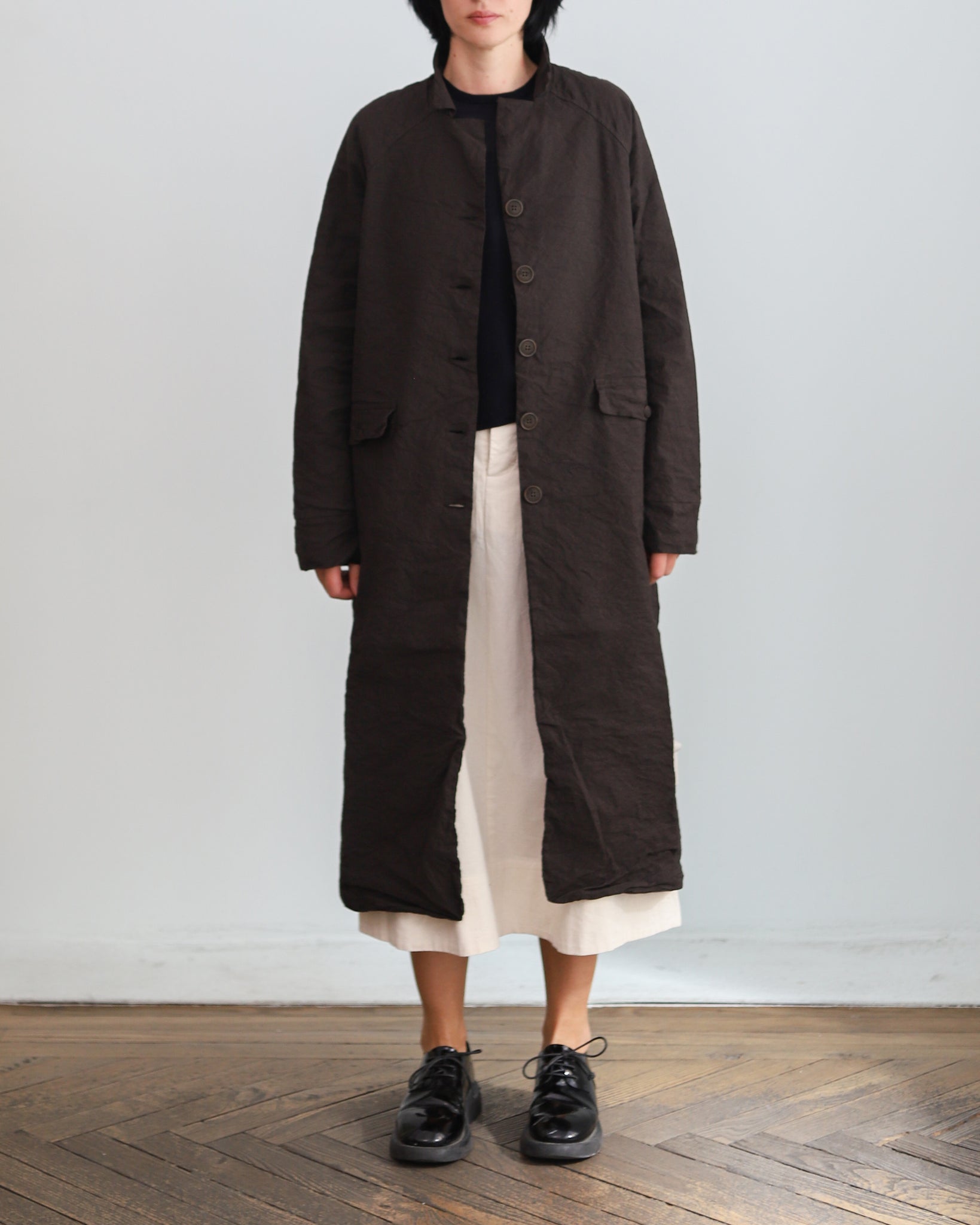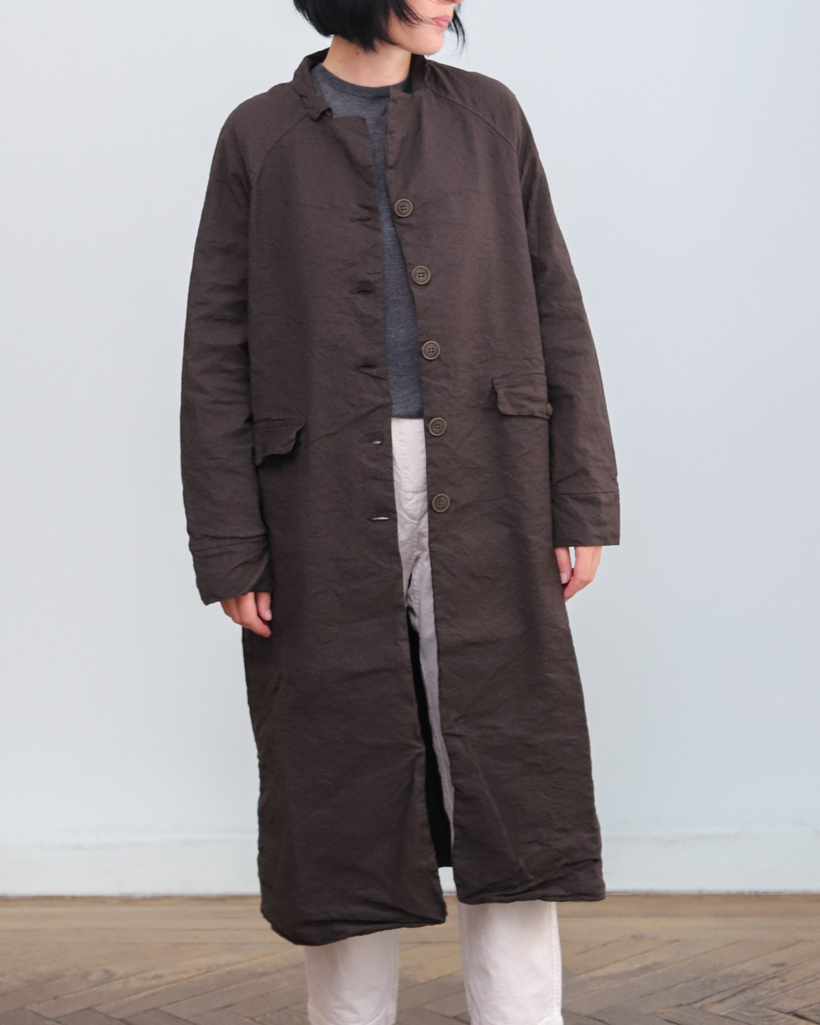 Abrigo marrón con cuello camisero, manga ranglan, abotonado y bolsillos delanteros, abertura en la espalda.