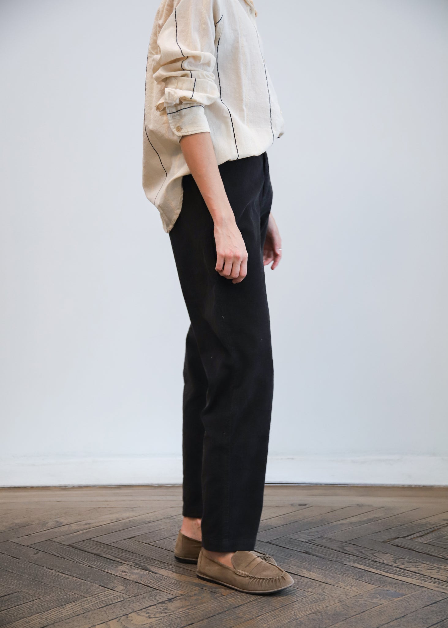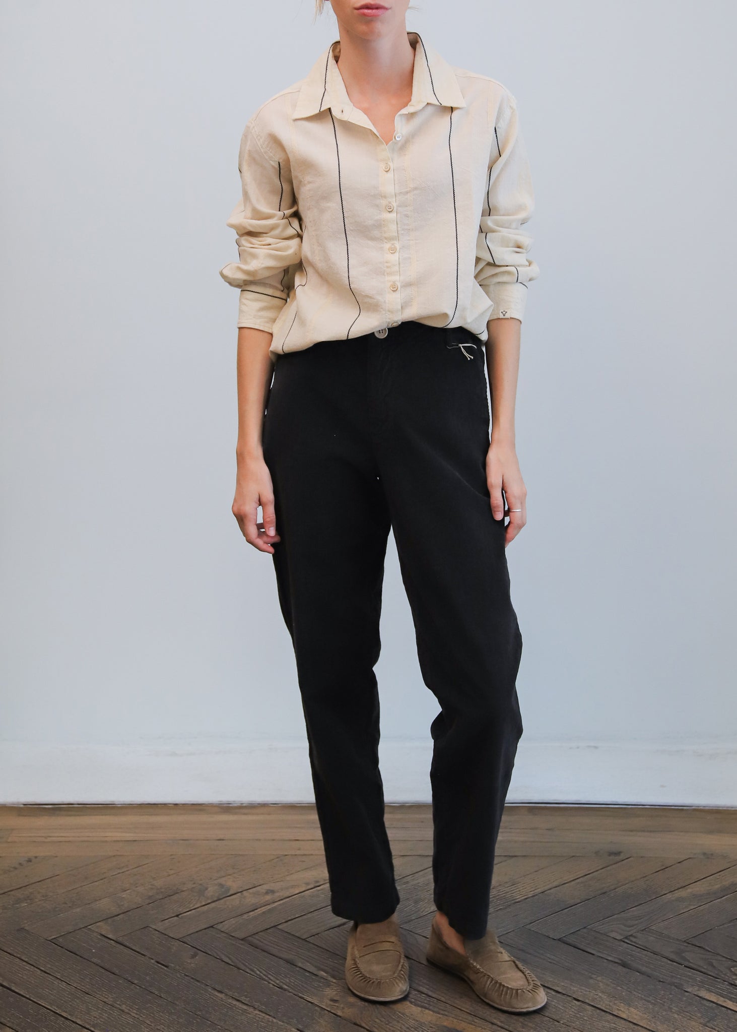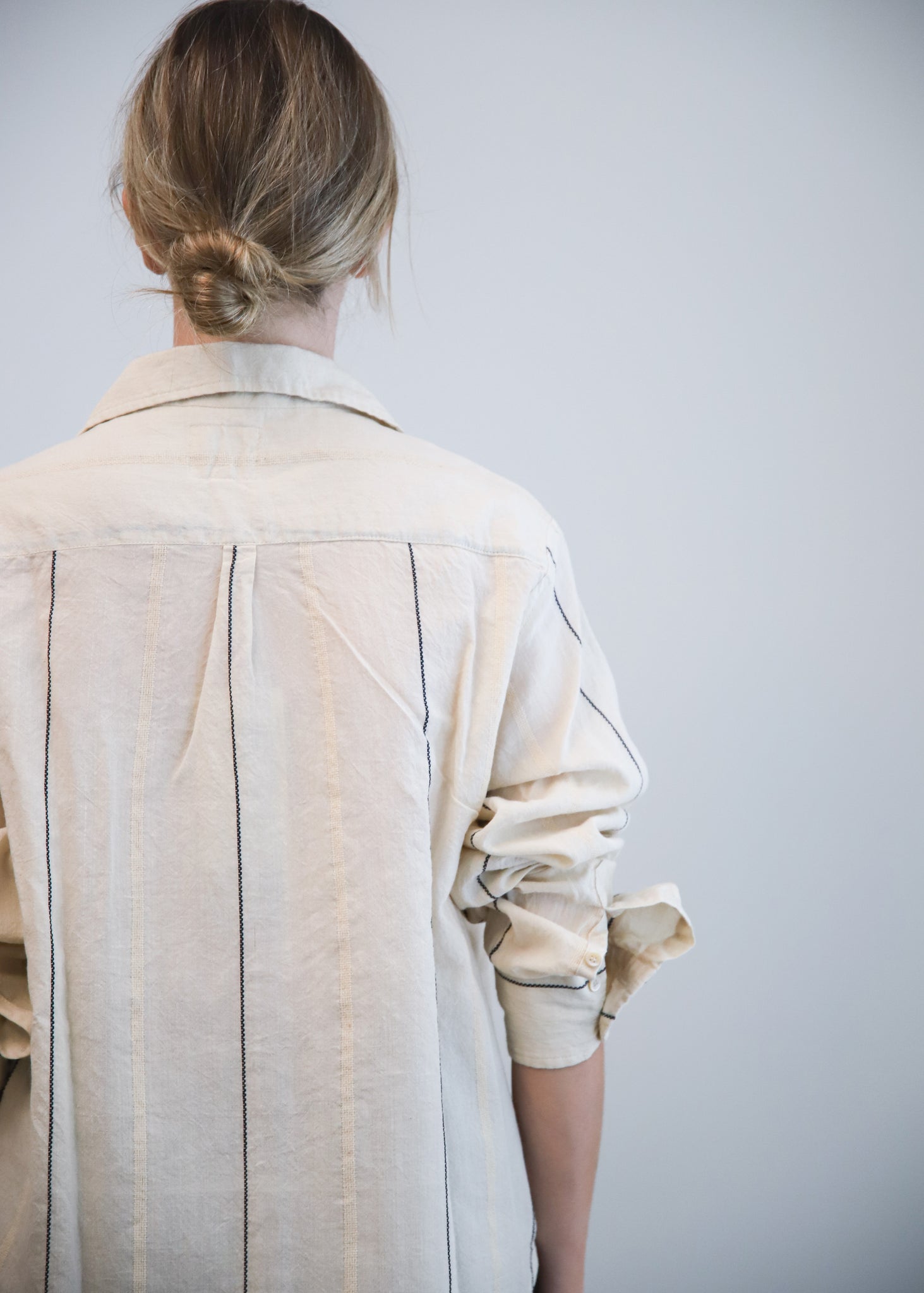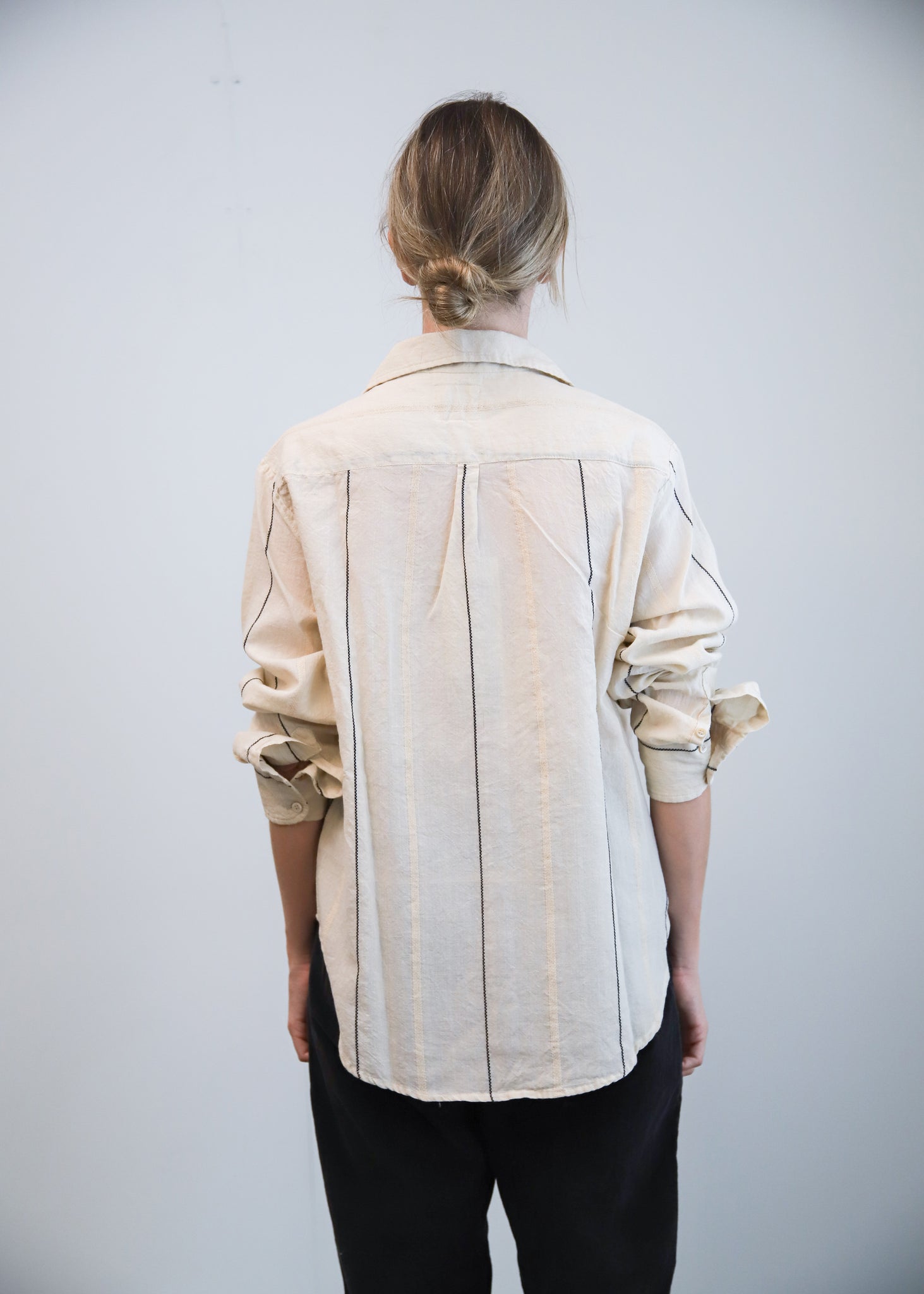 Camisa de algodón color crudo con rayas negras. Cuello camisero con abotonado delantero. De corte clásico.