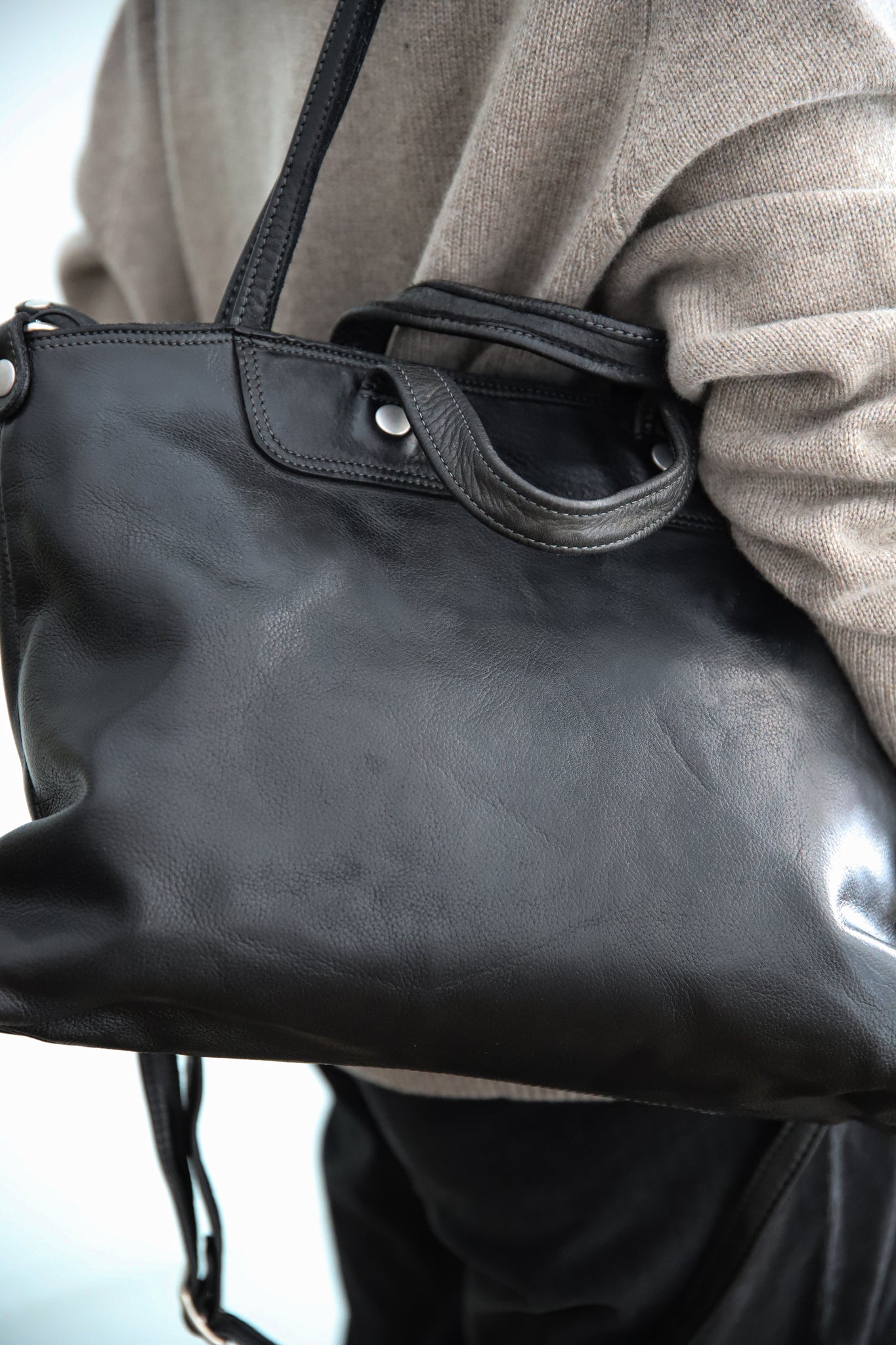 Bolso de piel color negro. Cierre con cremallera, asas para llevar en la mano, asas para llevar en el hombro y asa larga ajustable para llevar tipo bandolera. Interior forrado, bolsillo para móvil y bolsillo con cremallera.
