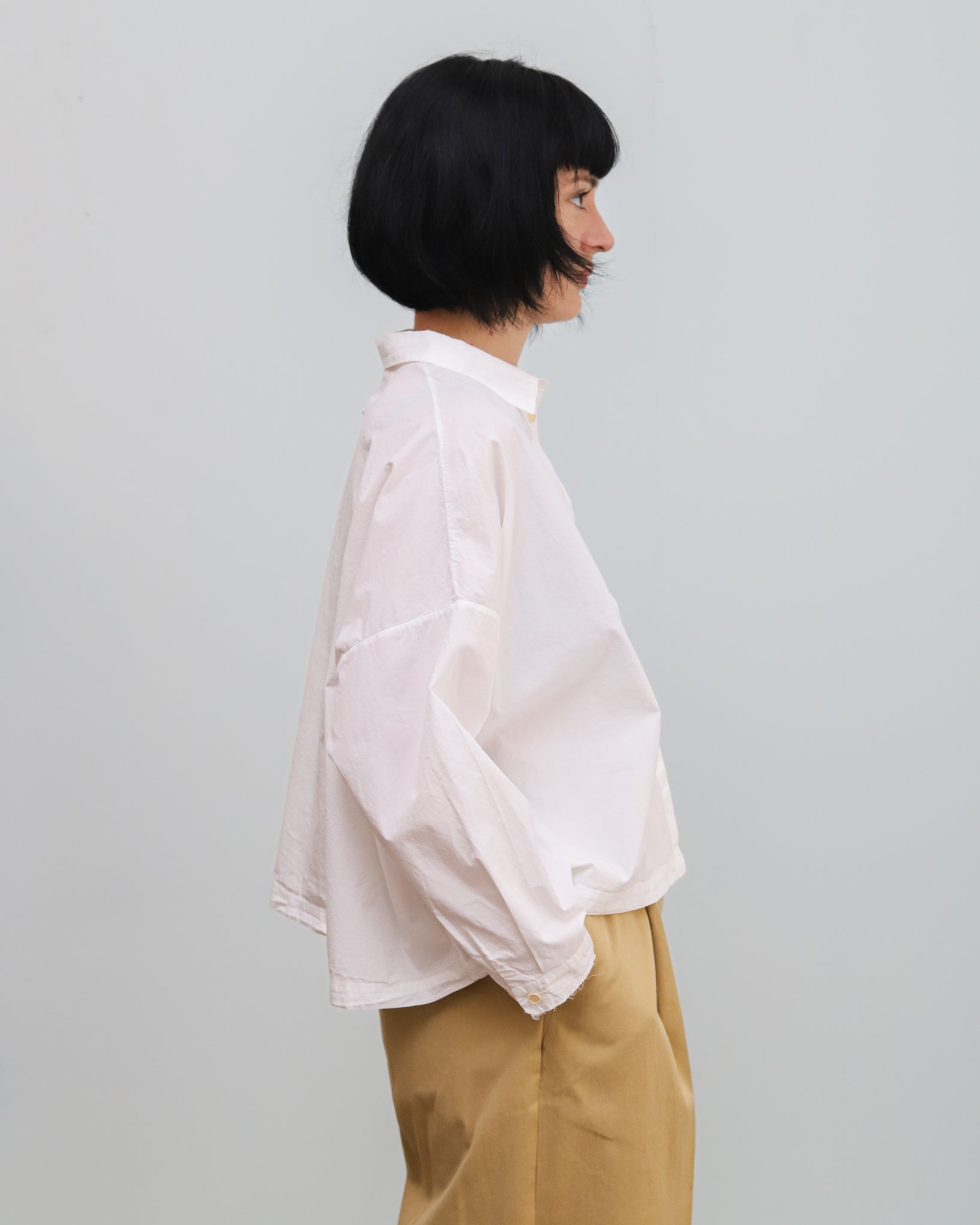 Camisa de algodón color blanco. Cuello camisero, abotonado delantero oculto con tapeta, de corte ancho.