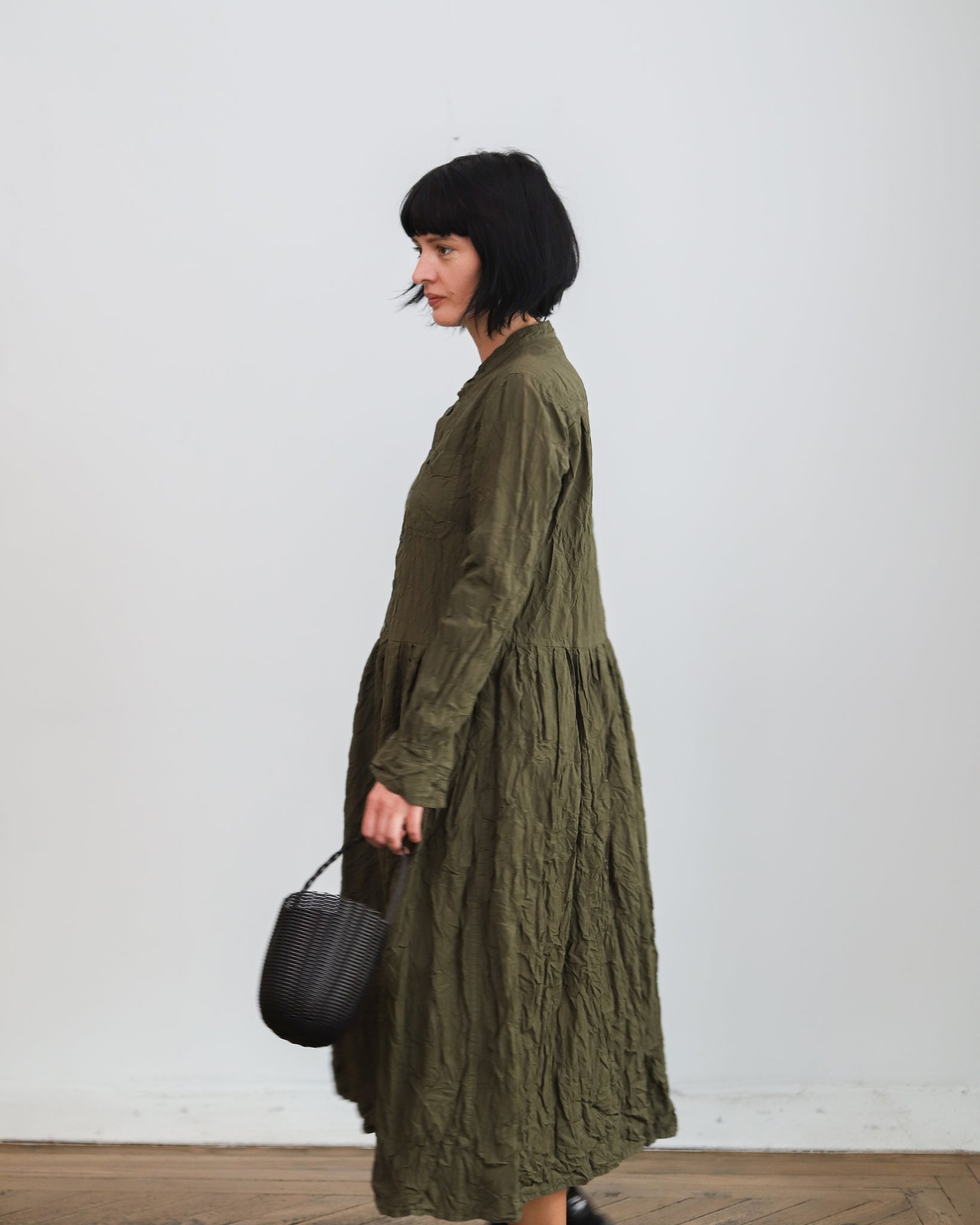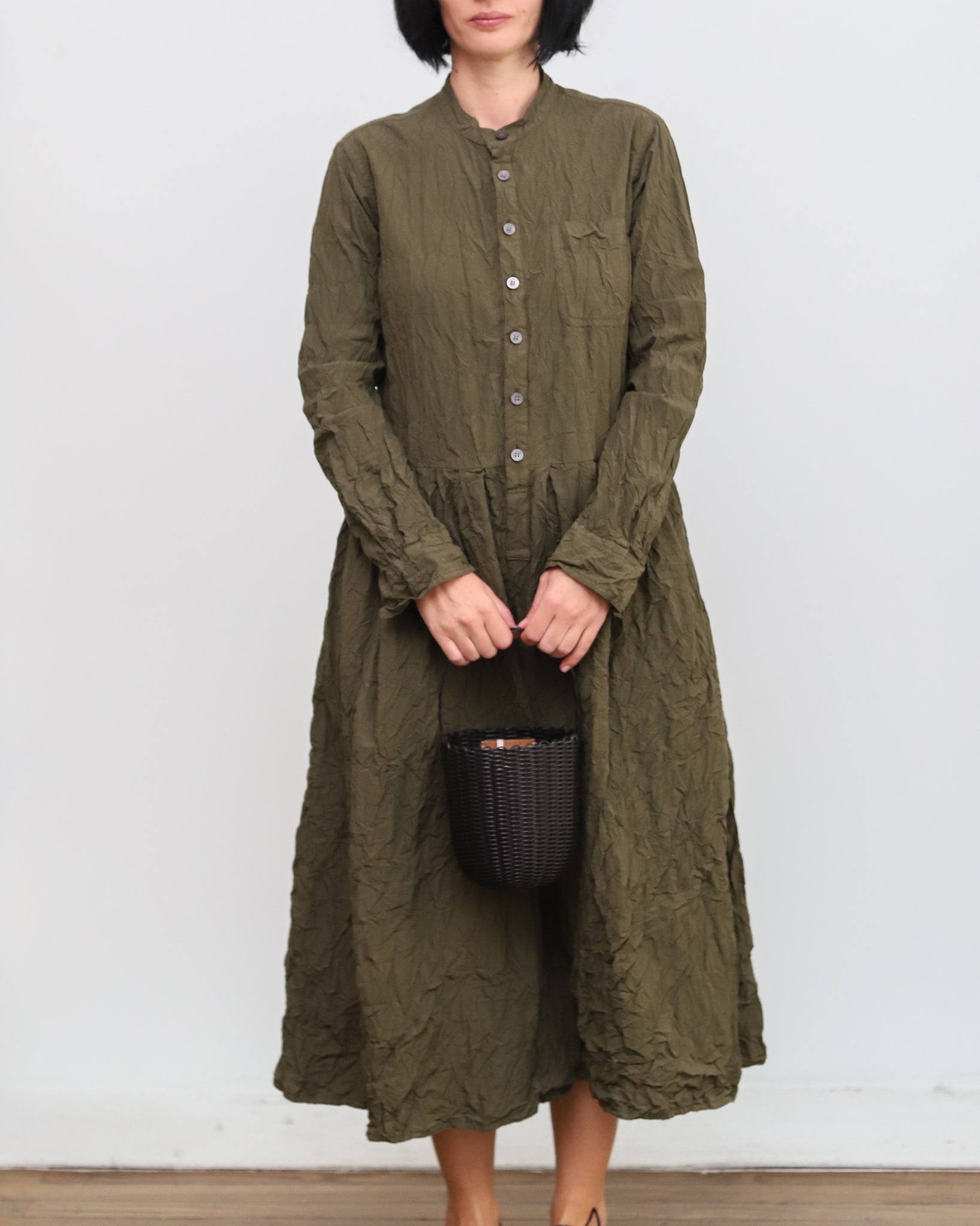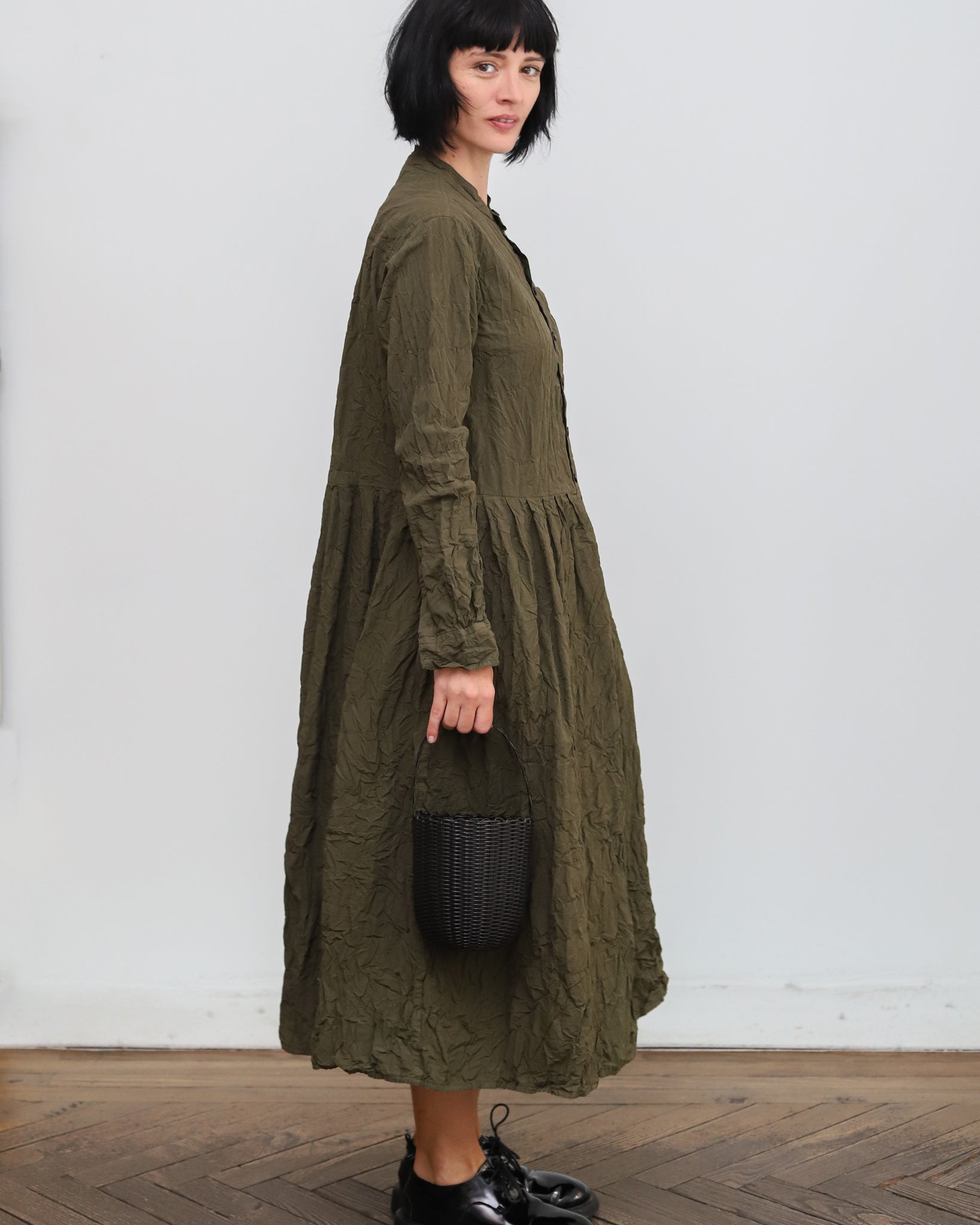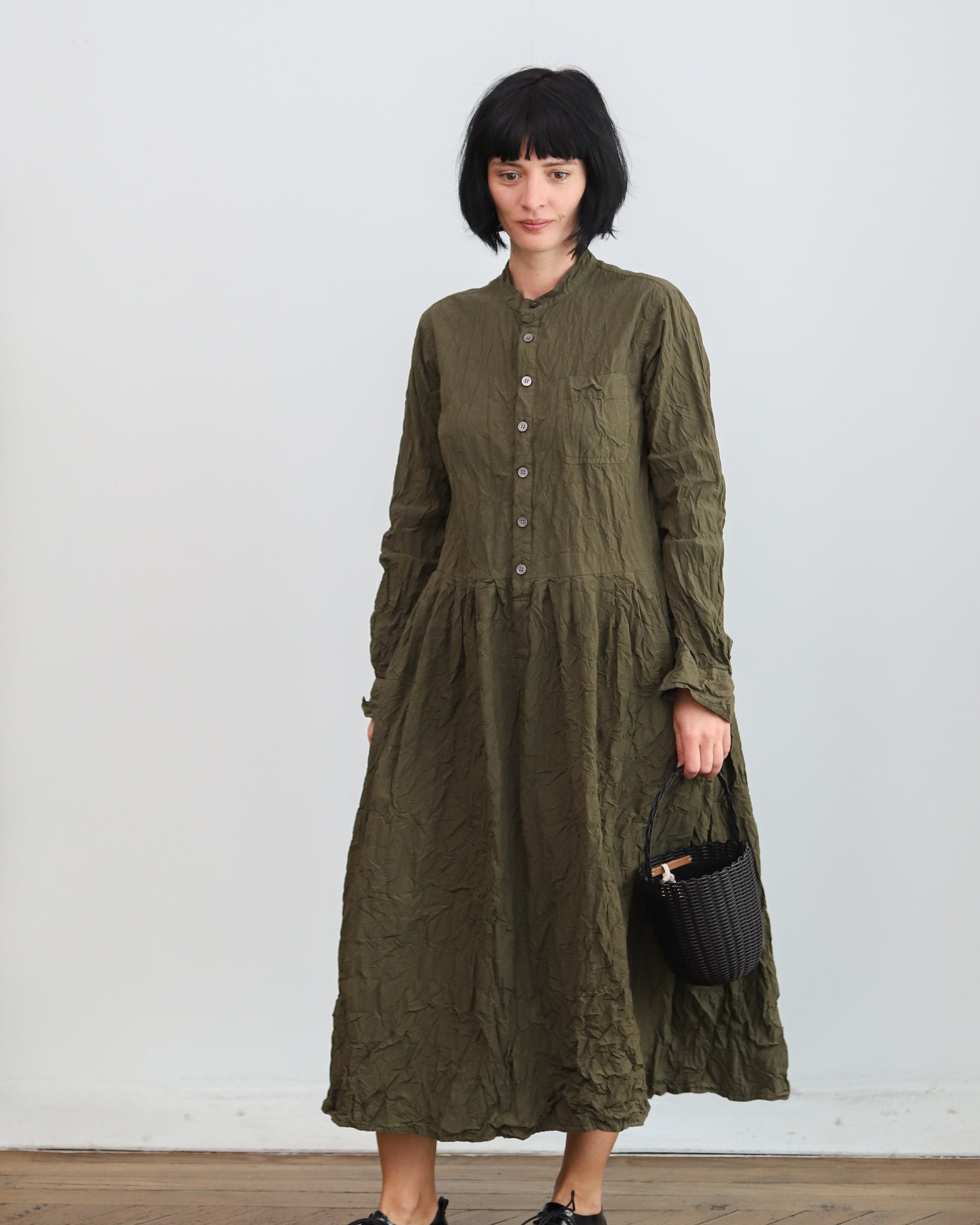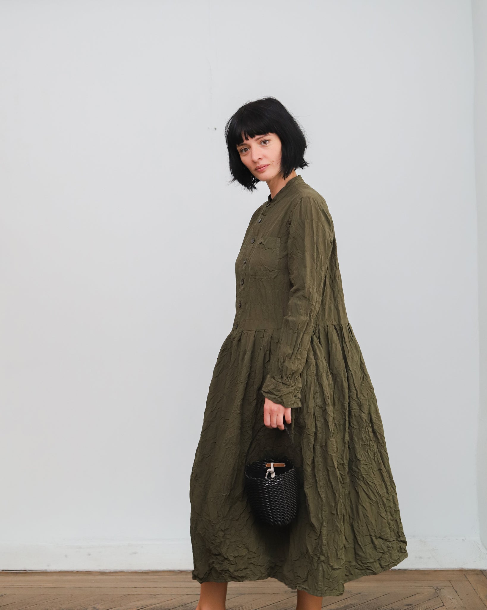 Vestido largo de algodón con efecto arrugado color verde kaki. Cuello mao, abotonado delantero hasta la cintura, bolsillo frontal y bolsillos laterales.