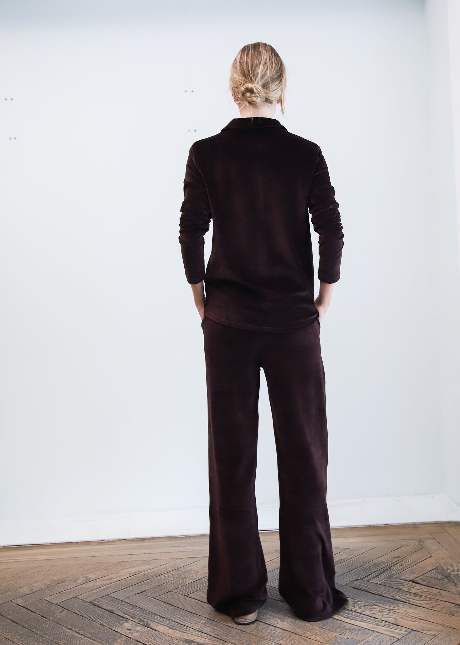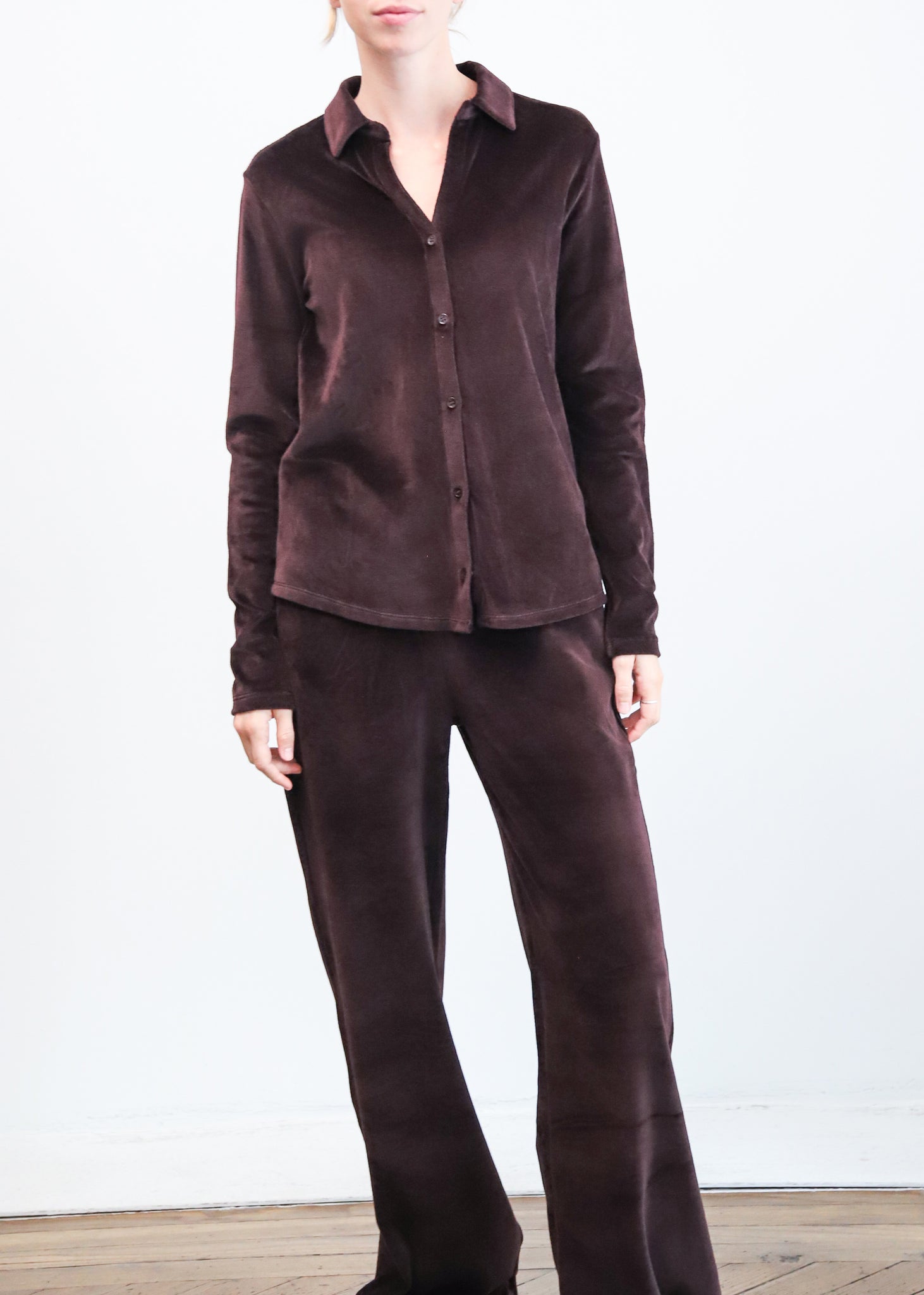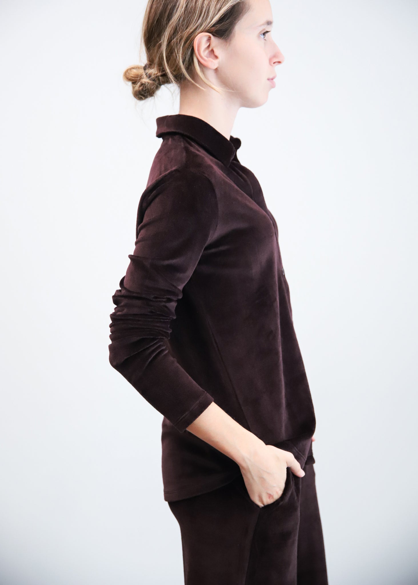 Camisa de manga larga color berenjena en terciopelo de algodón. Cuello camisero y abotonado delantero.