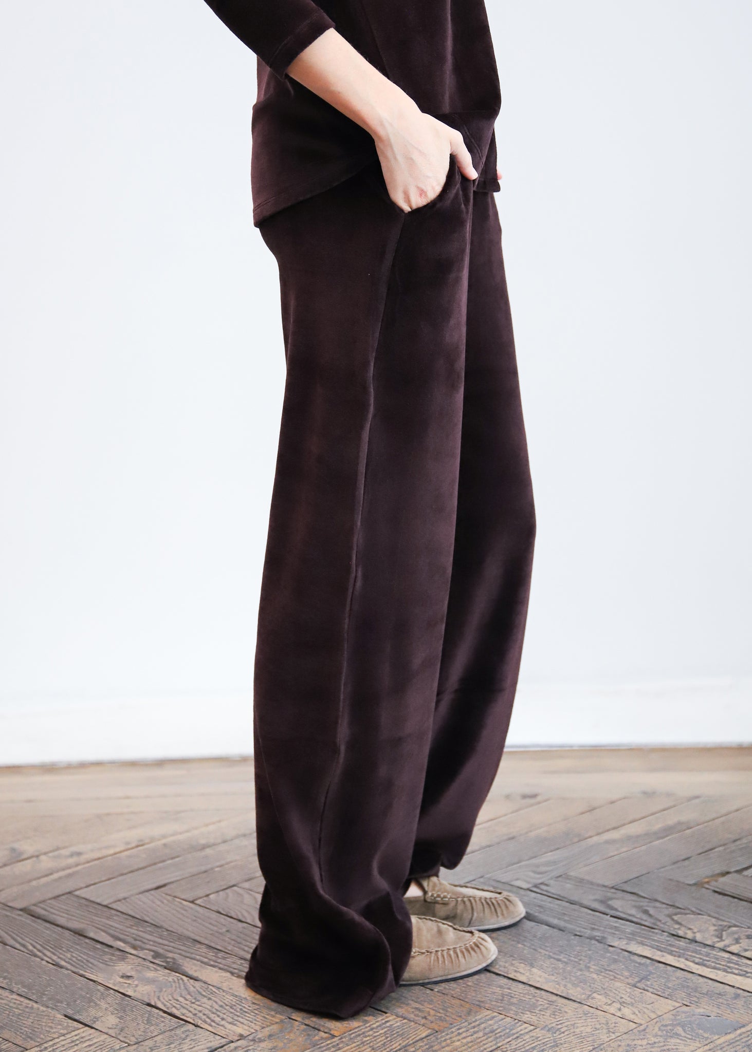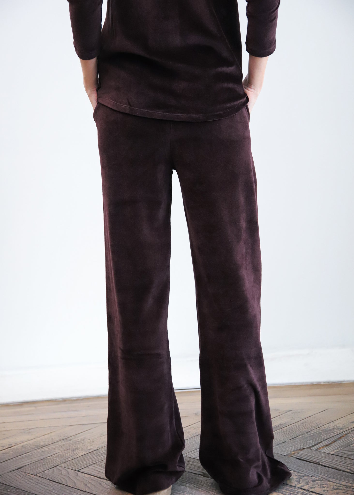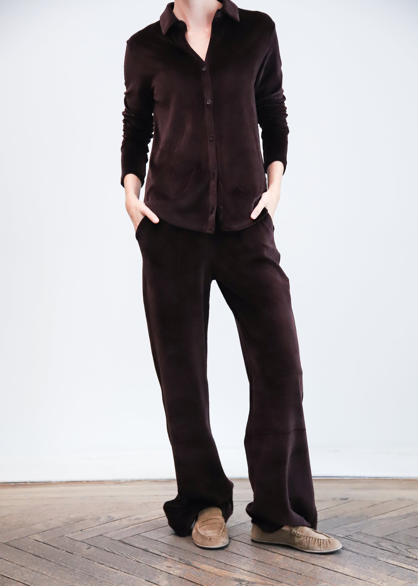 Camisa de manga larga color berenjena en terciopelo de algodón. Cuello camisero y abotonado delantero.