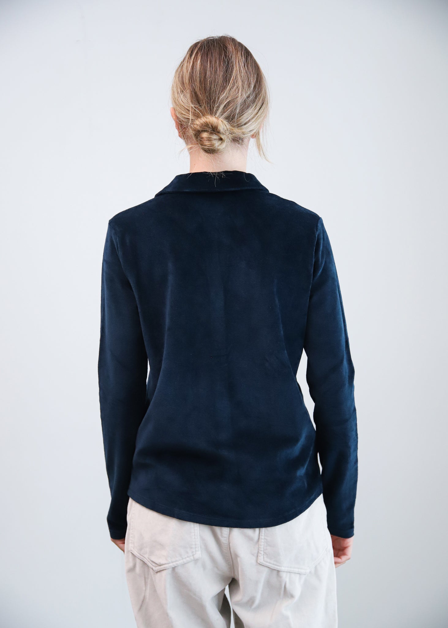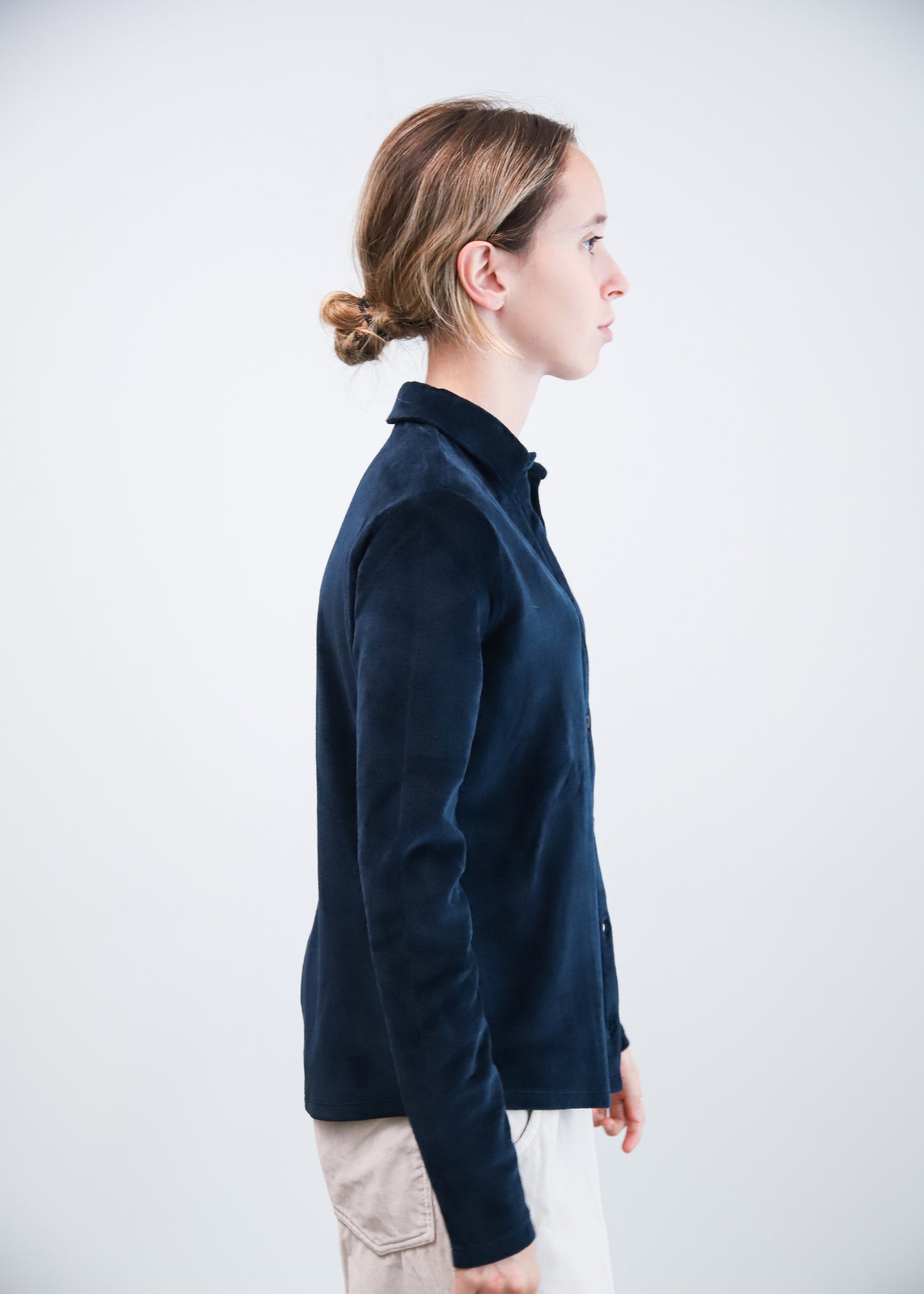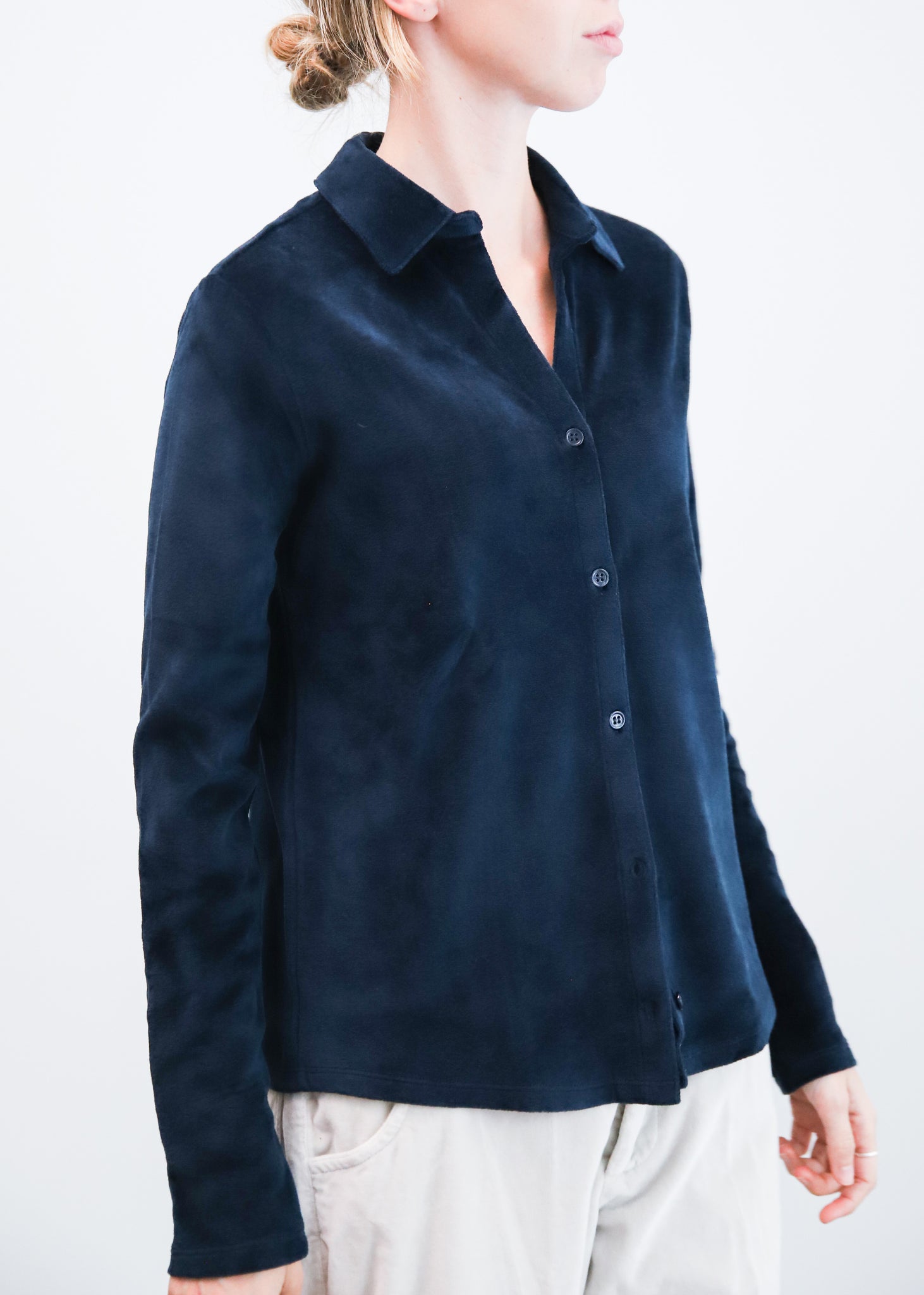 Camisa de manga larga color azul marino en terciopelo de algodón. Cuello camisero y abotonado delantero.