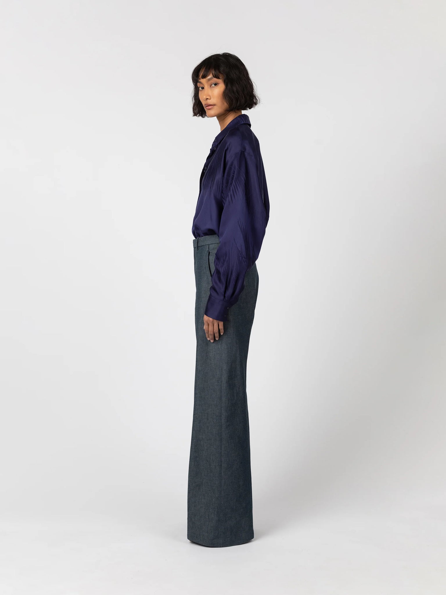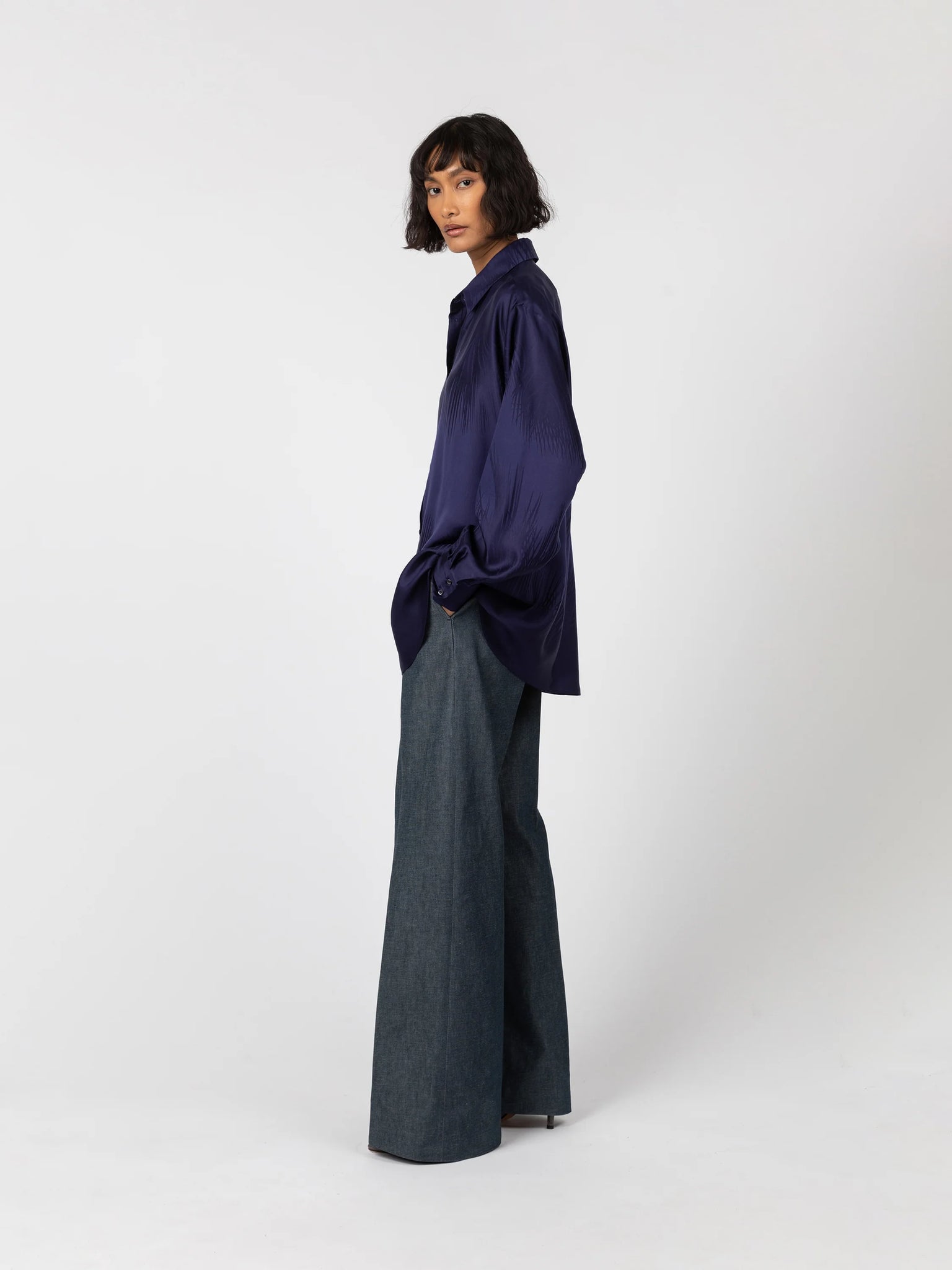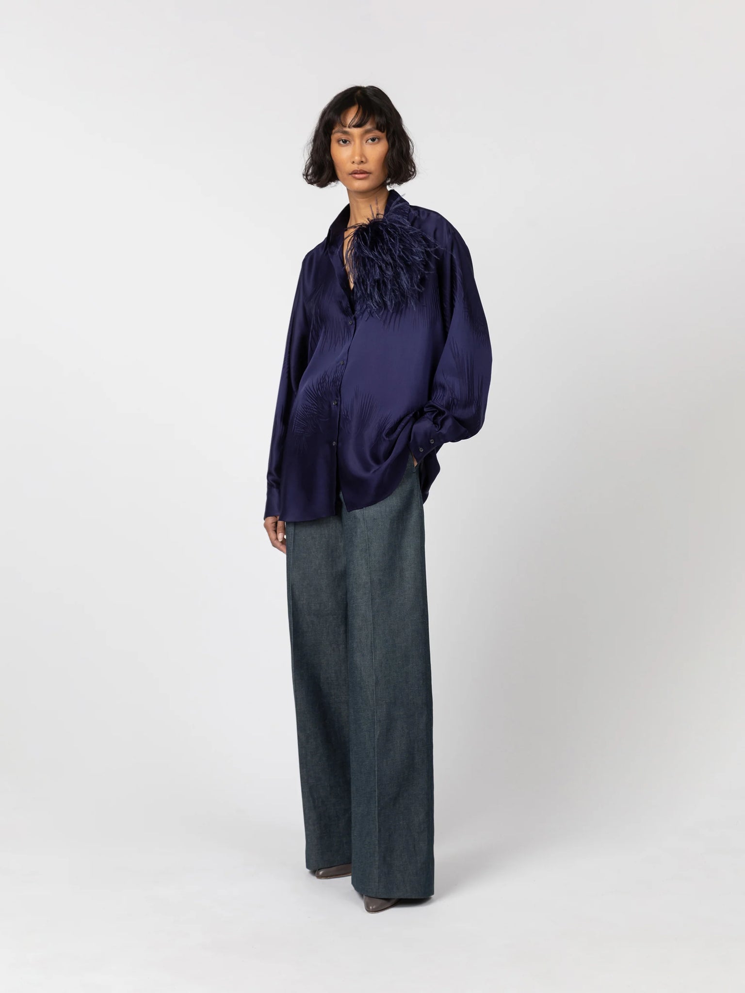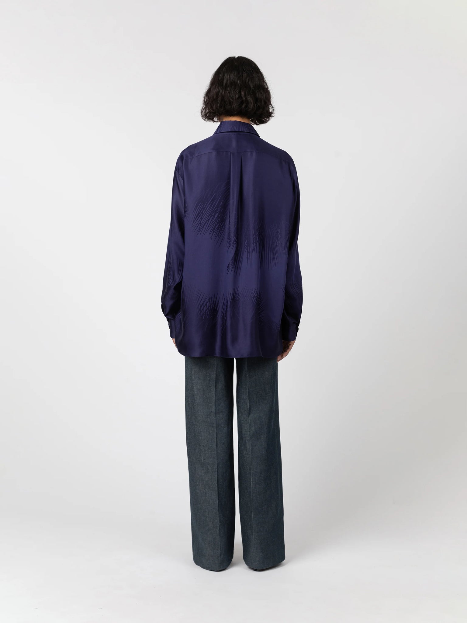 Camisa de corte oversize en tejido jacquard de seda y viscosa con detalle de palmeras. Cuello camisero con abotonado delantero.