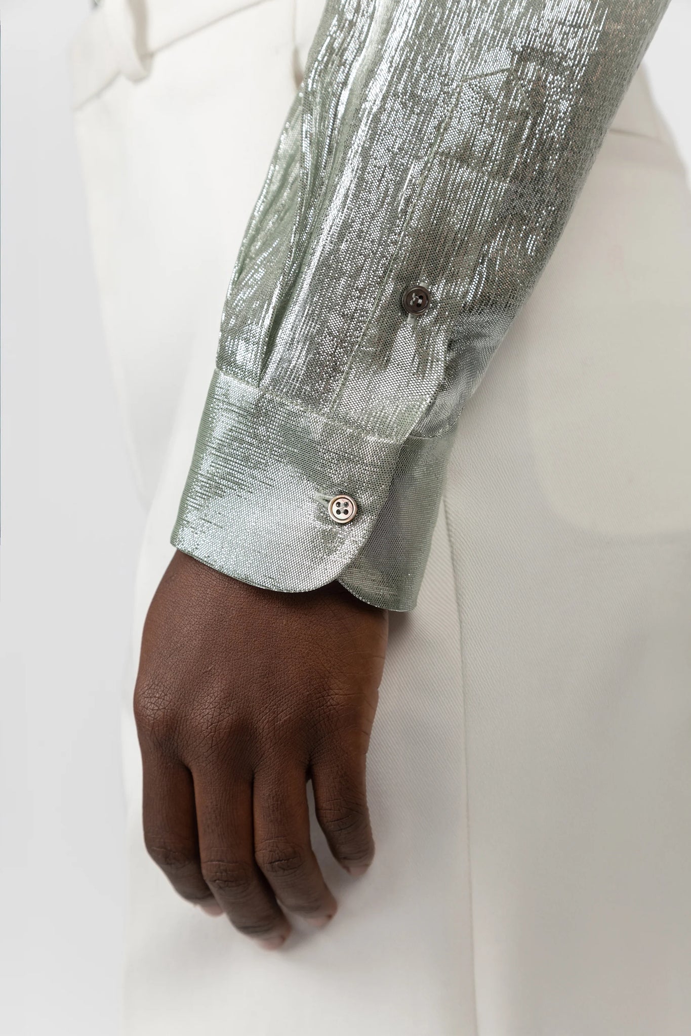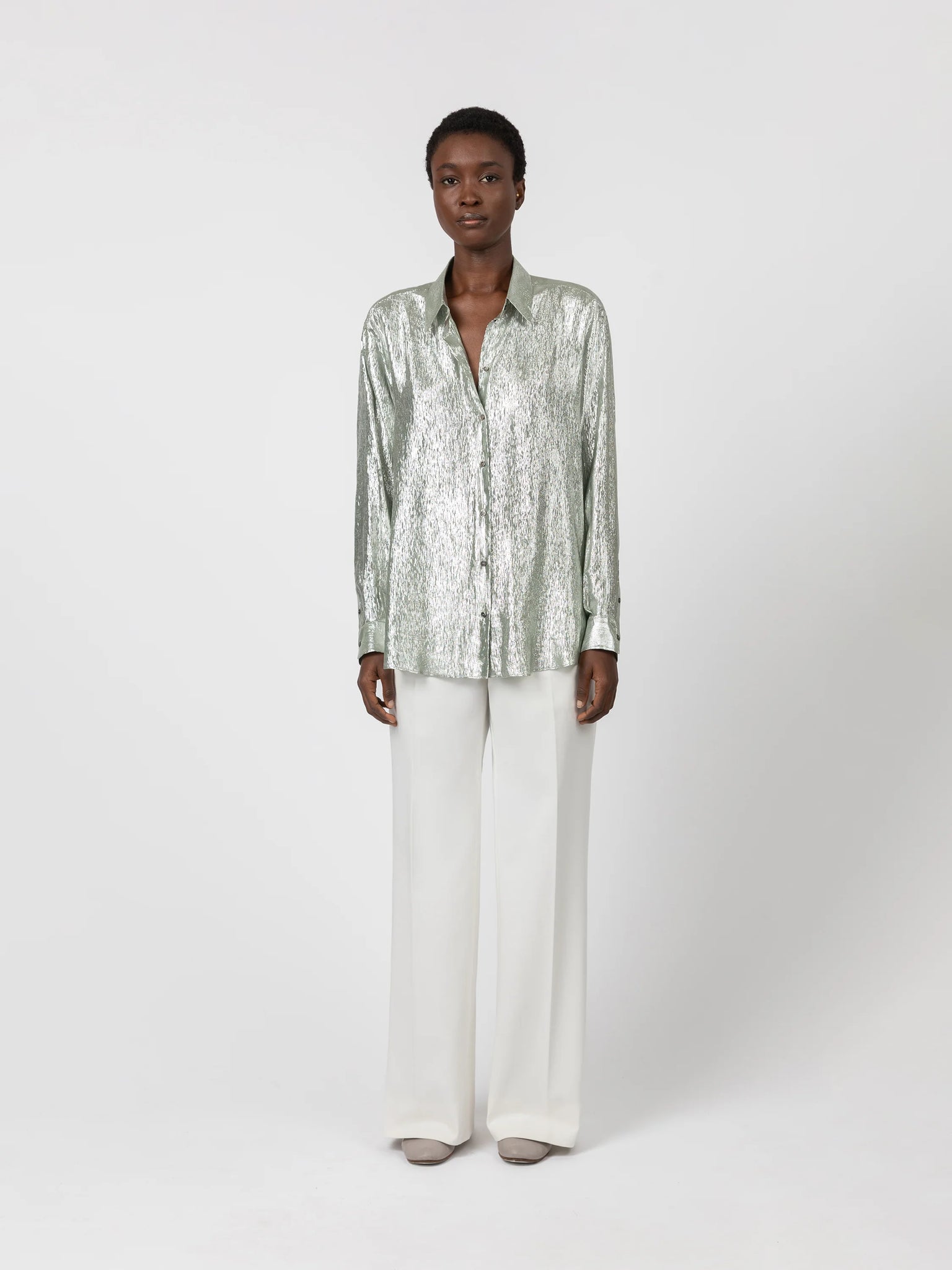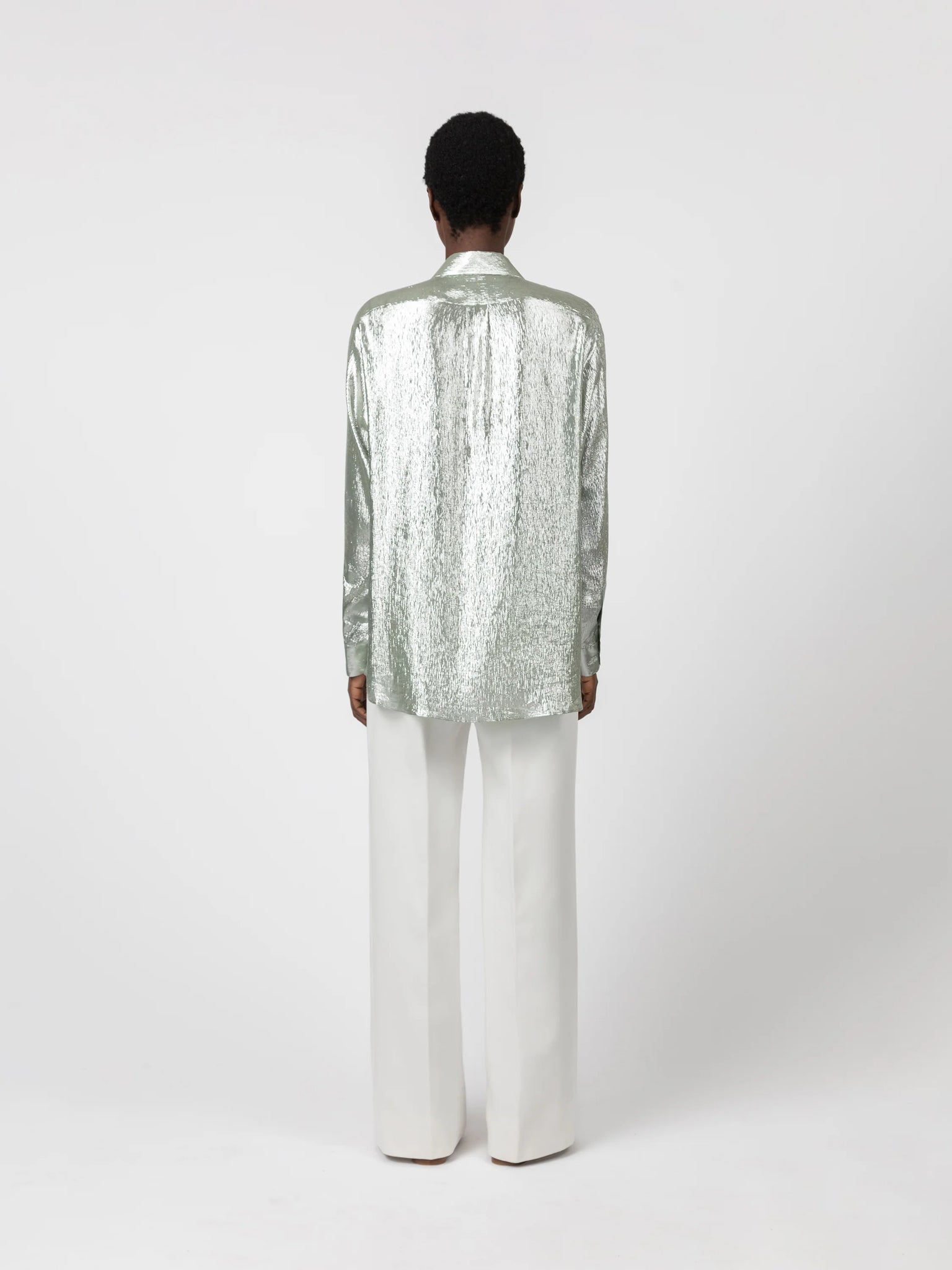 Camisa de seda y lúrex tornasolada en color plata verdosa. Cuello camisero con abotonado delantero, tejido con caída y corte amplio.