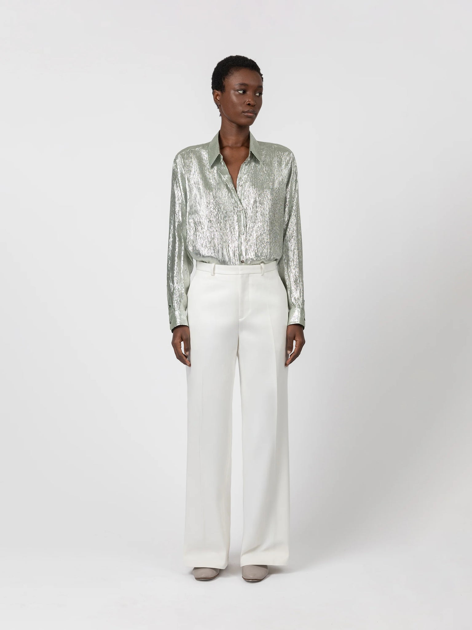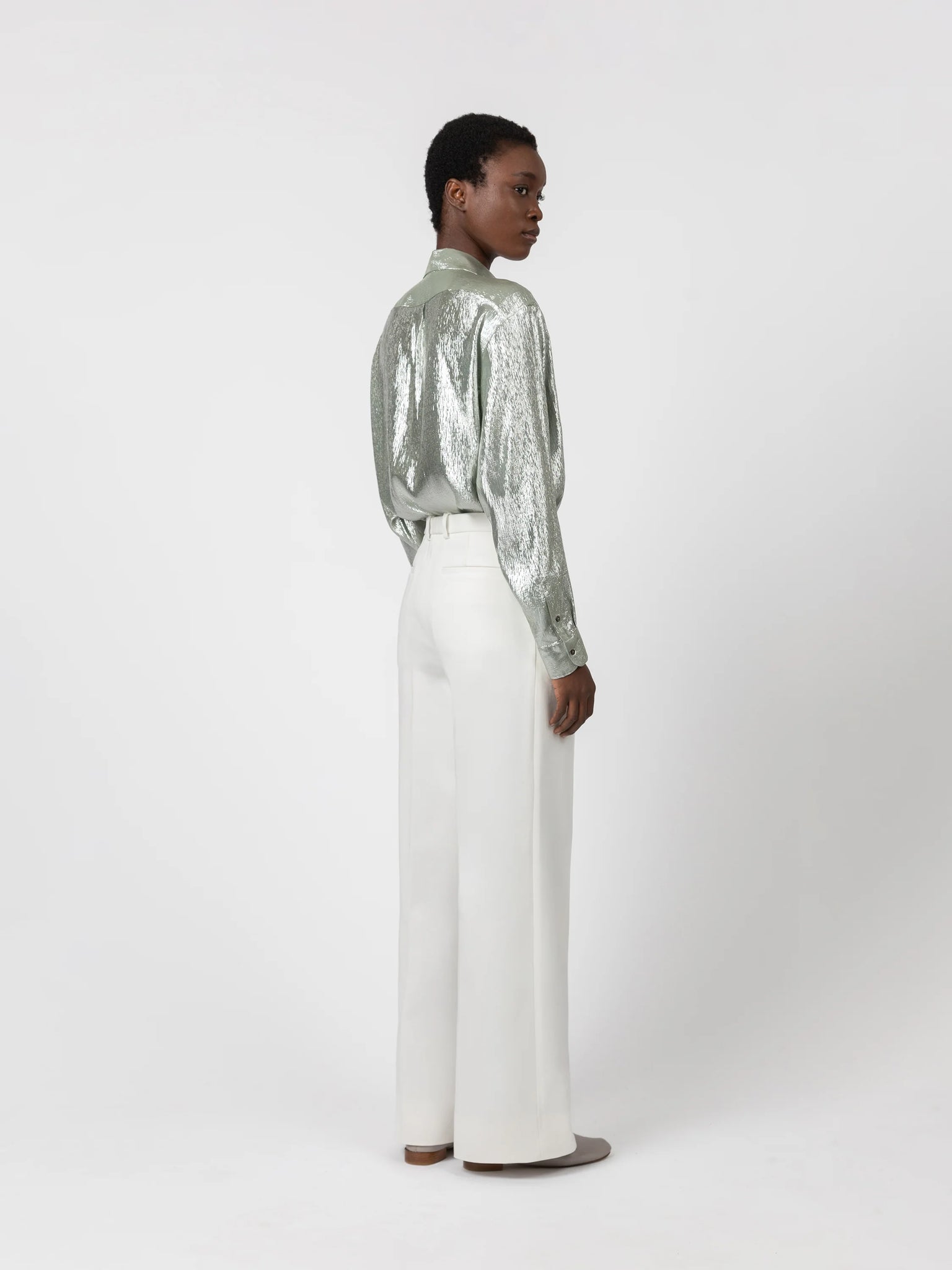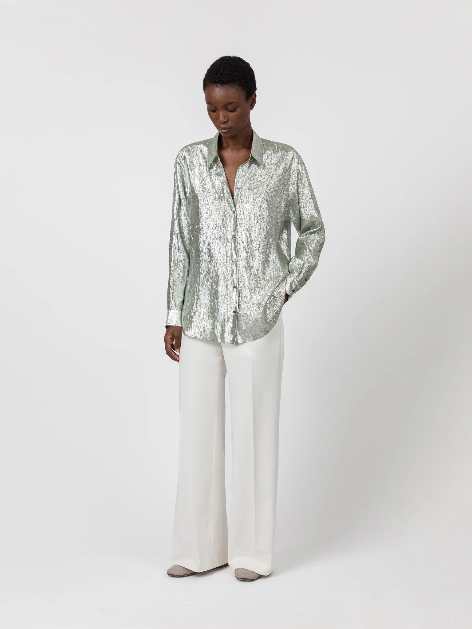 Camisa de seda y lúrex tornasolada en color plata verdosa. Cuello camisero con abotonado delantero, tejido con caída y corte amplio.