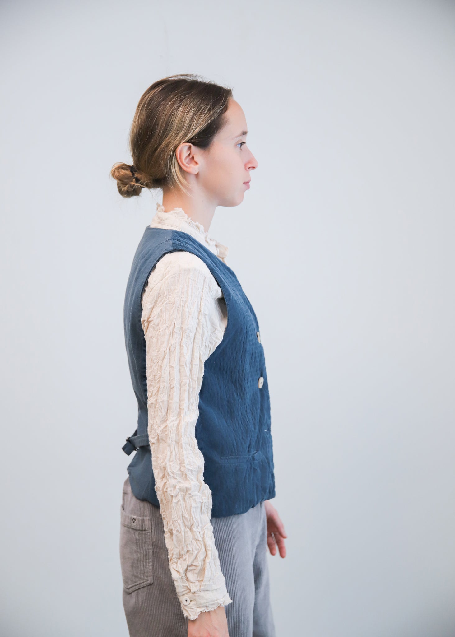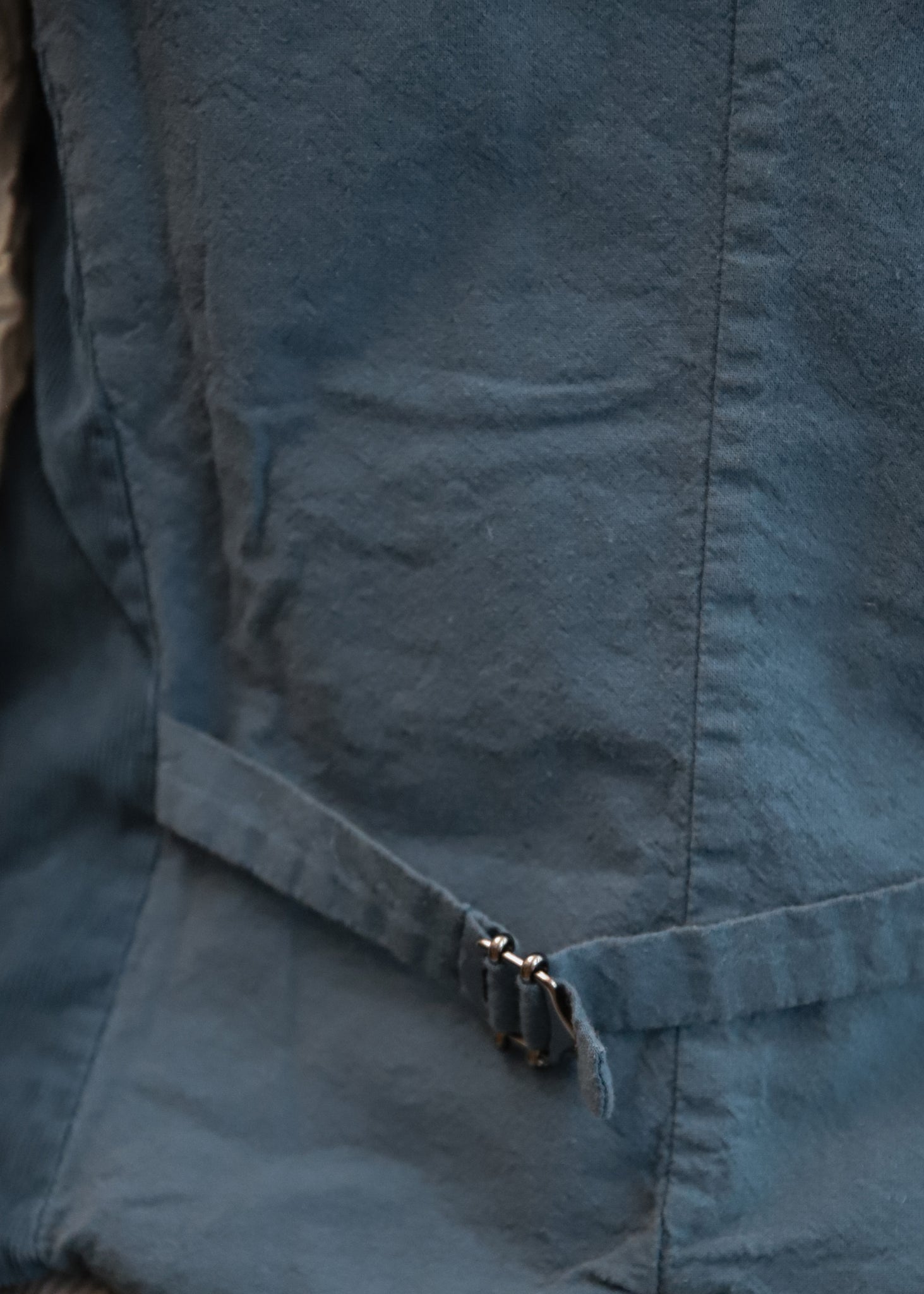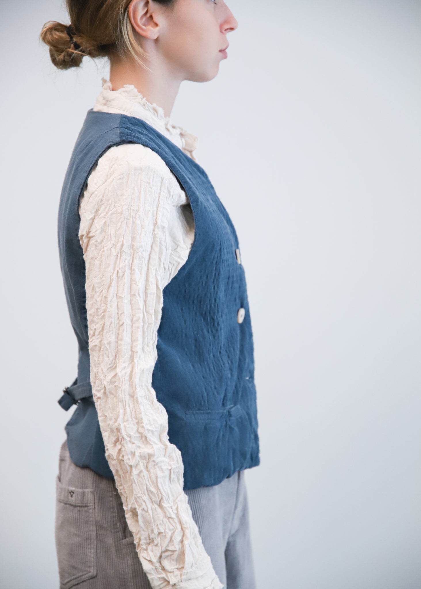 Chaleco de micropana azul. Escote redondo con abotonado y bolsillos delanteros. Trabilla en la espalda para ajustar.