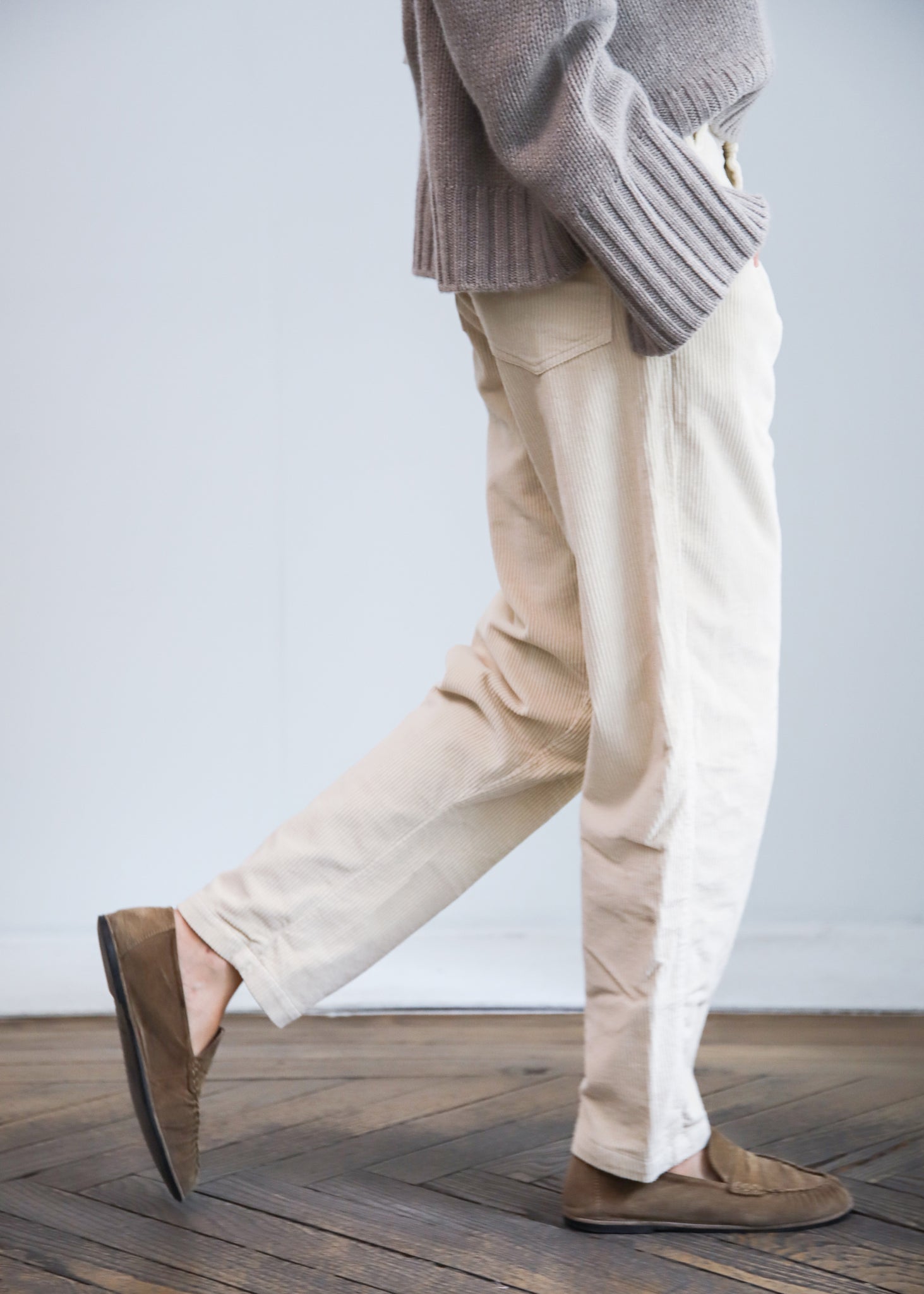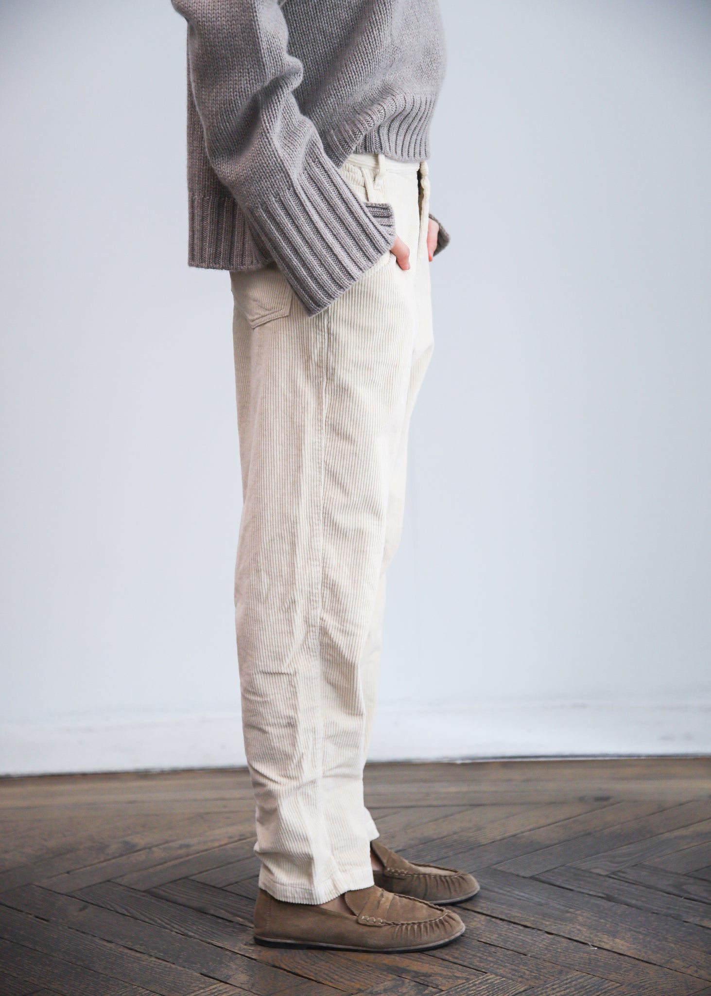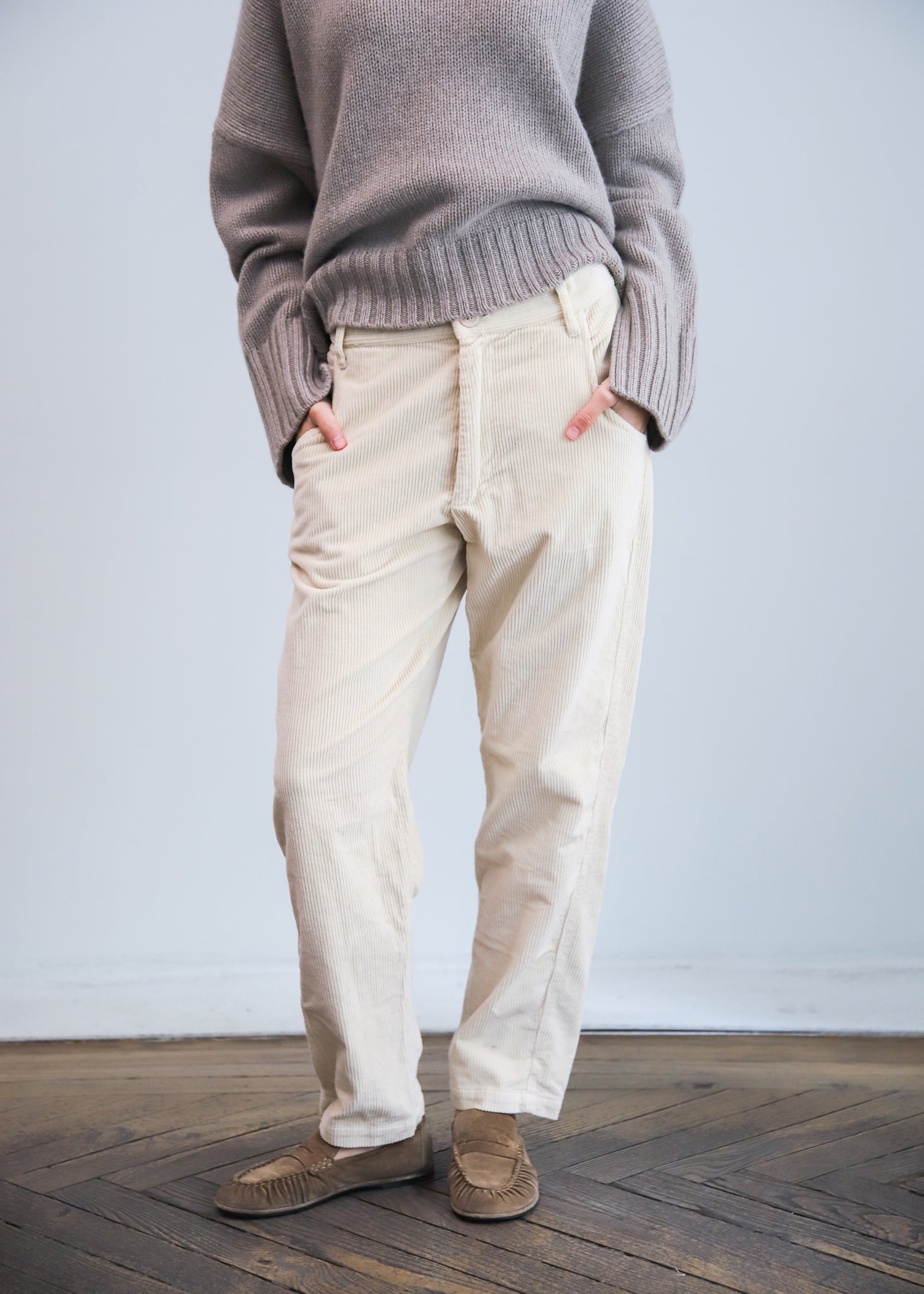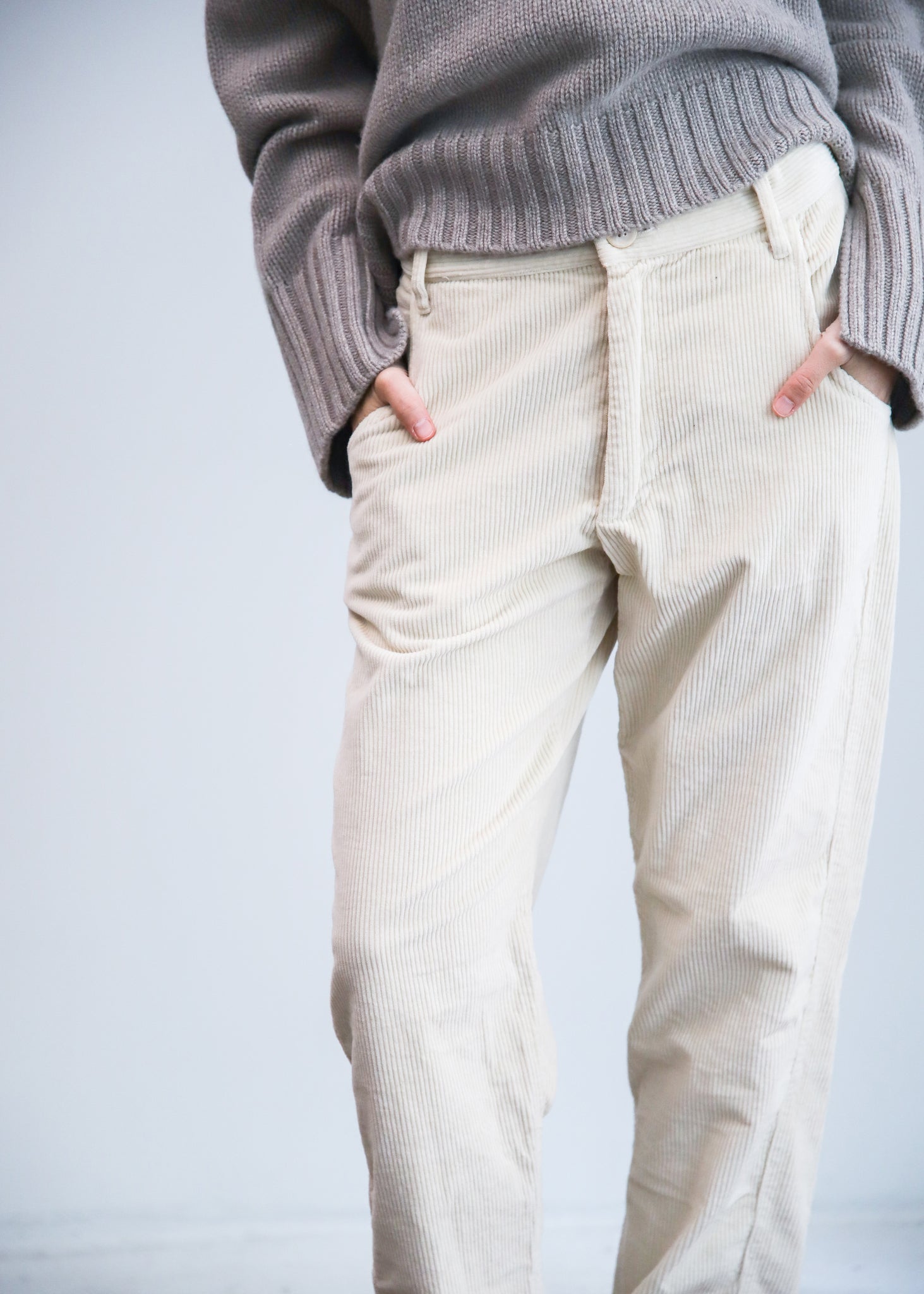 Pantalón de pana gruesa color crudo. Dos bolsillos laterales redondos y dos traseros. Cierre con cremallera y botón.