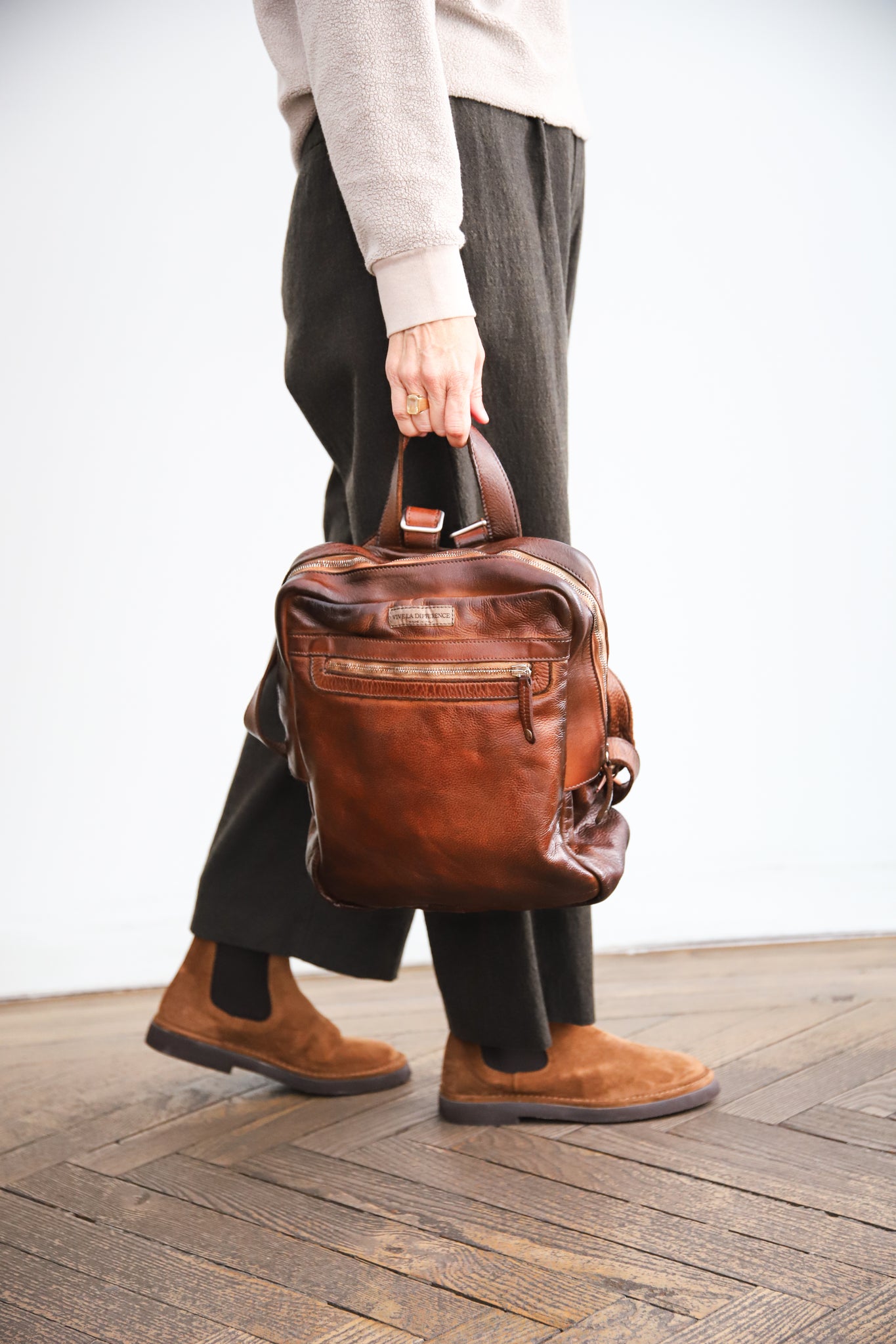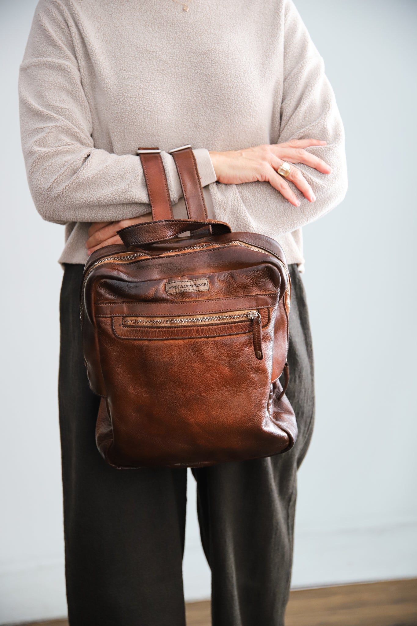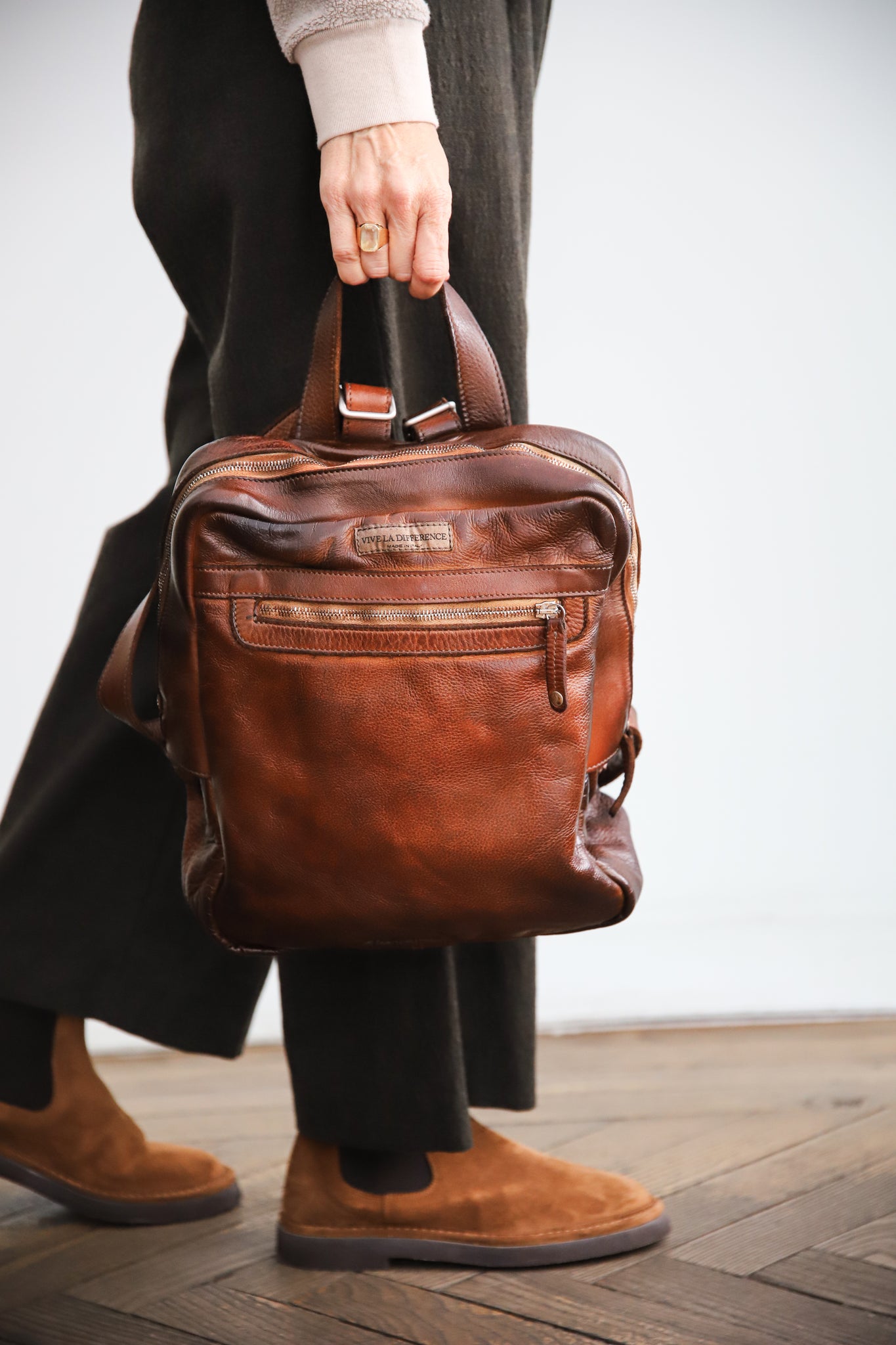 Mochila de piel color castaña. Cierre con cremallera, asa para llevar en la mano. Interior forrado con bolsillo para móvil y bolsillo con cremallera. Un bolsillo exteriore con cremallera.