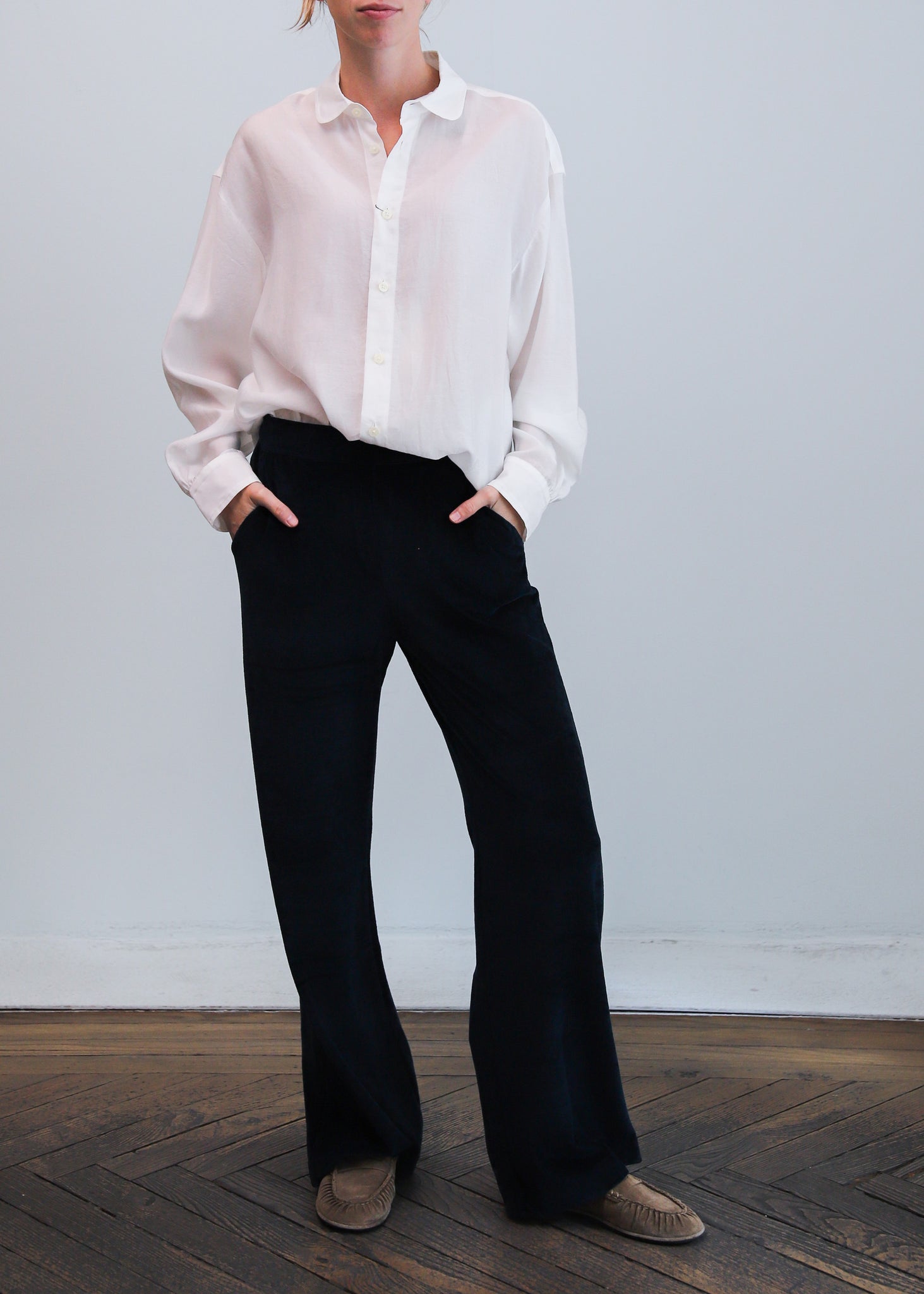 Pantalón de terciopelo de algodón color azul marino. Cintura elástica en la espalda y bolsillos laterales.